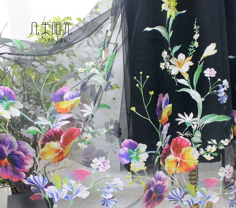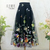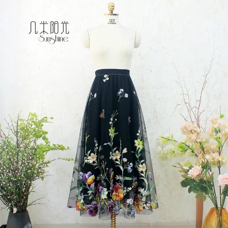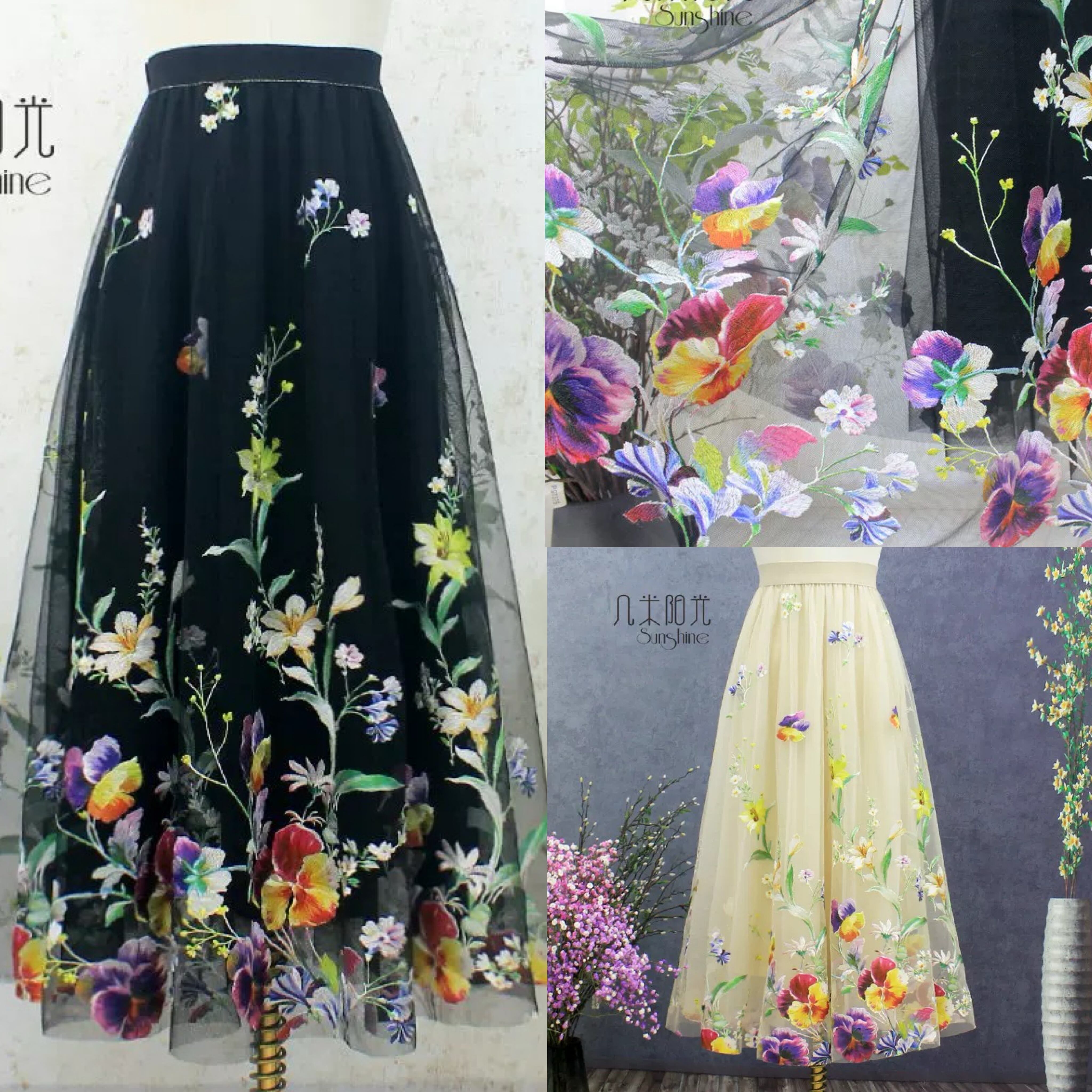 ゴージャス カラフル 刺繍 花束 パーティー 黒 スカート 合わせやすい 和柄 着物 白 オレンジ ボトムス グラデーション 可愛い エレガント ガーリー ふんわり 茶色 フレア 花柄 フラワー パンジー 黒 白