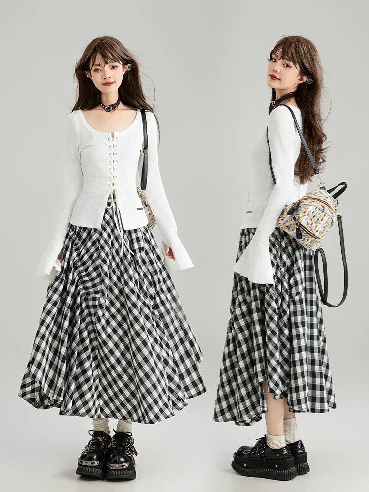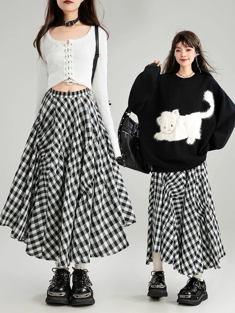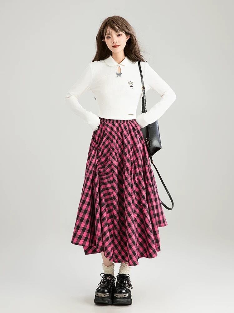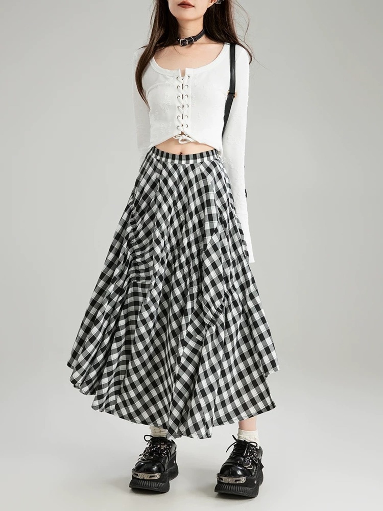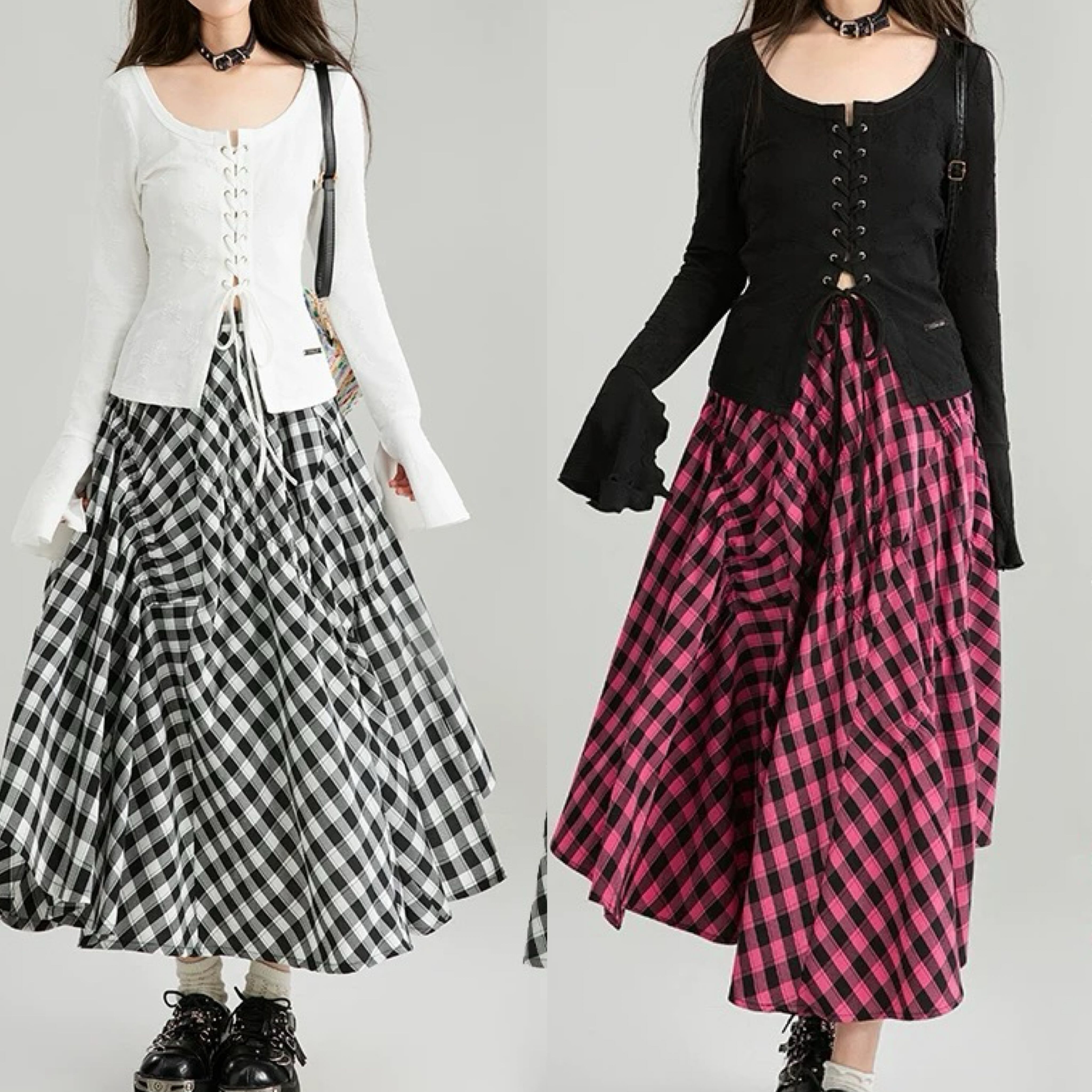 スカート チェック 黒 ピンク 可愛い バルーン シンプル ボトムス マキシ