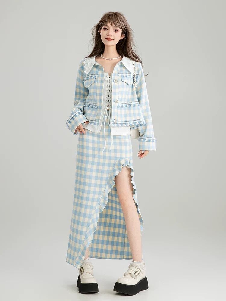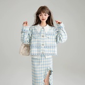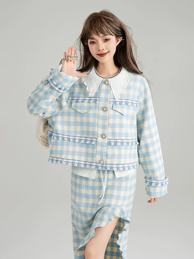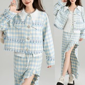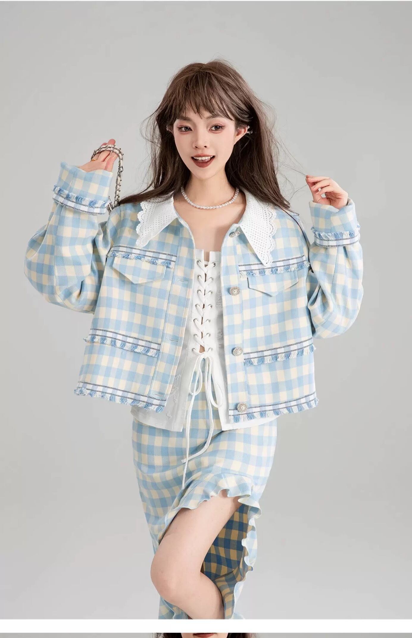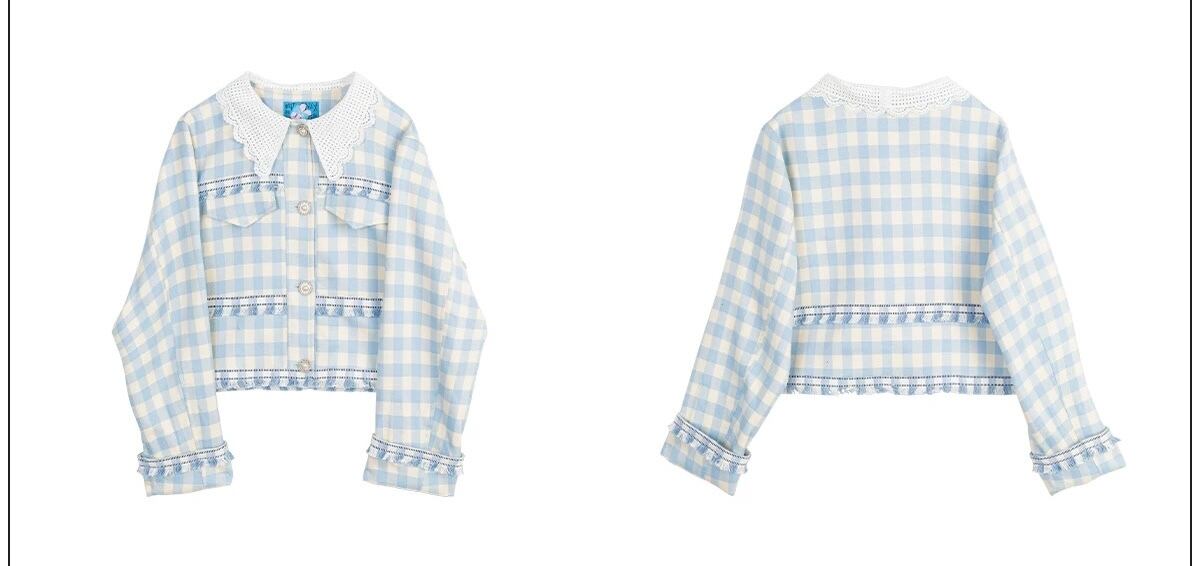 【ジャケット】水色 チェック アウター カーディガン コート ガーリー 可愛い