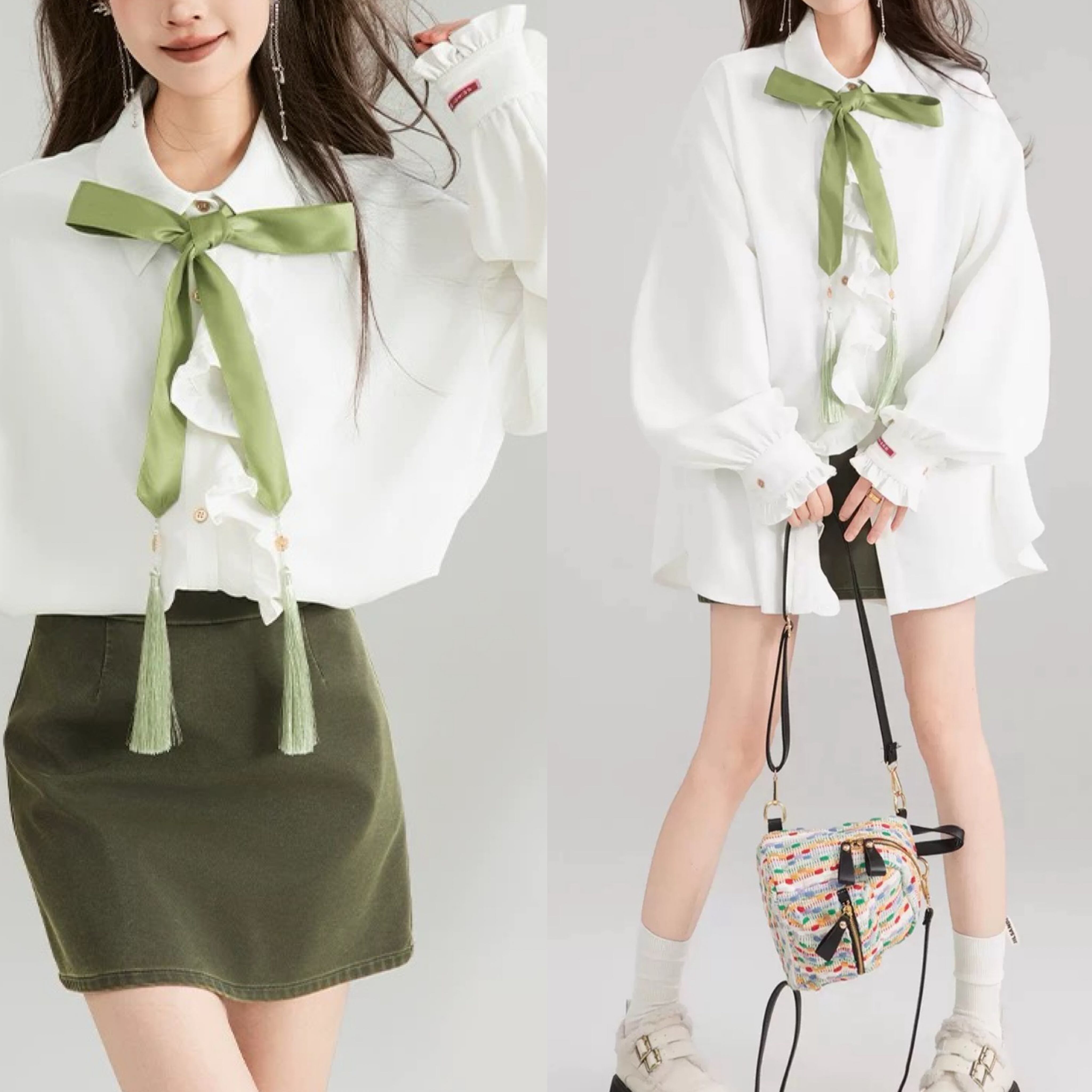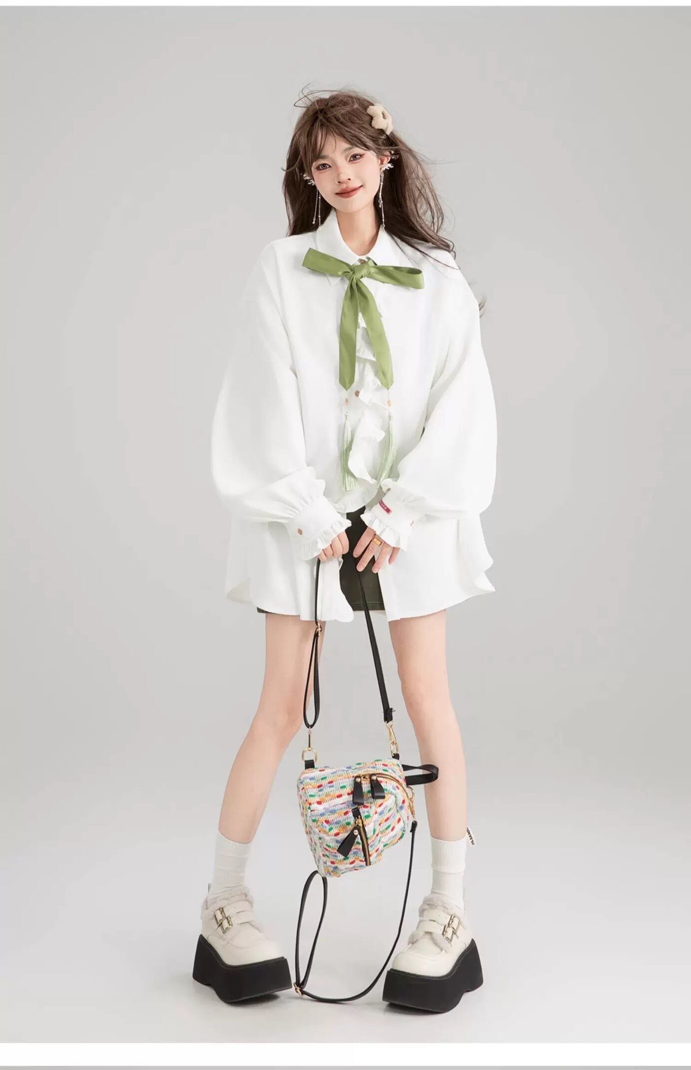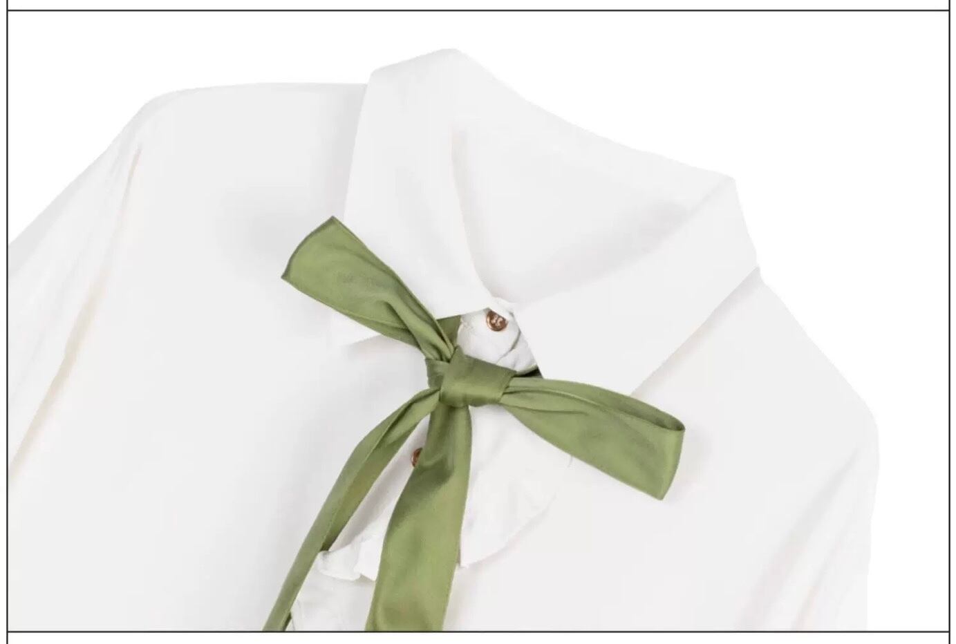 ブラウス 白 緑 リボン ゆったり ガーリー シンプル ワンピース カジュアル