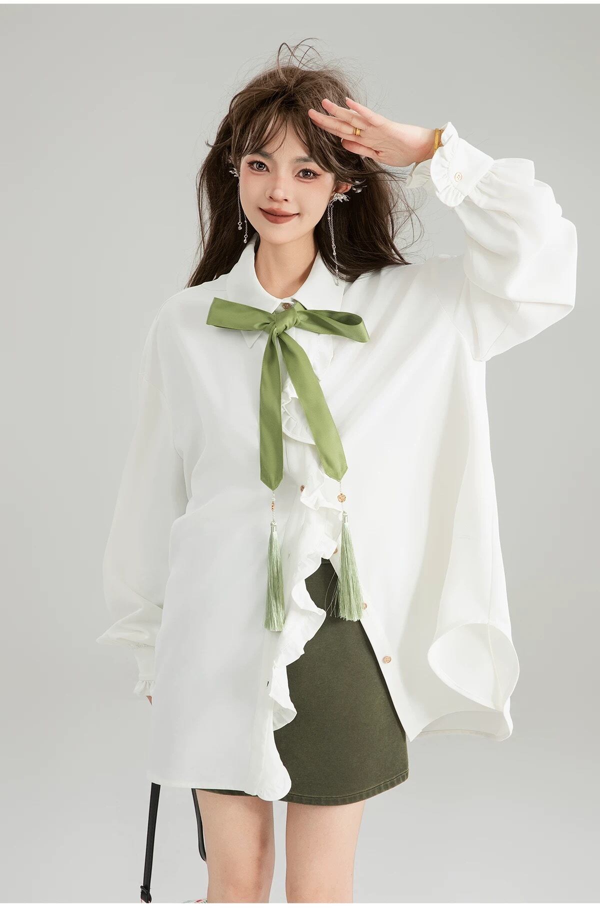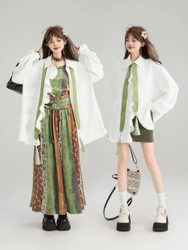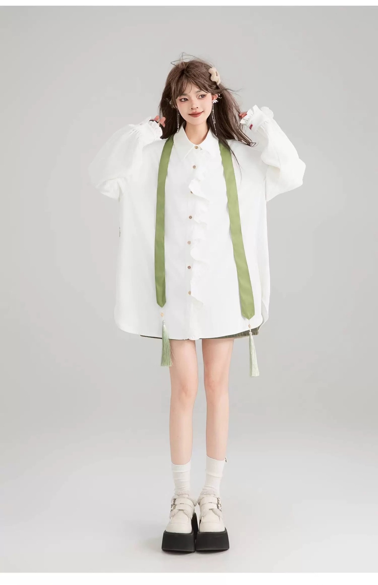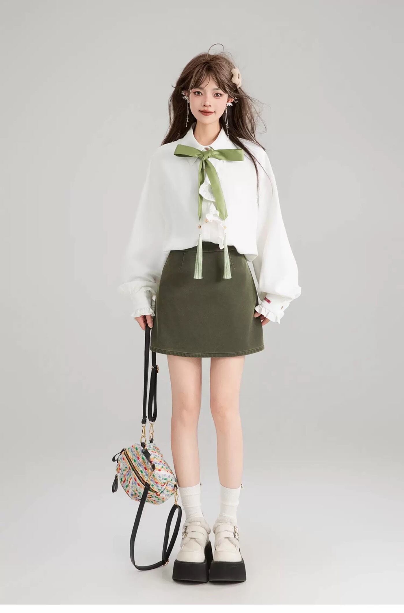 ブラウス 白 緑 リボン ゆったり ガーリー シンプル ワンピース カジュアル