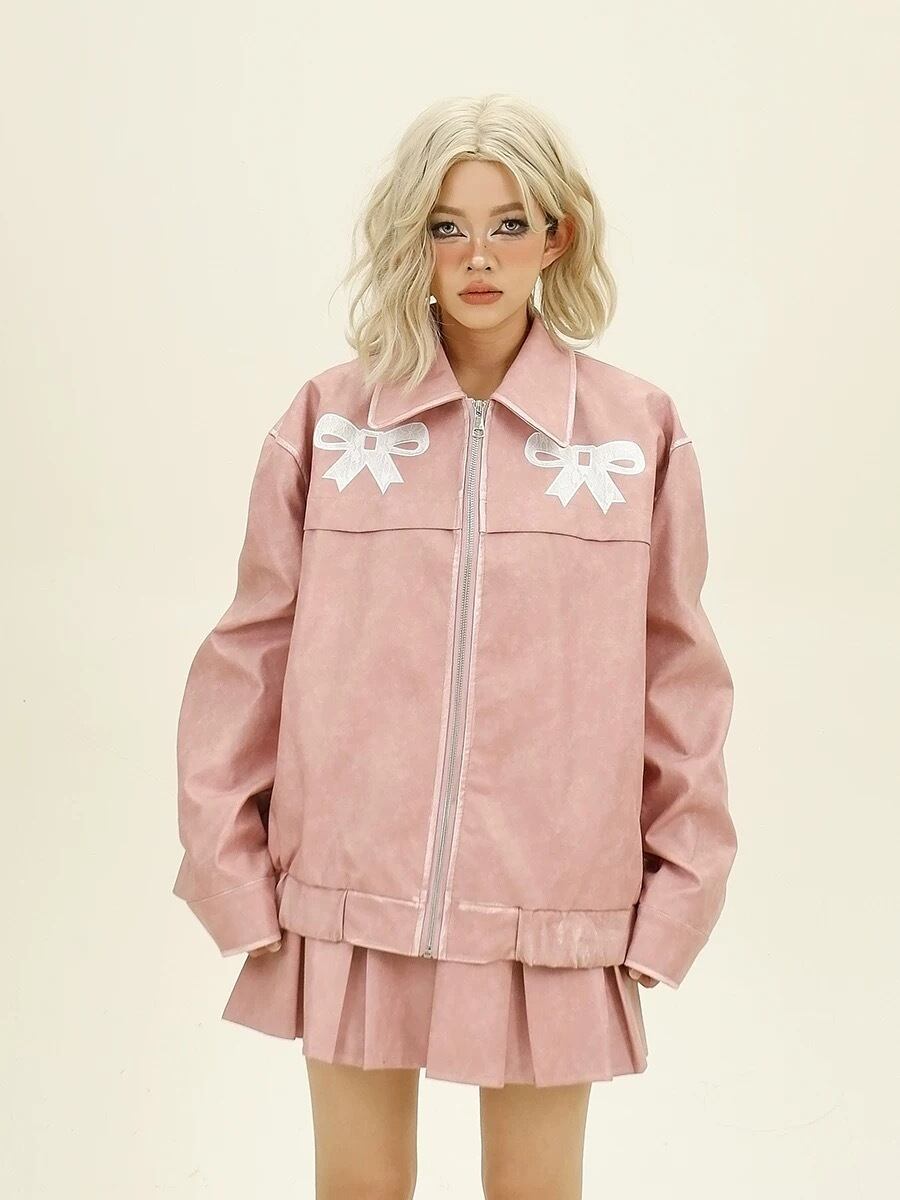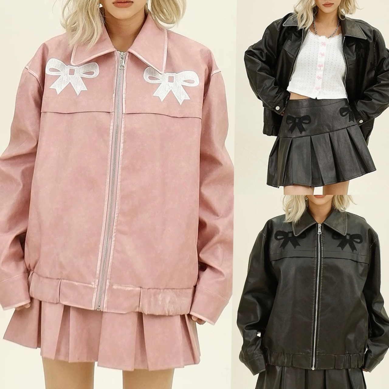 【ジャケット】ピンク 黒 ガーリー リボン 可愛い アウター レザー