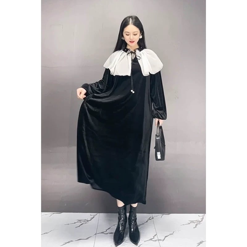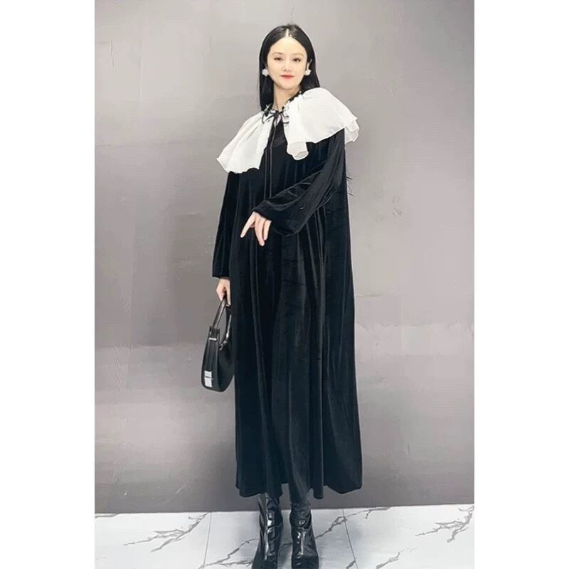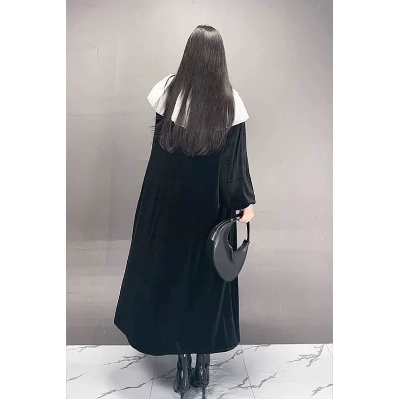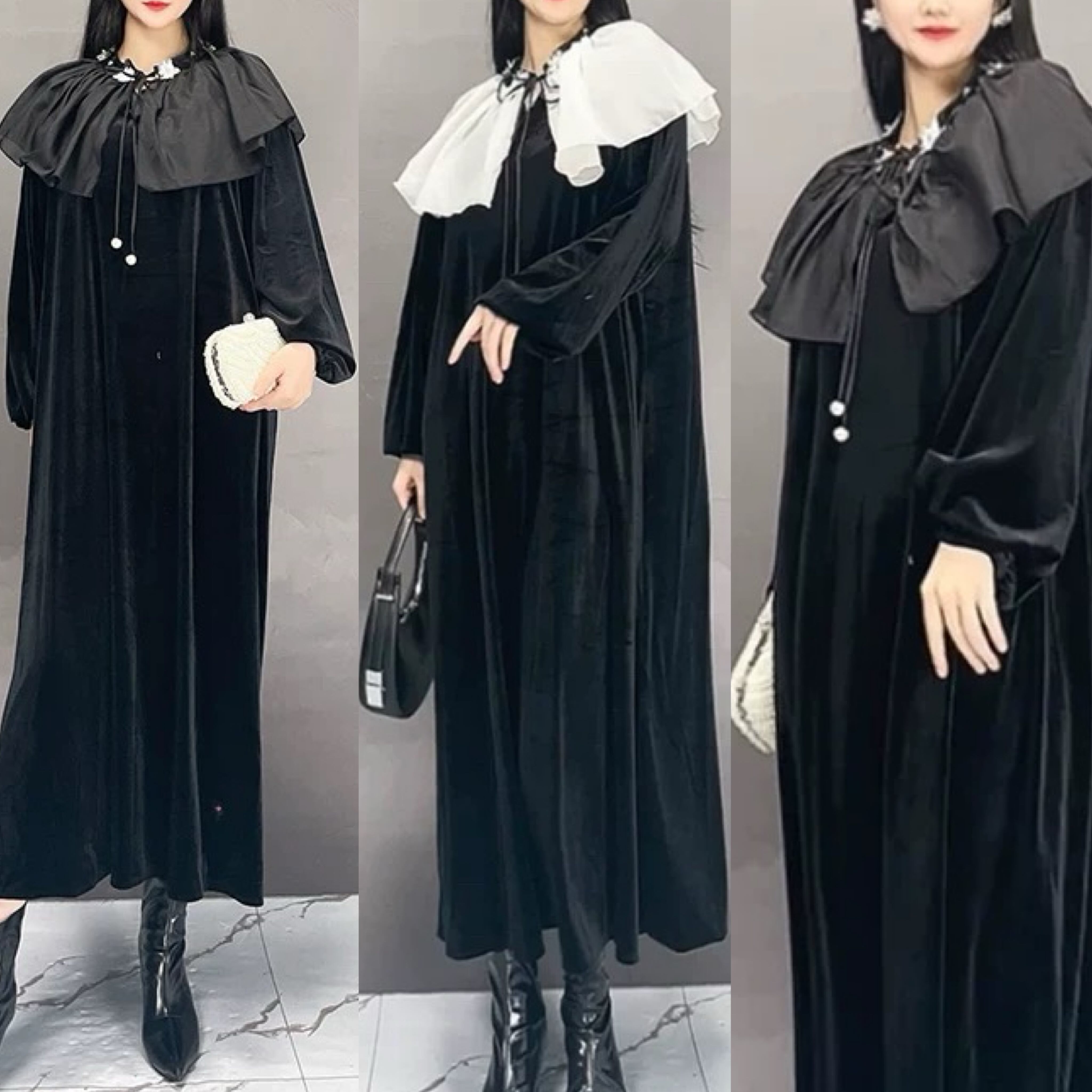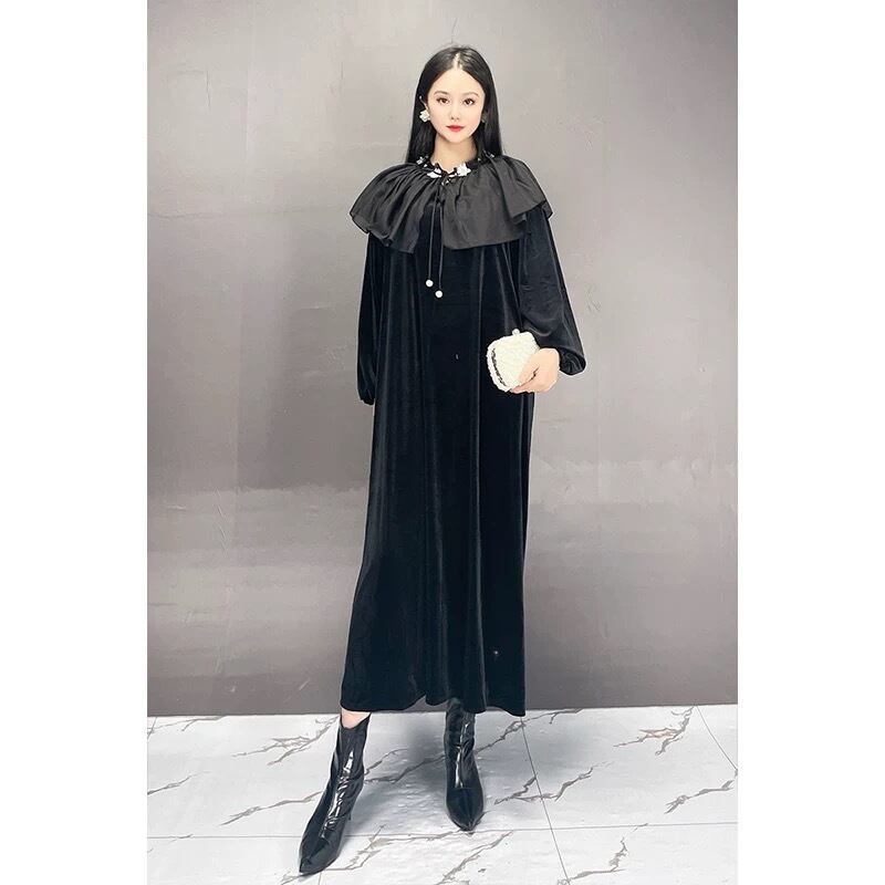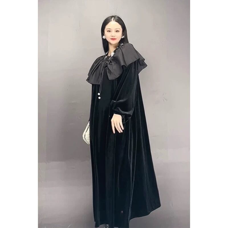 黒 でか襟 ベルベット ブラック ピンク 白 黒 カーディガン ワンピース マキシ ロング ゆったり XL マダム エレガント