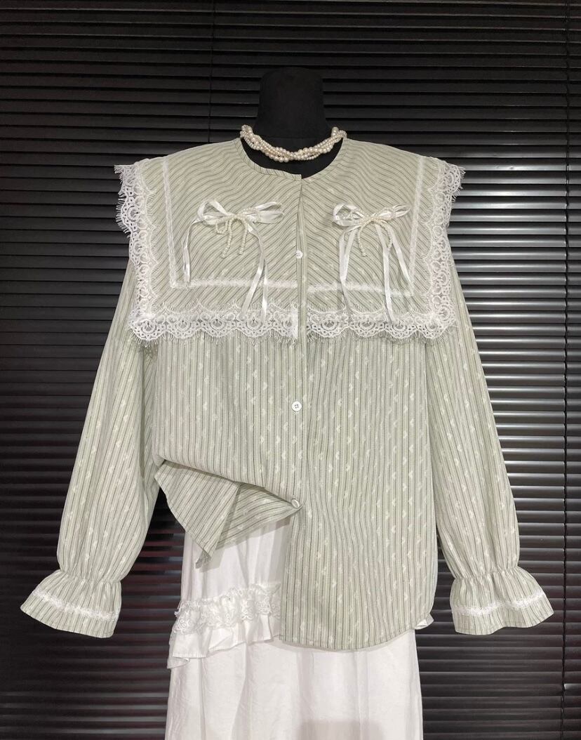ピンク ストライプ リボン 緑 セーラー でか襟 ピンク 白 ブラウス カジュアル 白 ブラウス リボン シンプル カジュアル トップス