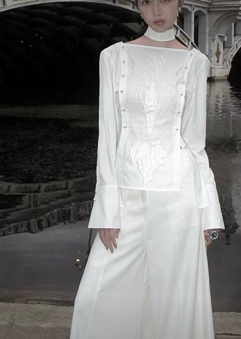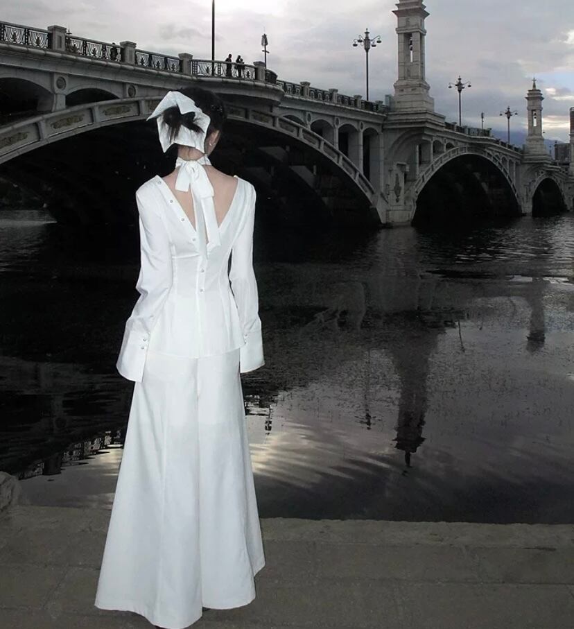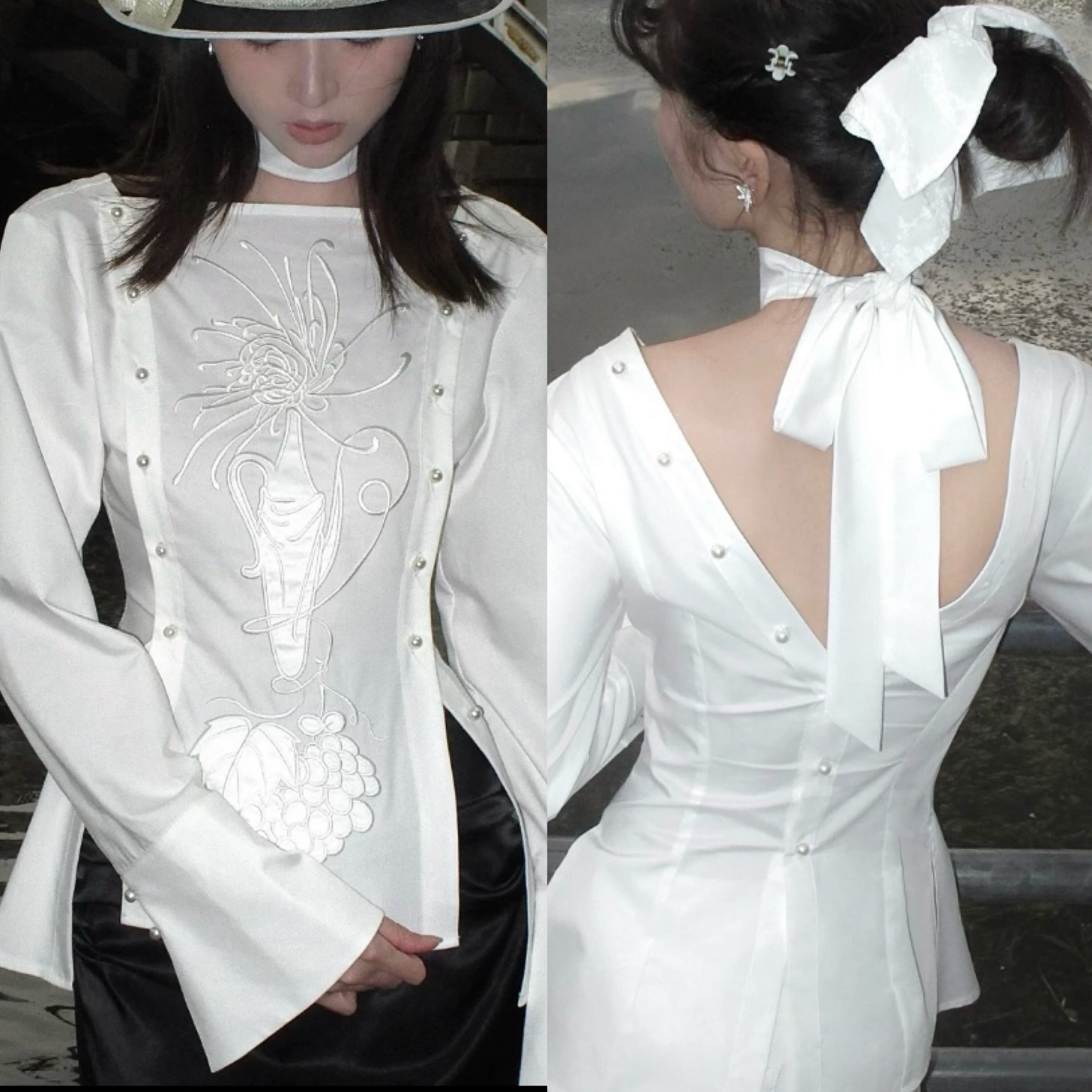 リボン 花柄 クラシック レトロ 白 ホワイト ブラウス シャツ トップス 背中