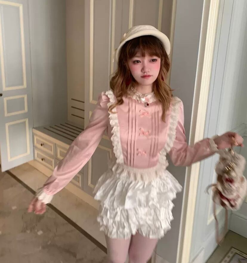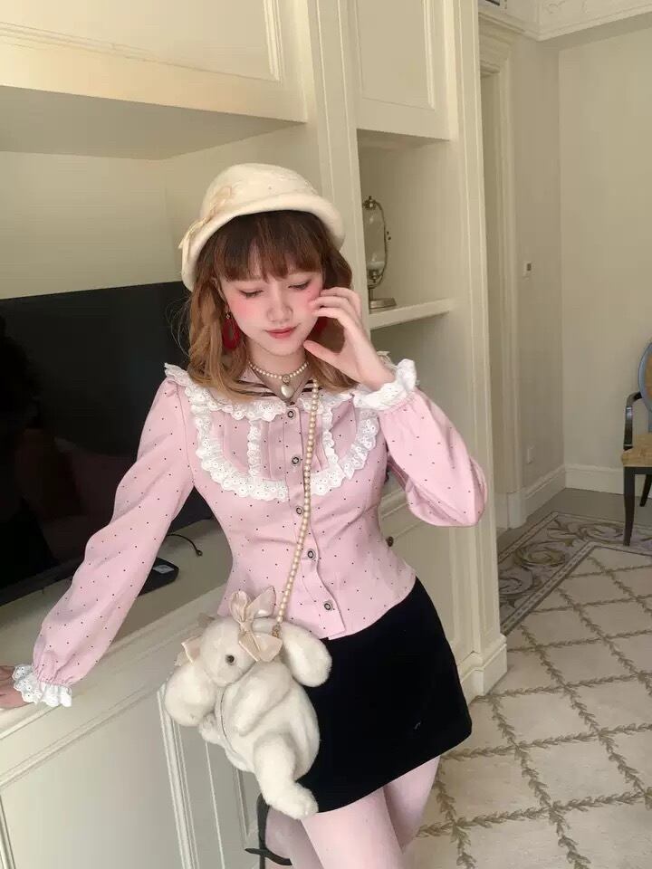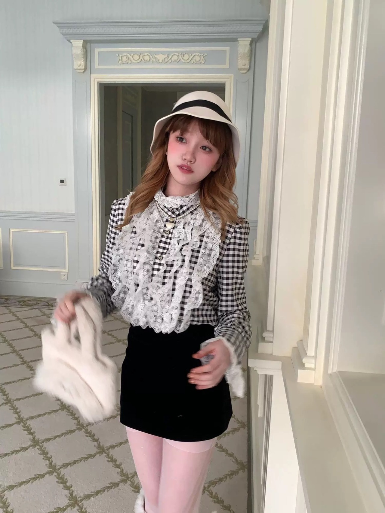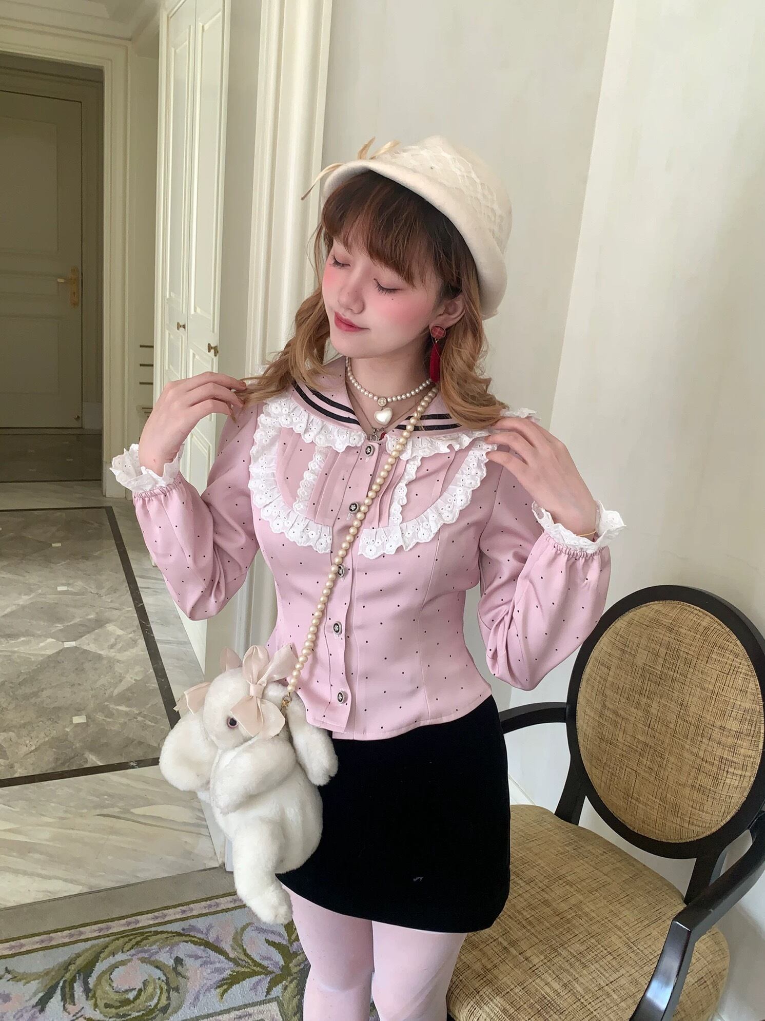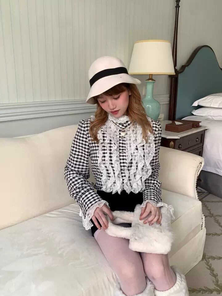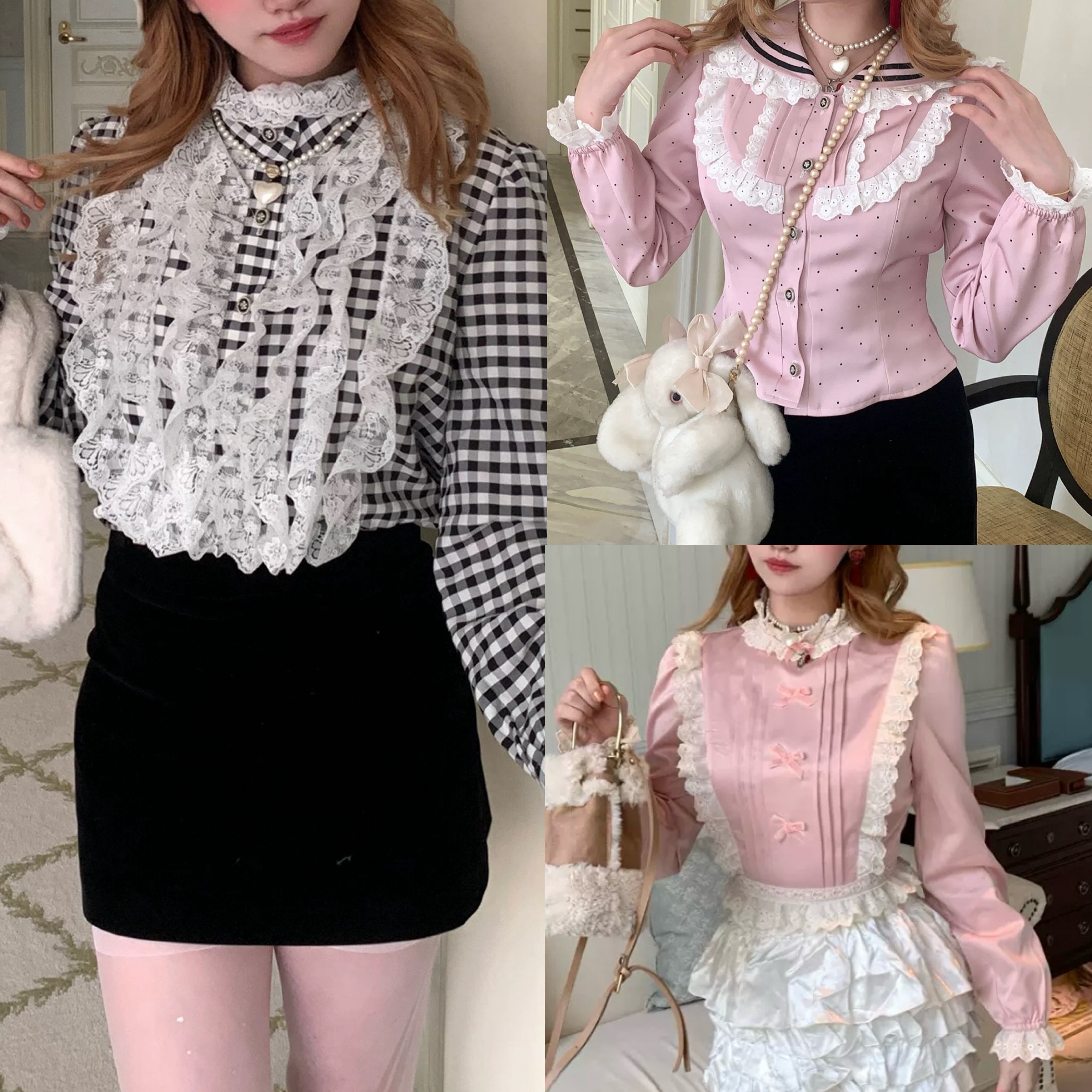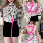 ブラウス ピンク 黒 チェック ガーリー トップス 丸襟