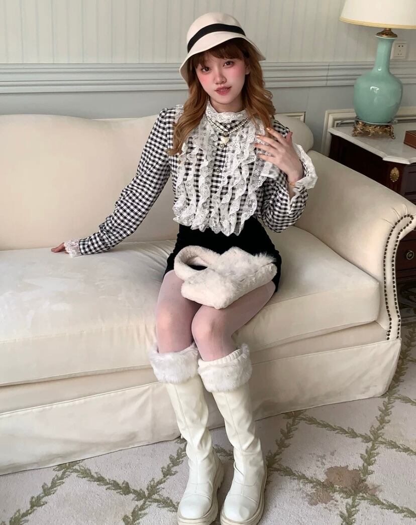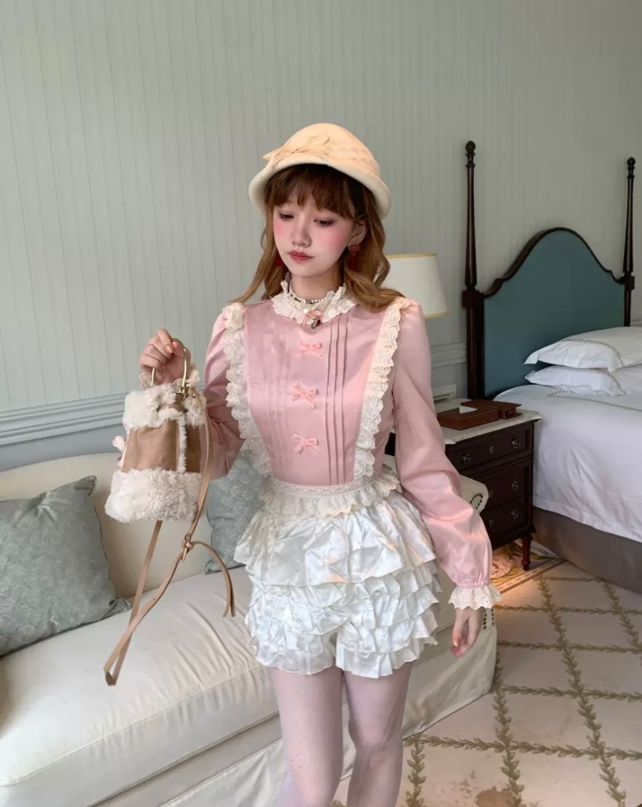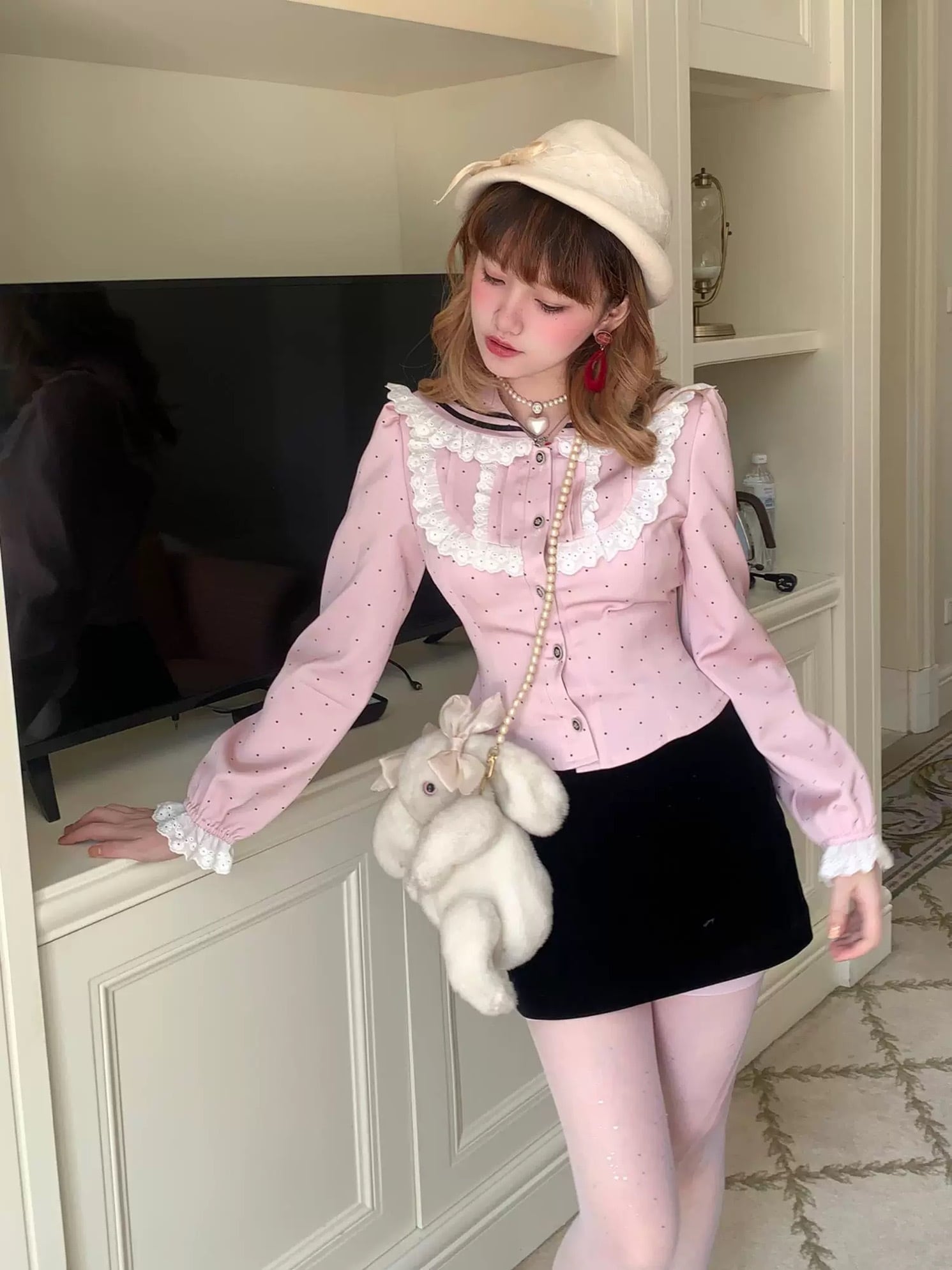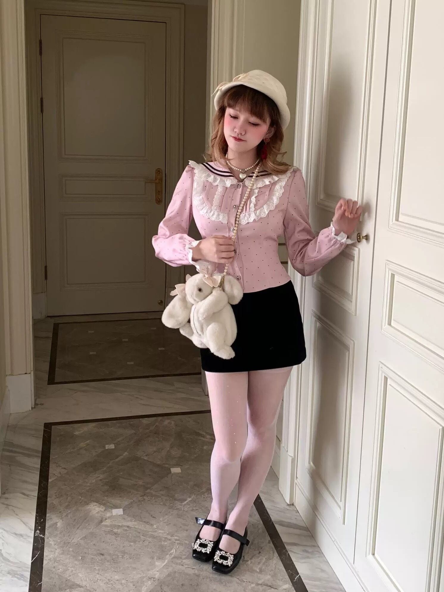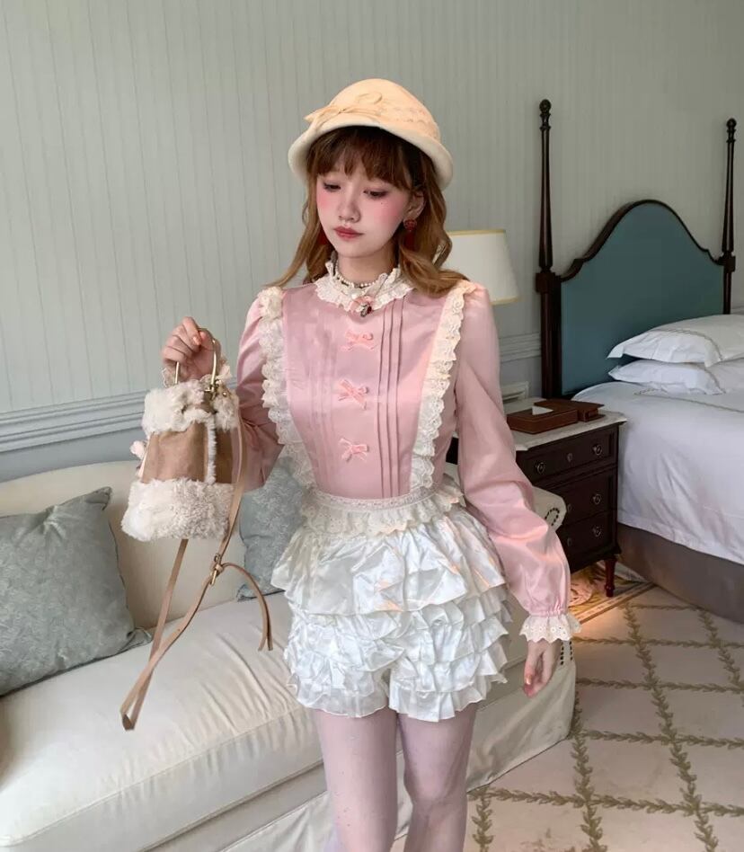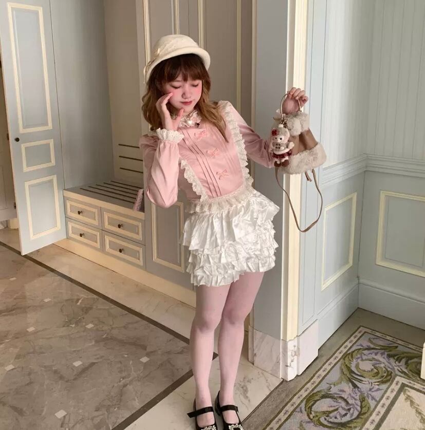 ブラウス ピンク 黒 チェック ガーリー トップス 丸襟