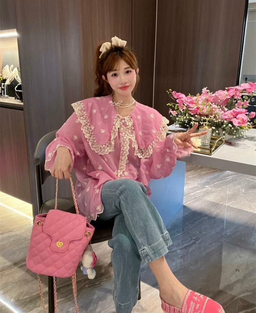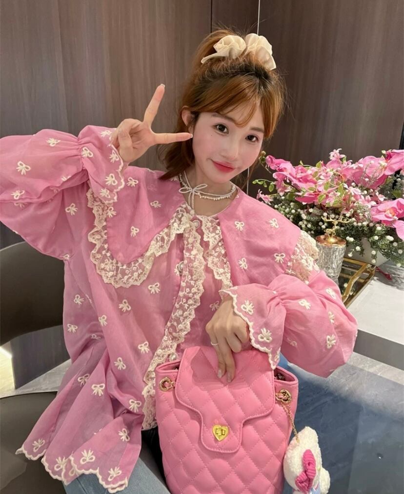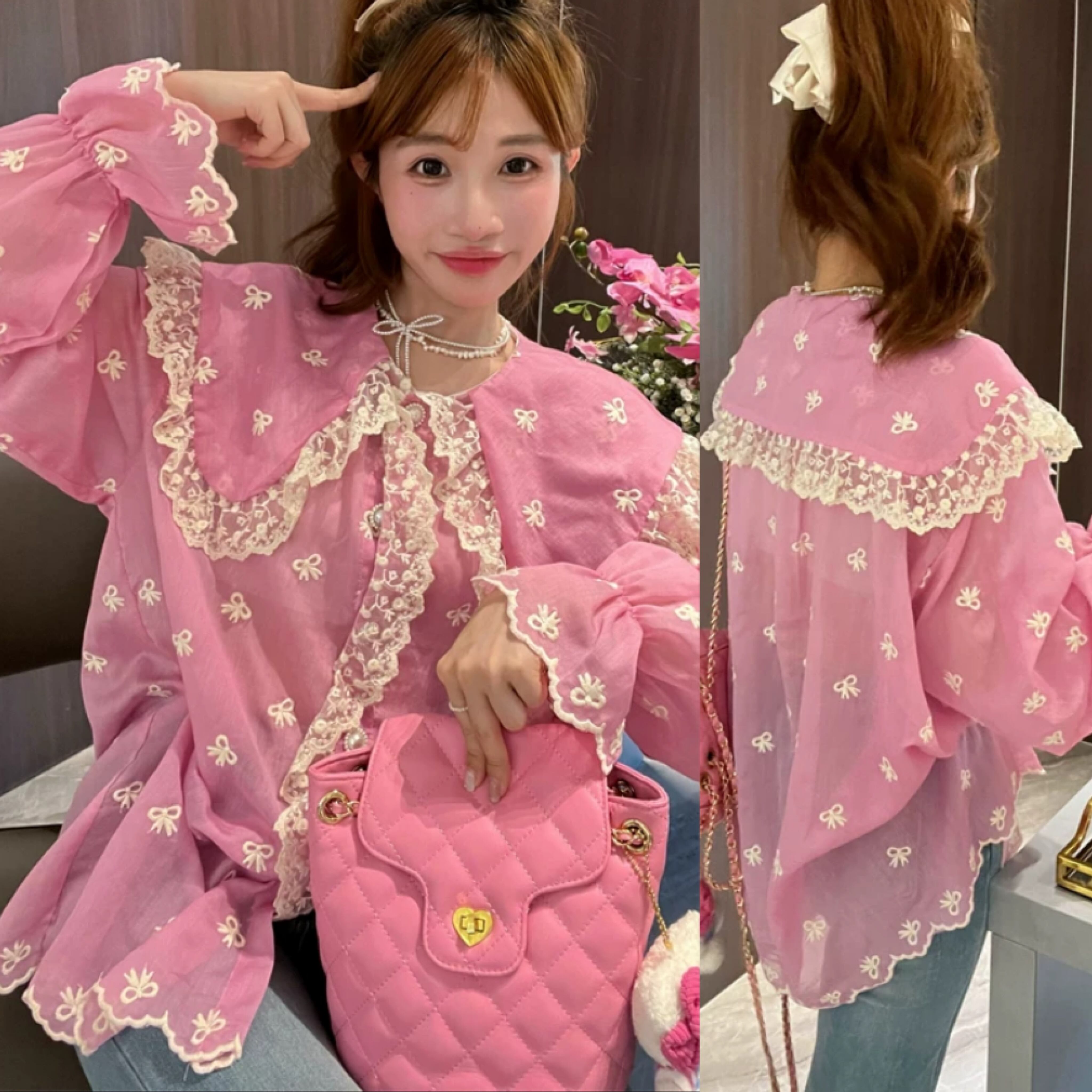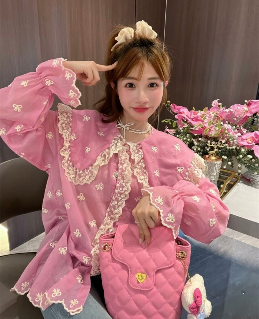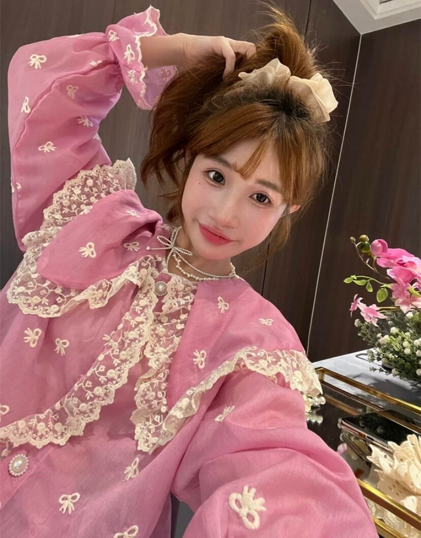 可愛い ピンク ブラウス 丸襟 花柄