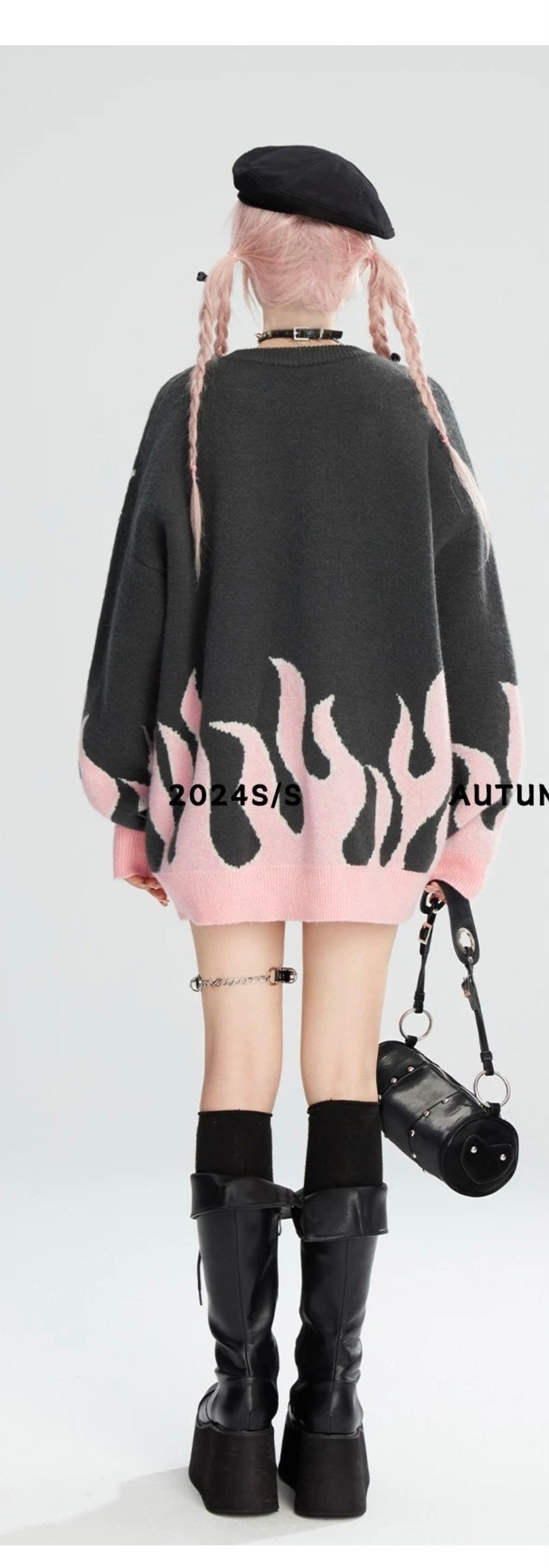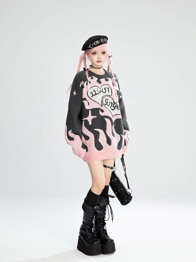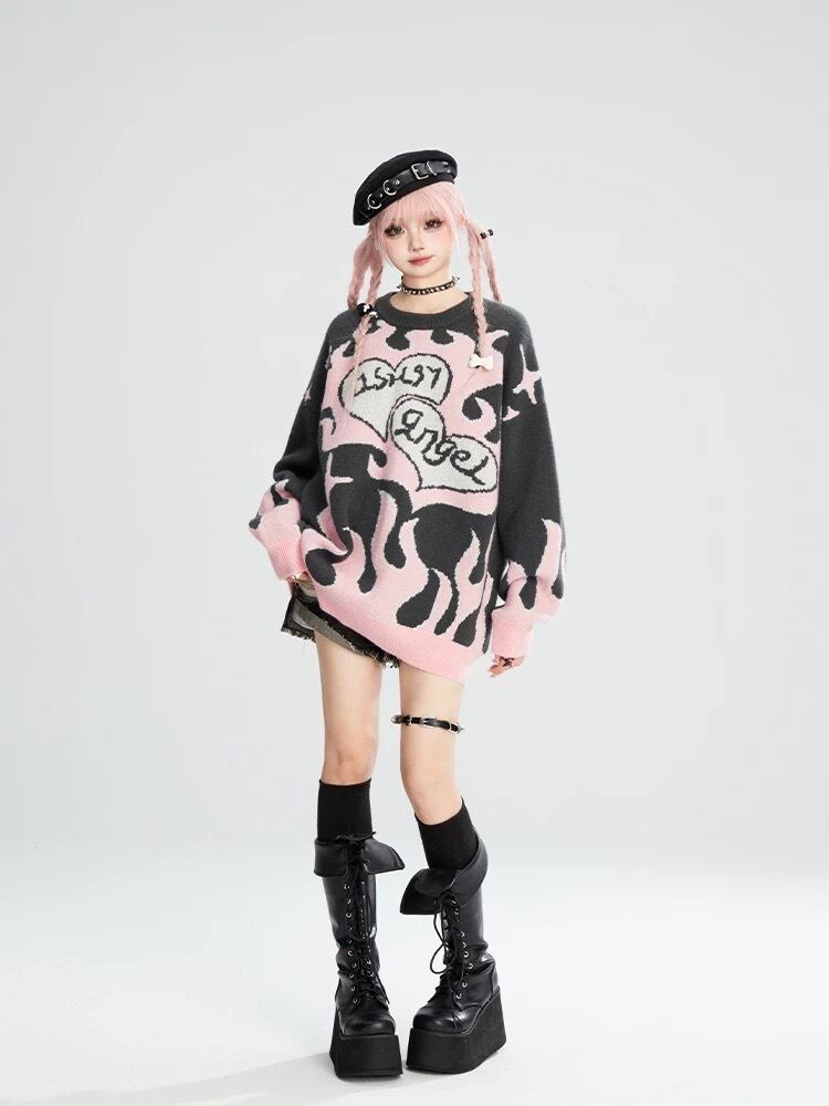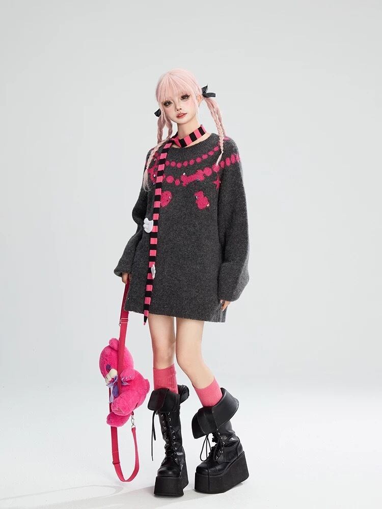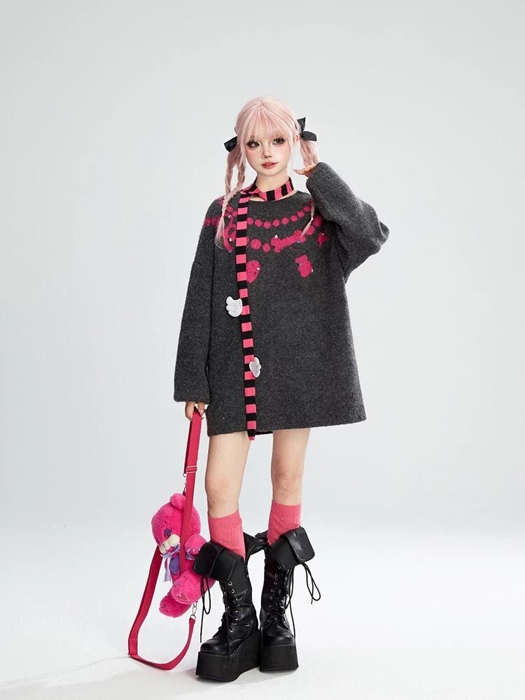 グレー ピンク ハート リボン セーター