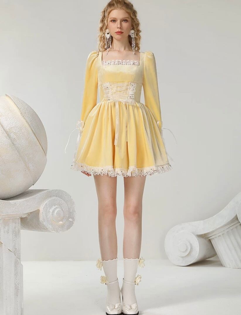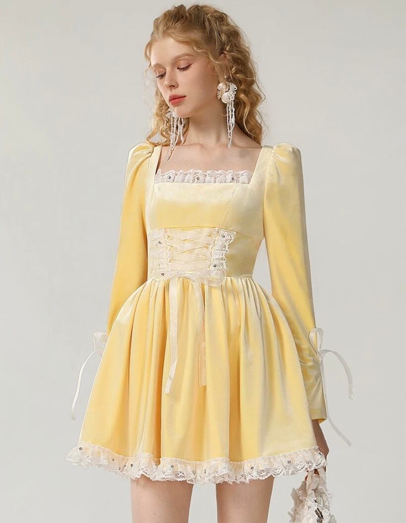 黄色 リボン 可愛い ワンピース ベロア ベルベット