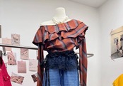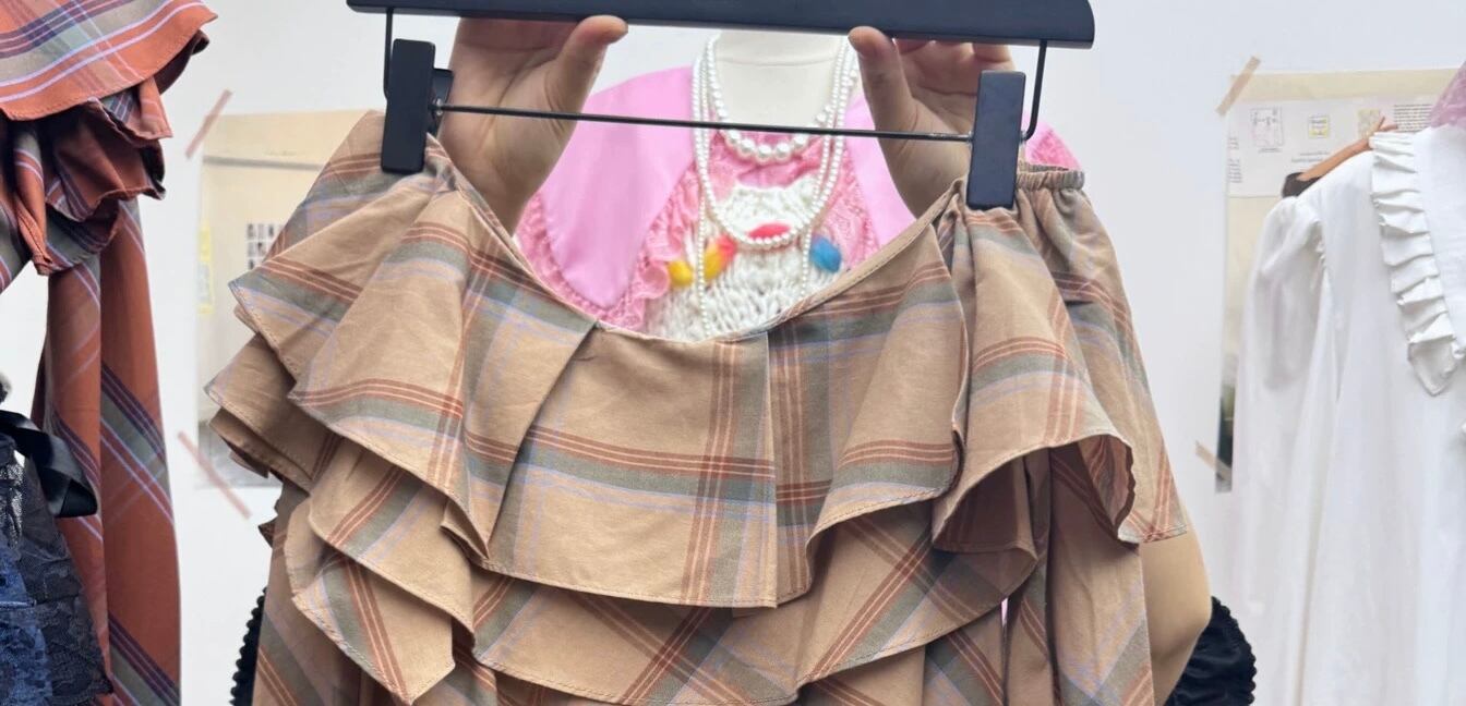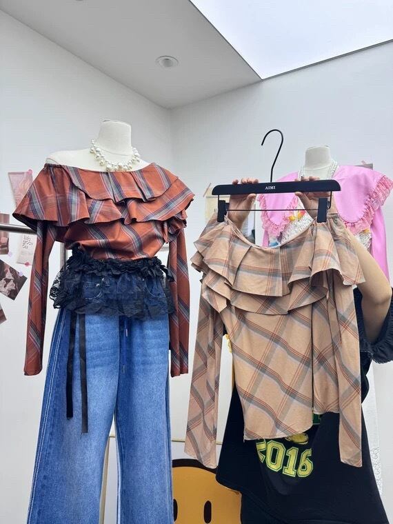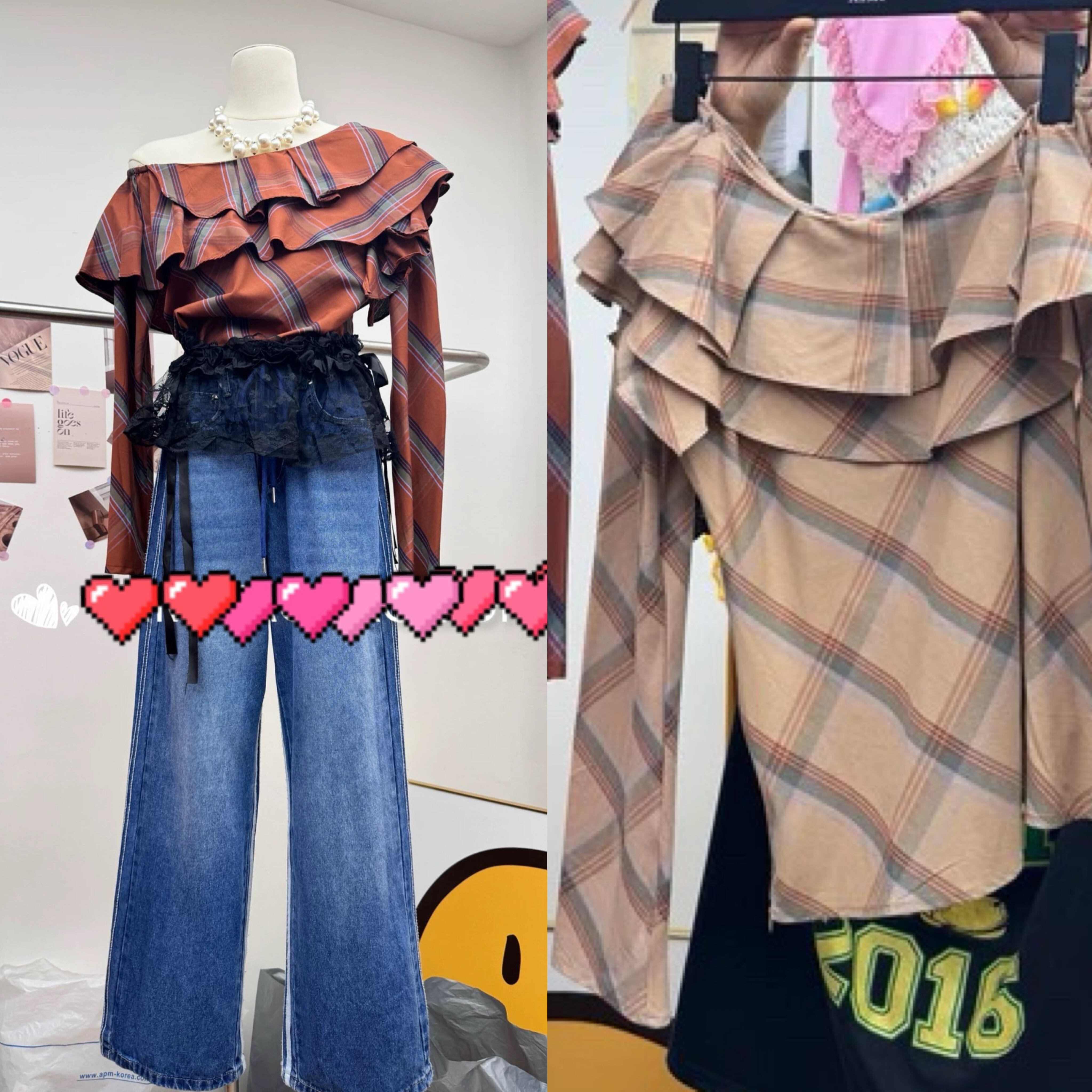 オフショルダー ベージュ 茶色 チェック ブラウス