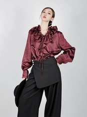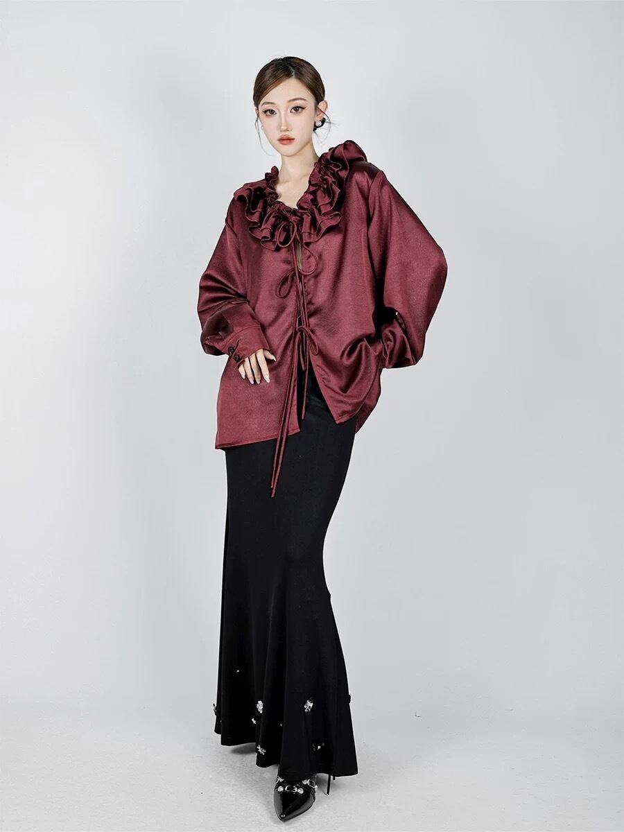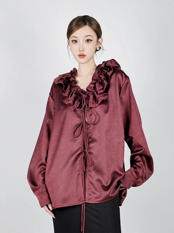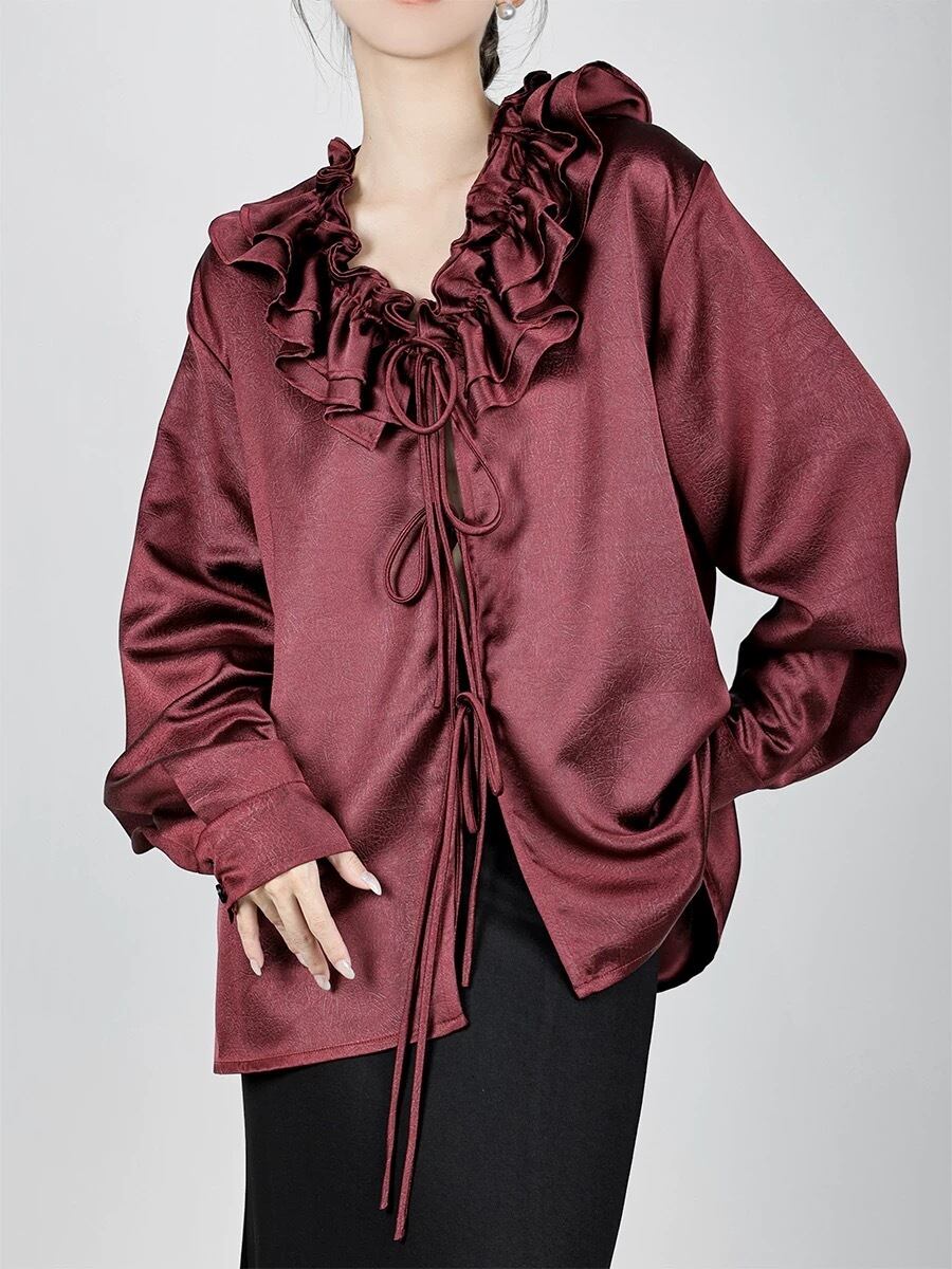 ブラウス フリル 茶色 リボン トップス
