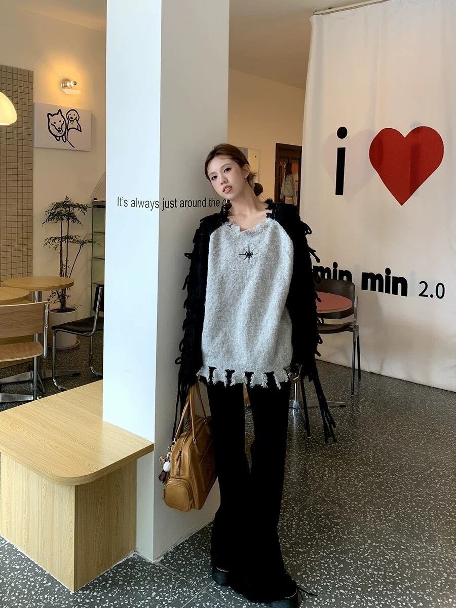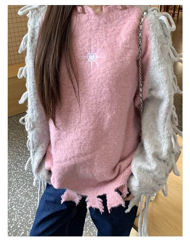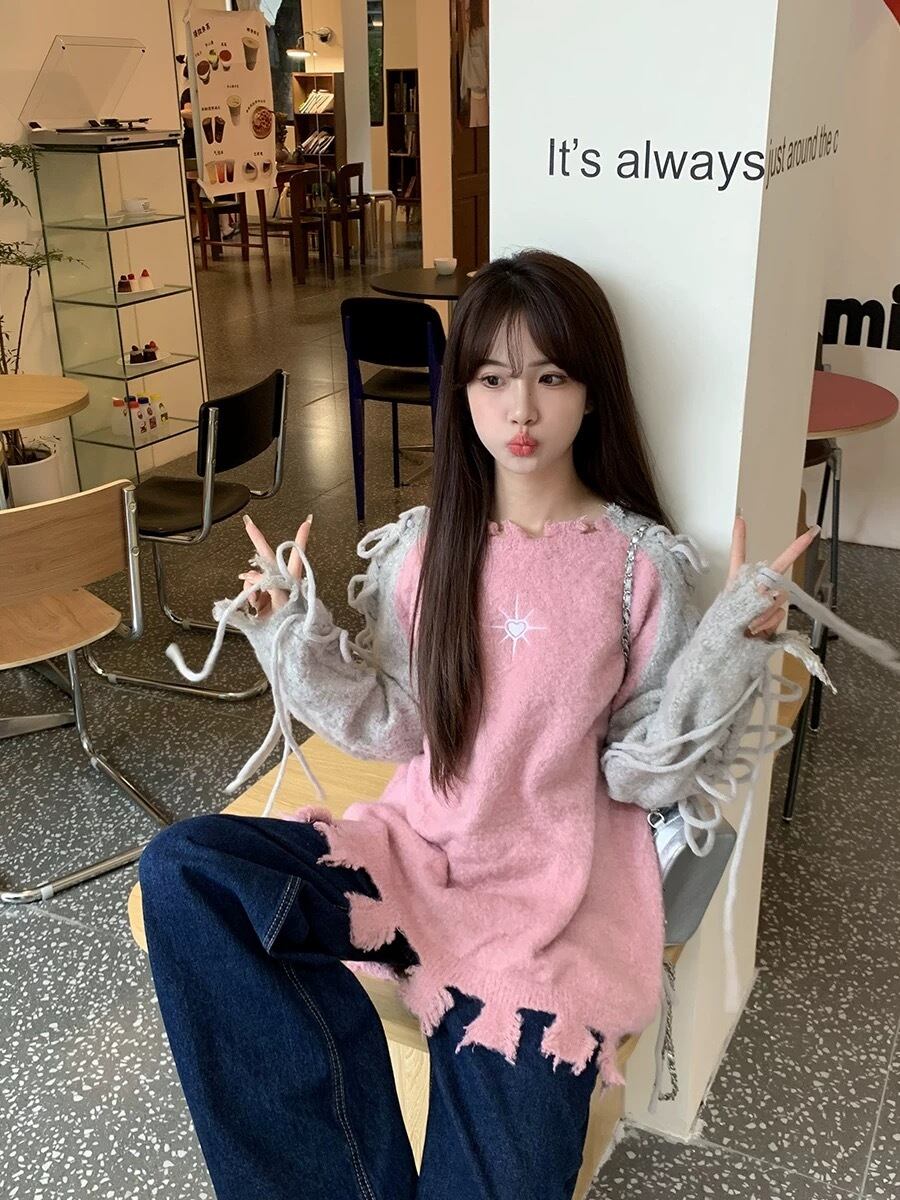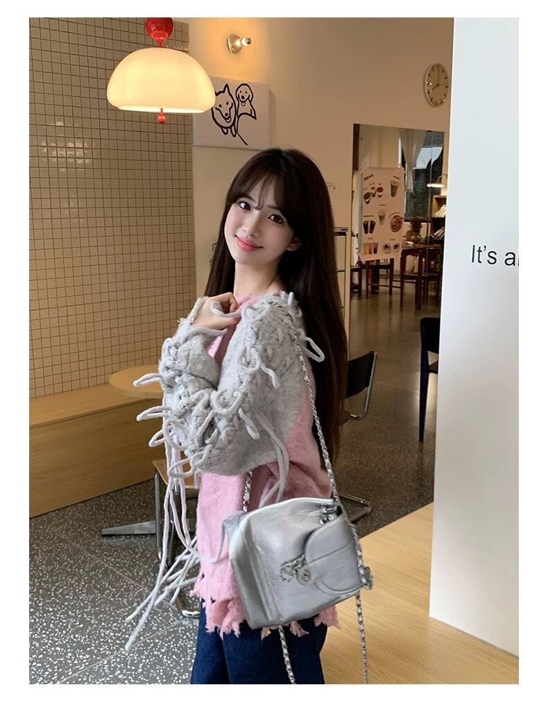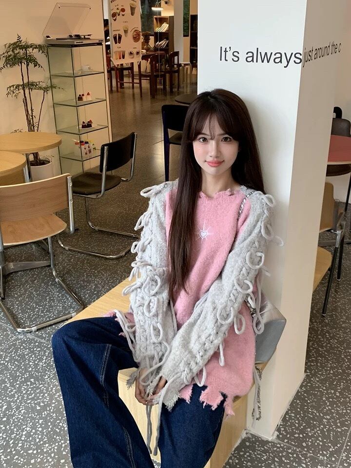 グレー ピンク 水色 黒 リボン セーター XL
