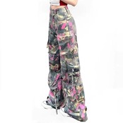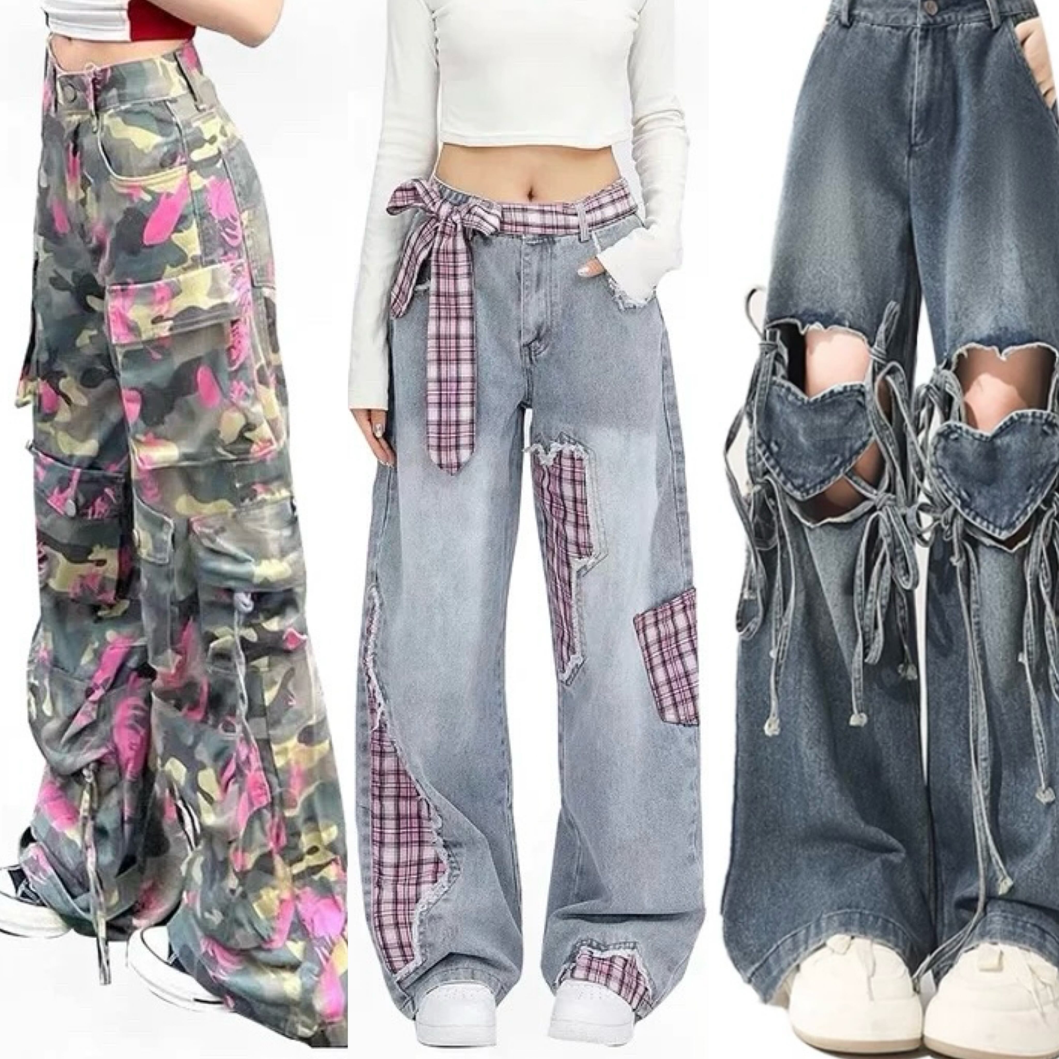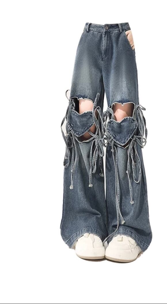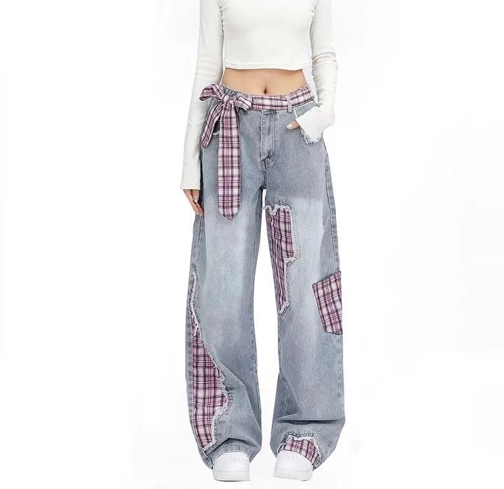 デニム パンツ チェック リボン 水色