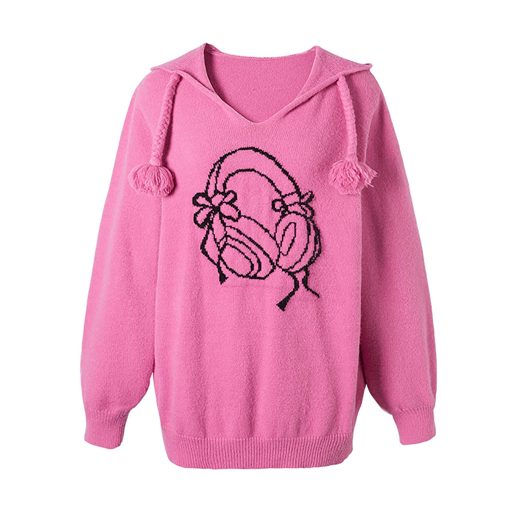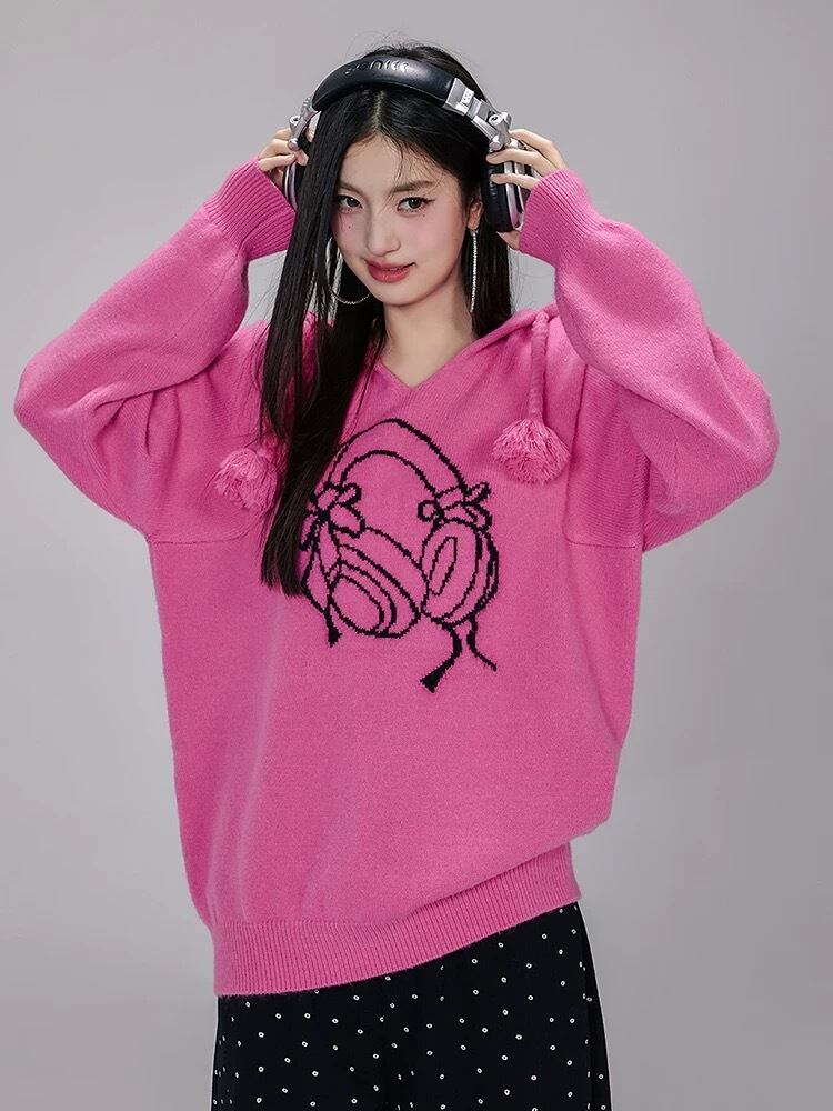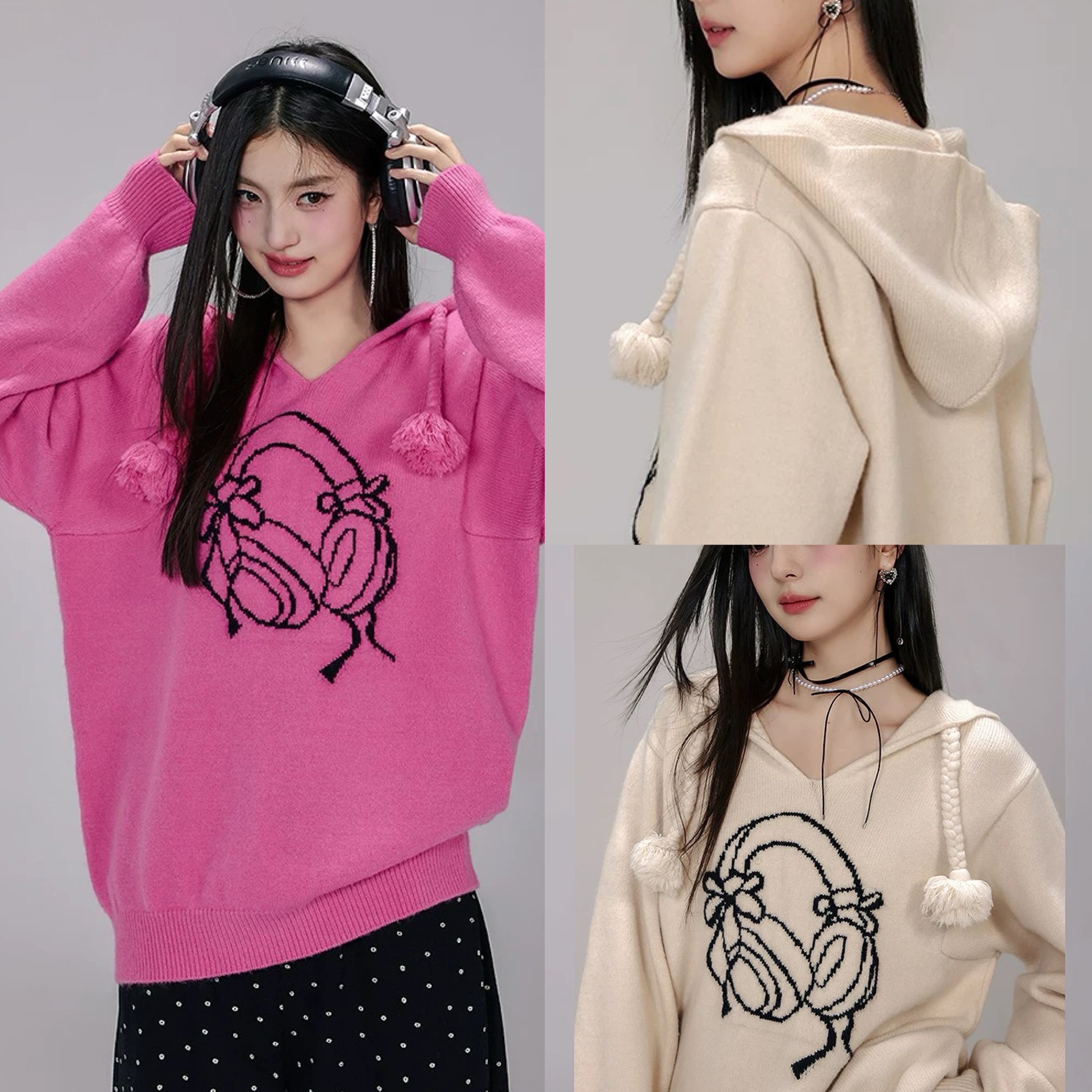 ニット パーカー ベージュ イヤホン 音楽 ピンク ミュージック