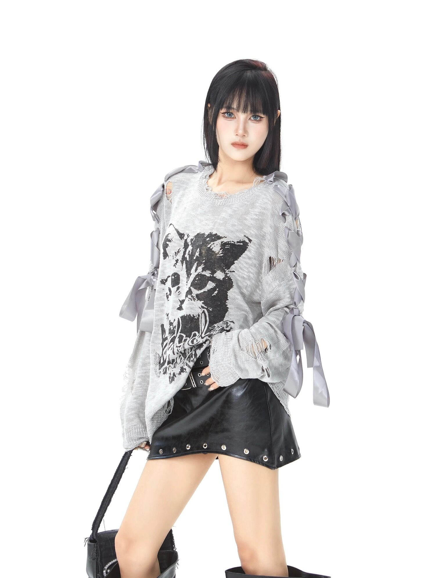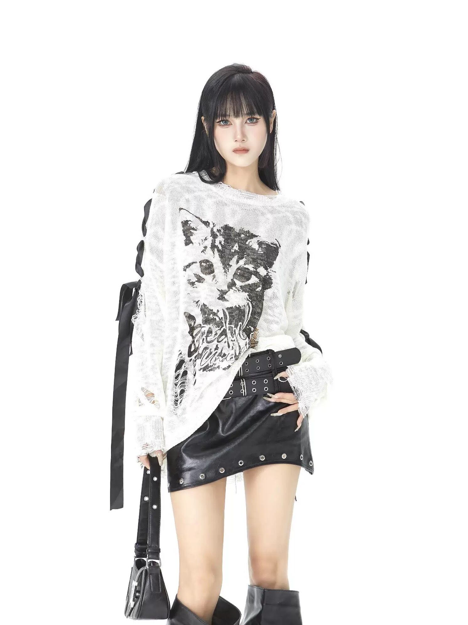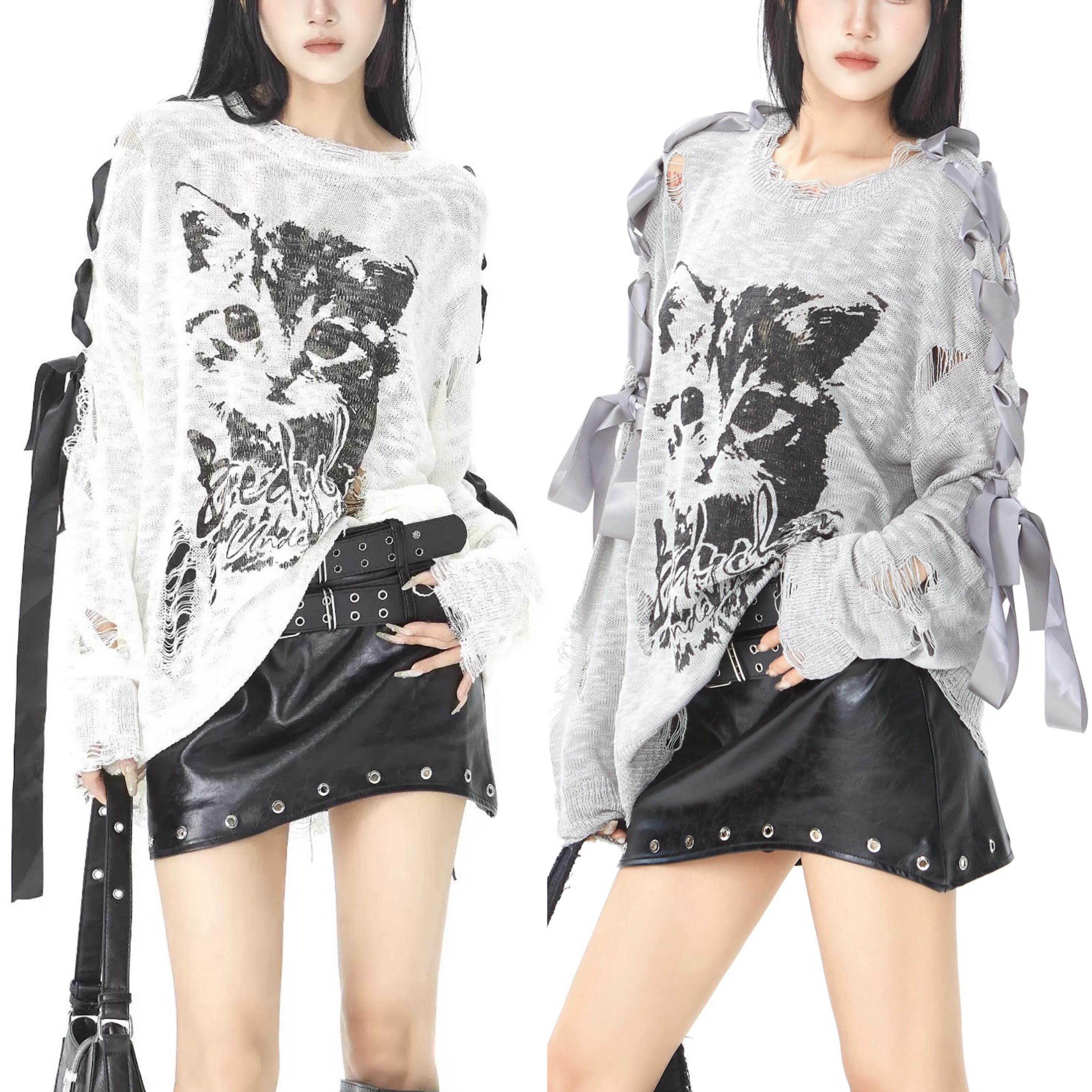ねこ 白 グレー シースルー リボン ブラウス XL