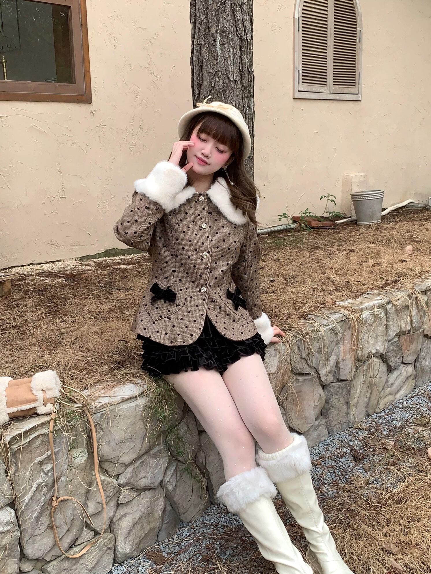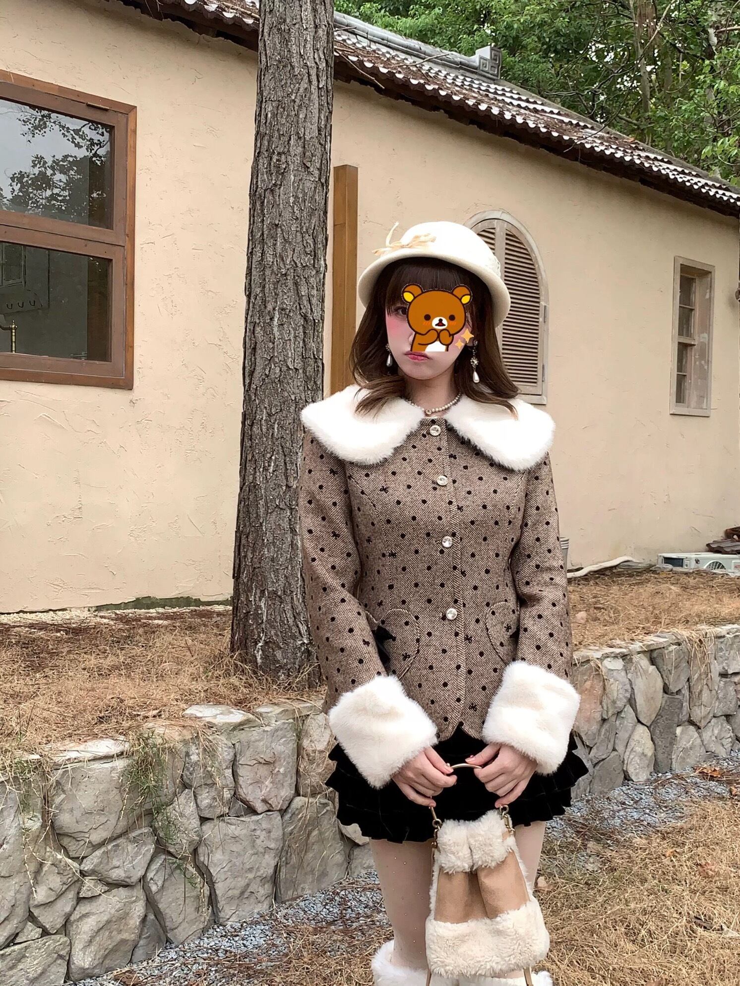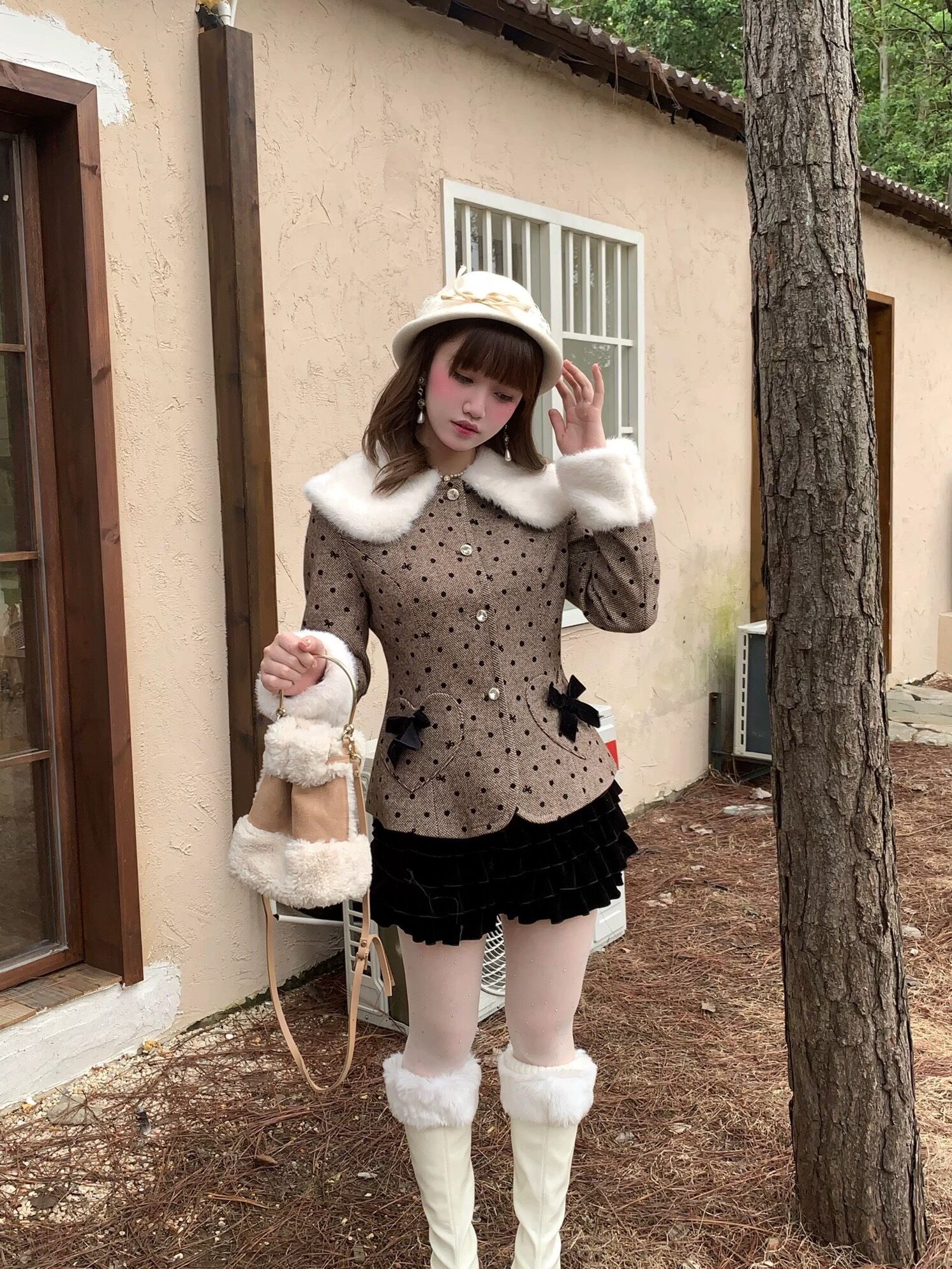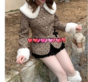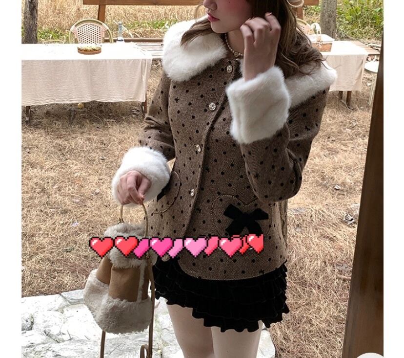 丸襟 ジャケット アウター 茶色 水玉 ハート ドット コート ファー
