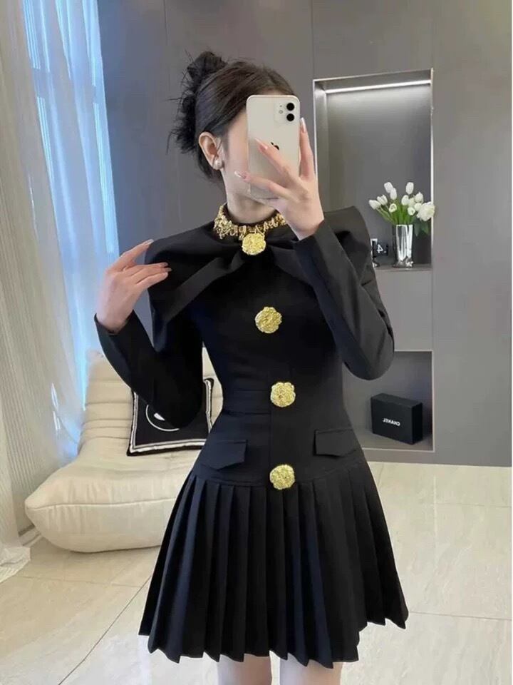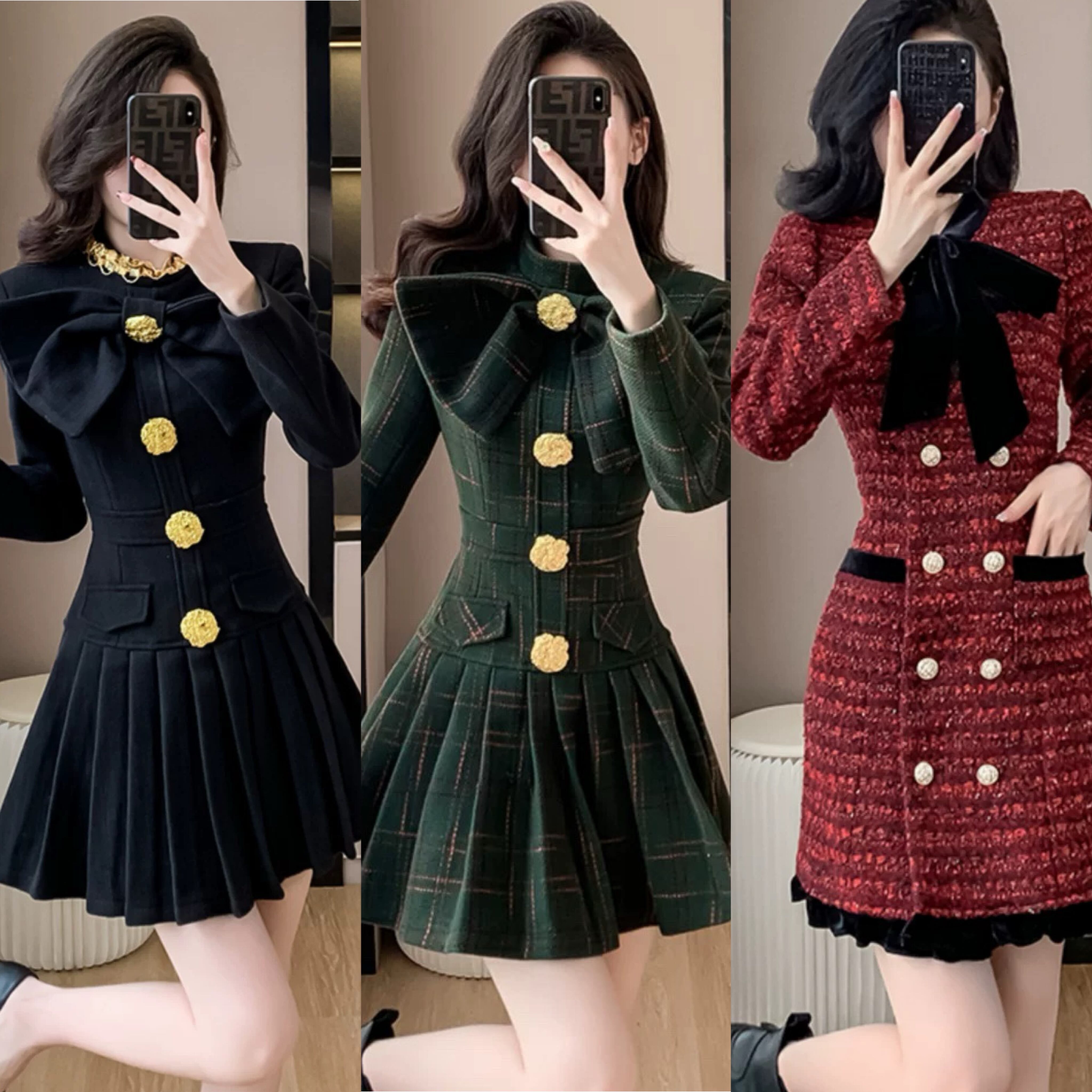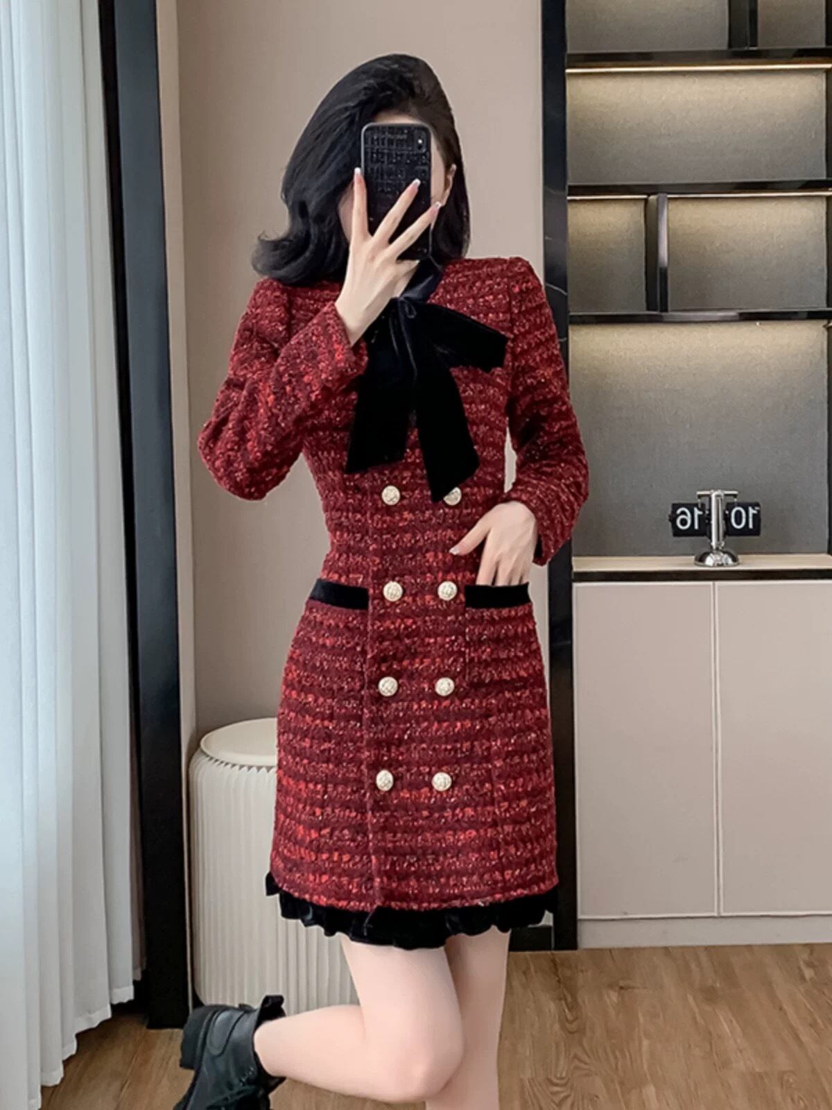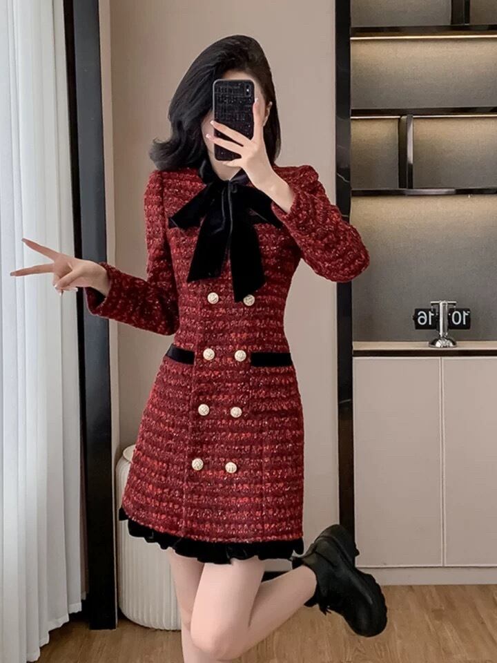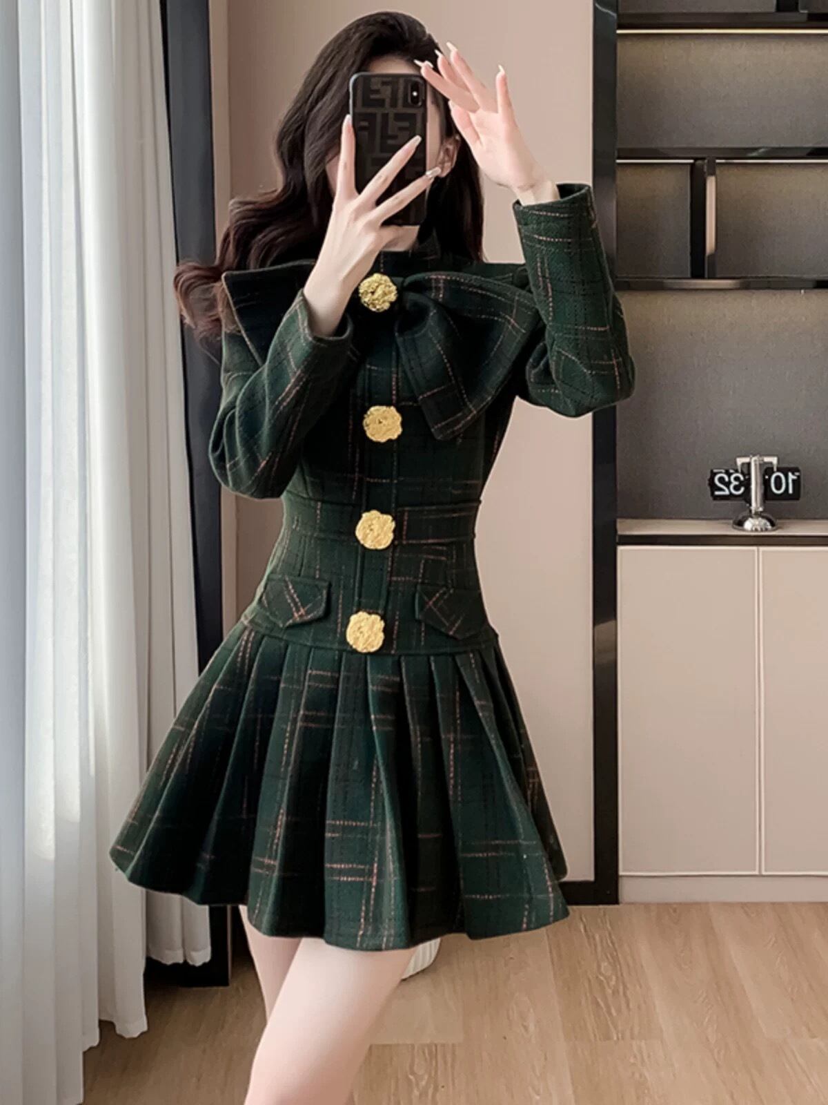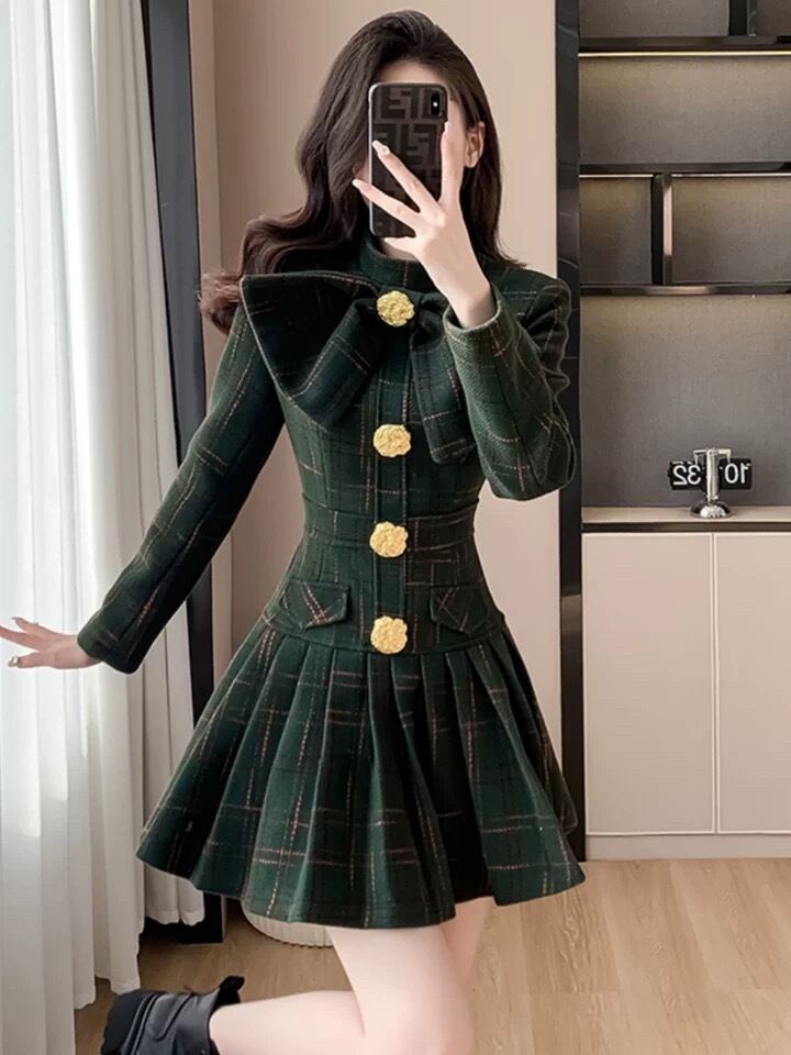 チェック 緑 黒 金色 ボタン ワンピース リボン 赤 黒