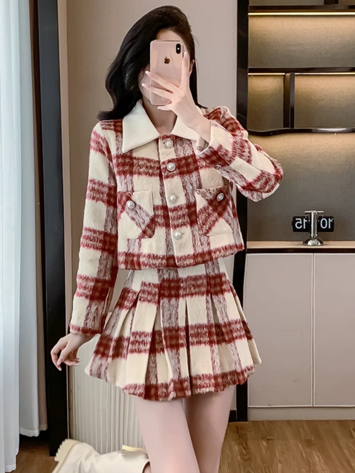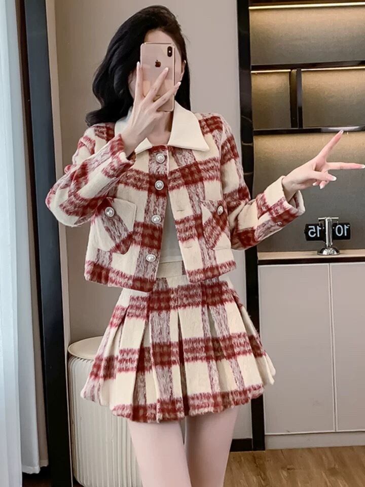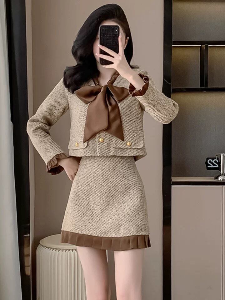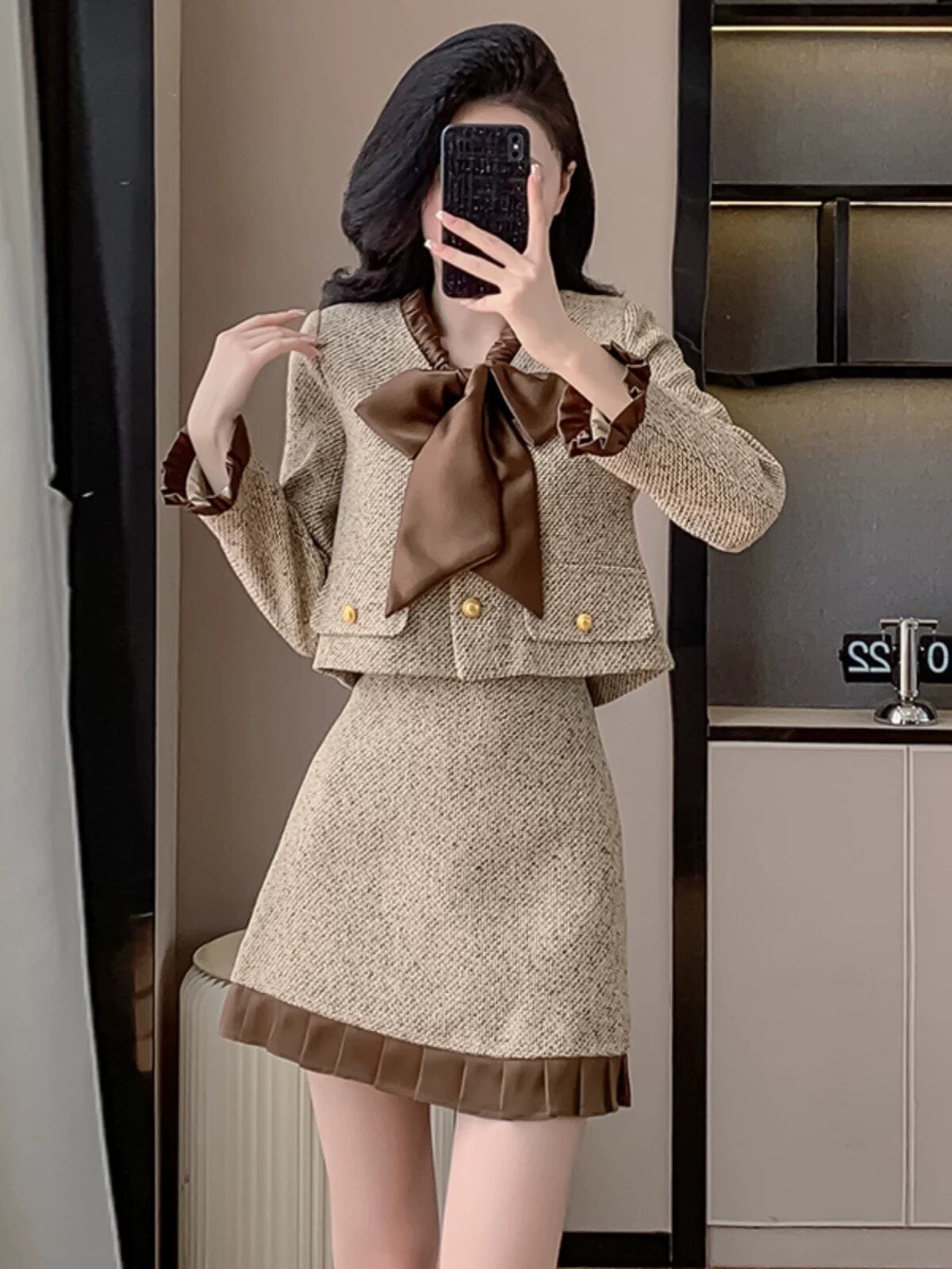 【セットアップ】茶色 リボン 赤 チェック ピンク