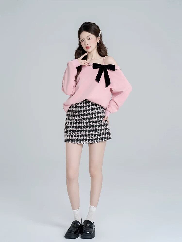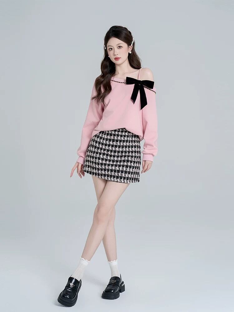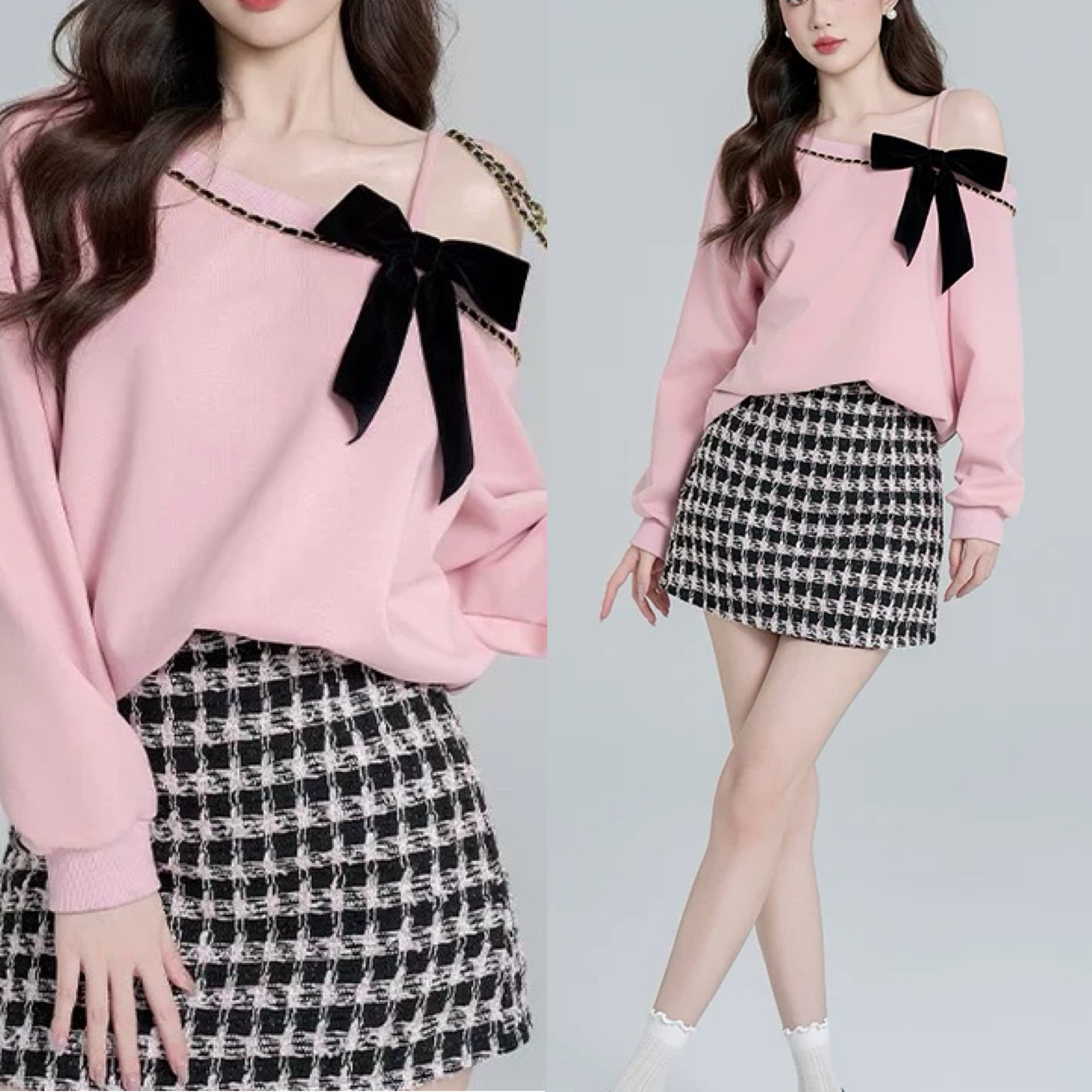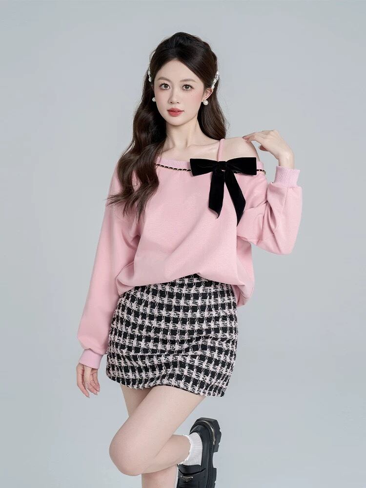 オフショルダー ピンク トレーナー パーカー 可愛い リボン