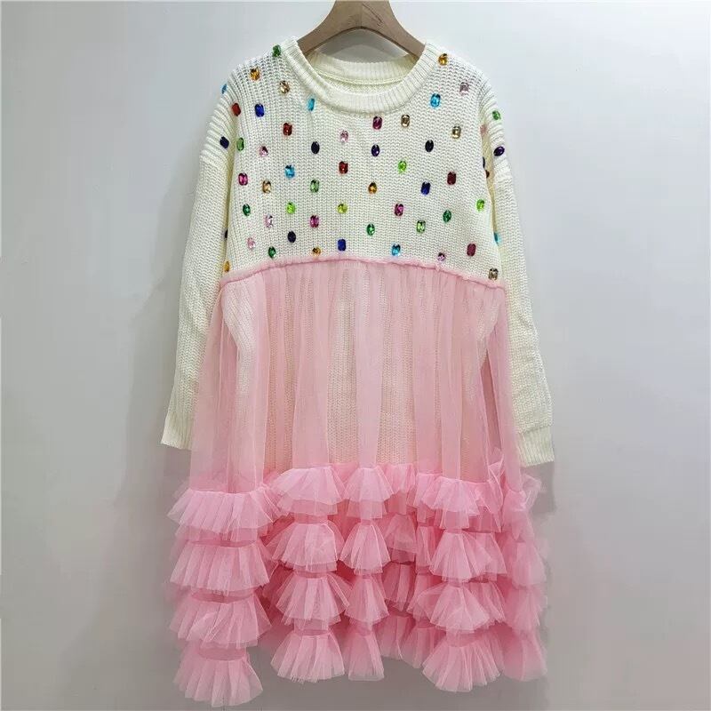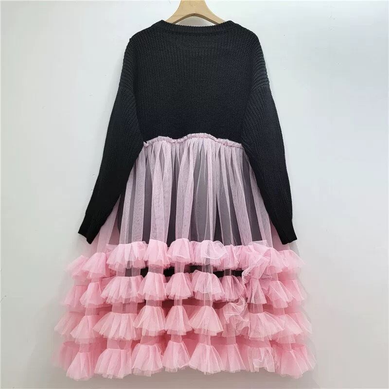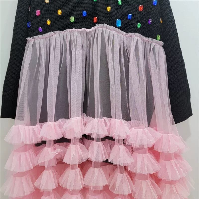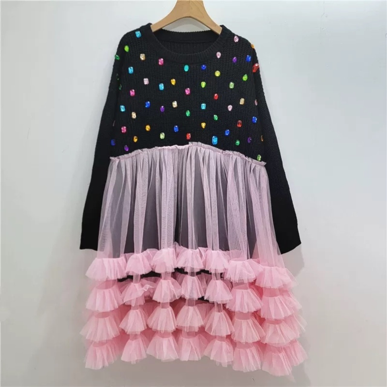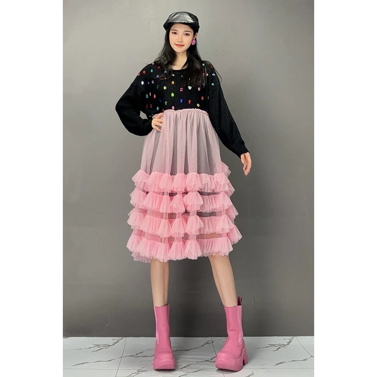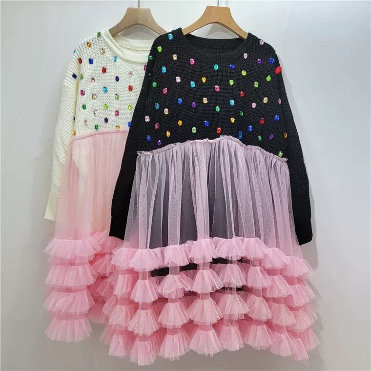 デコレーション 黒 白 ピンク ラインストーン ワンピース