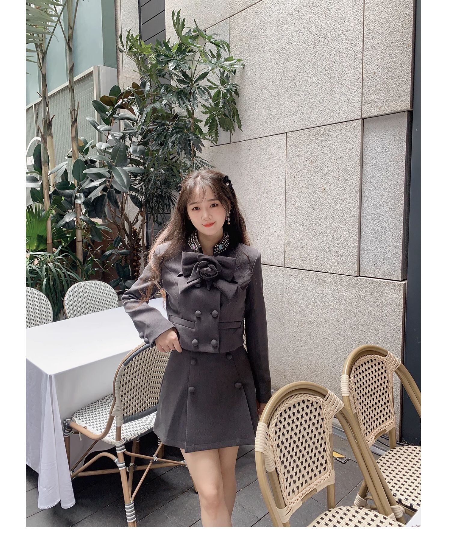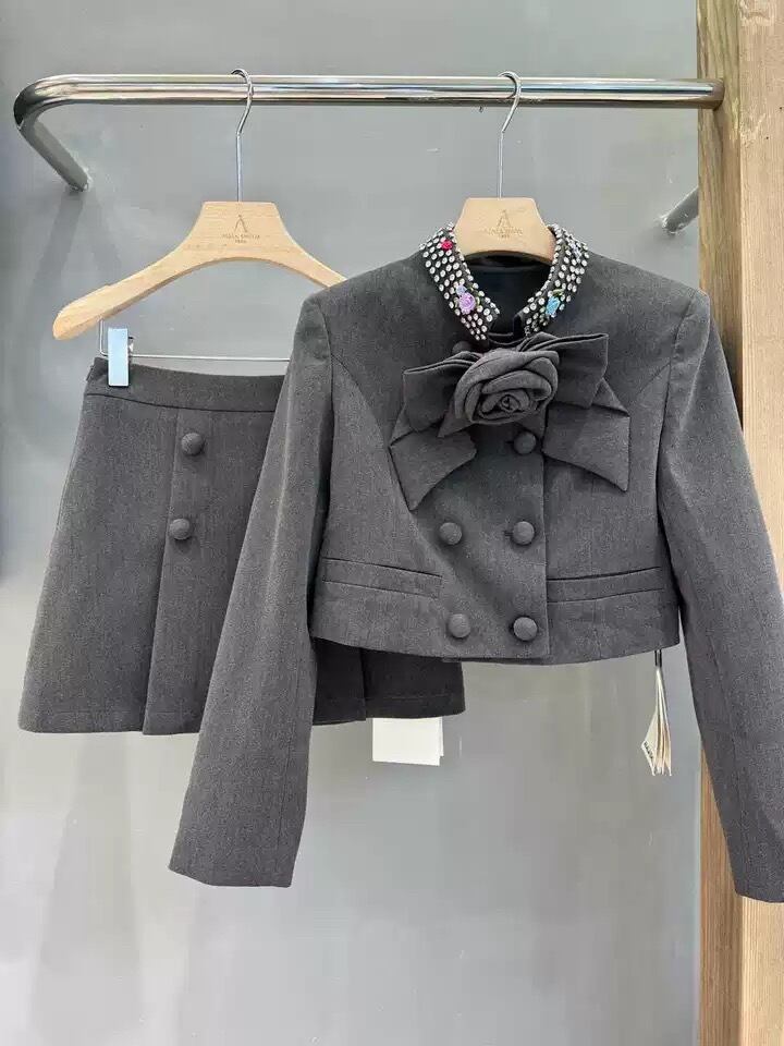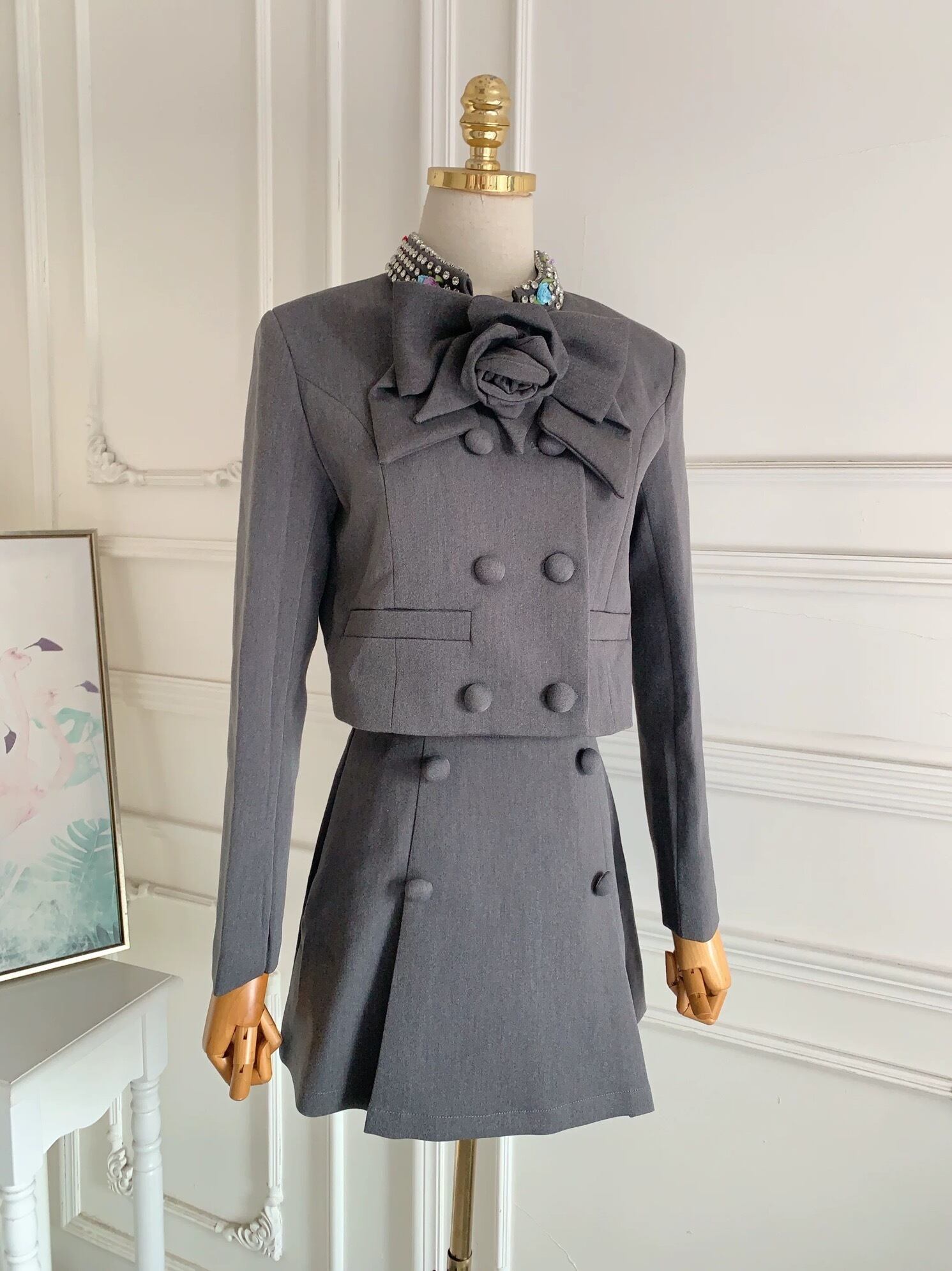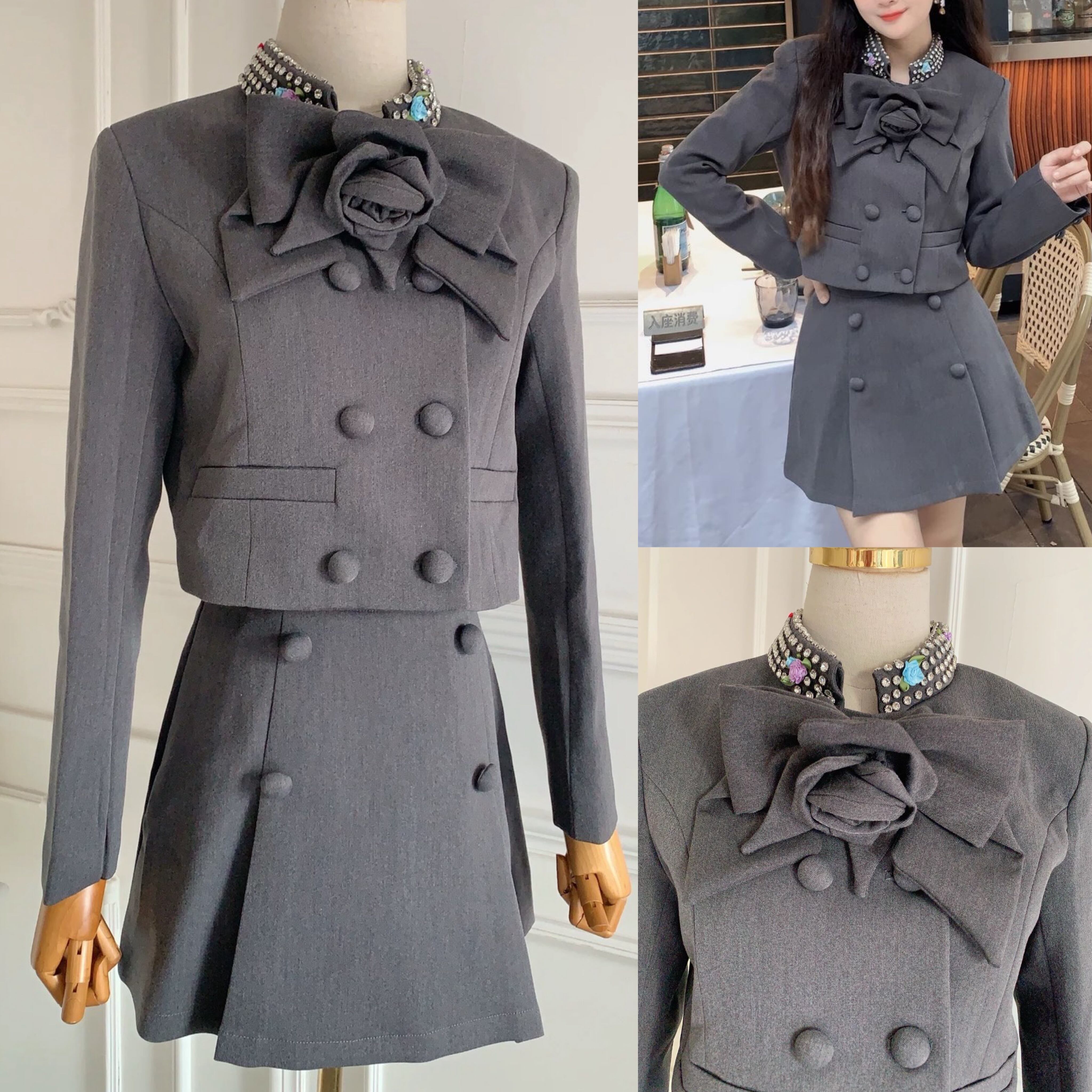 【セットアップ】グレー カメリア 薔薇 ジャケット スカート ツーピース