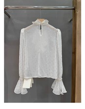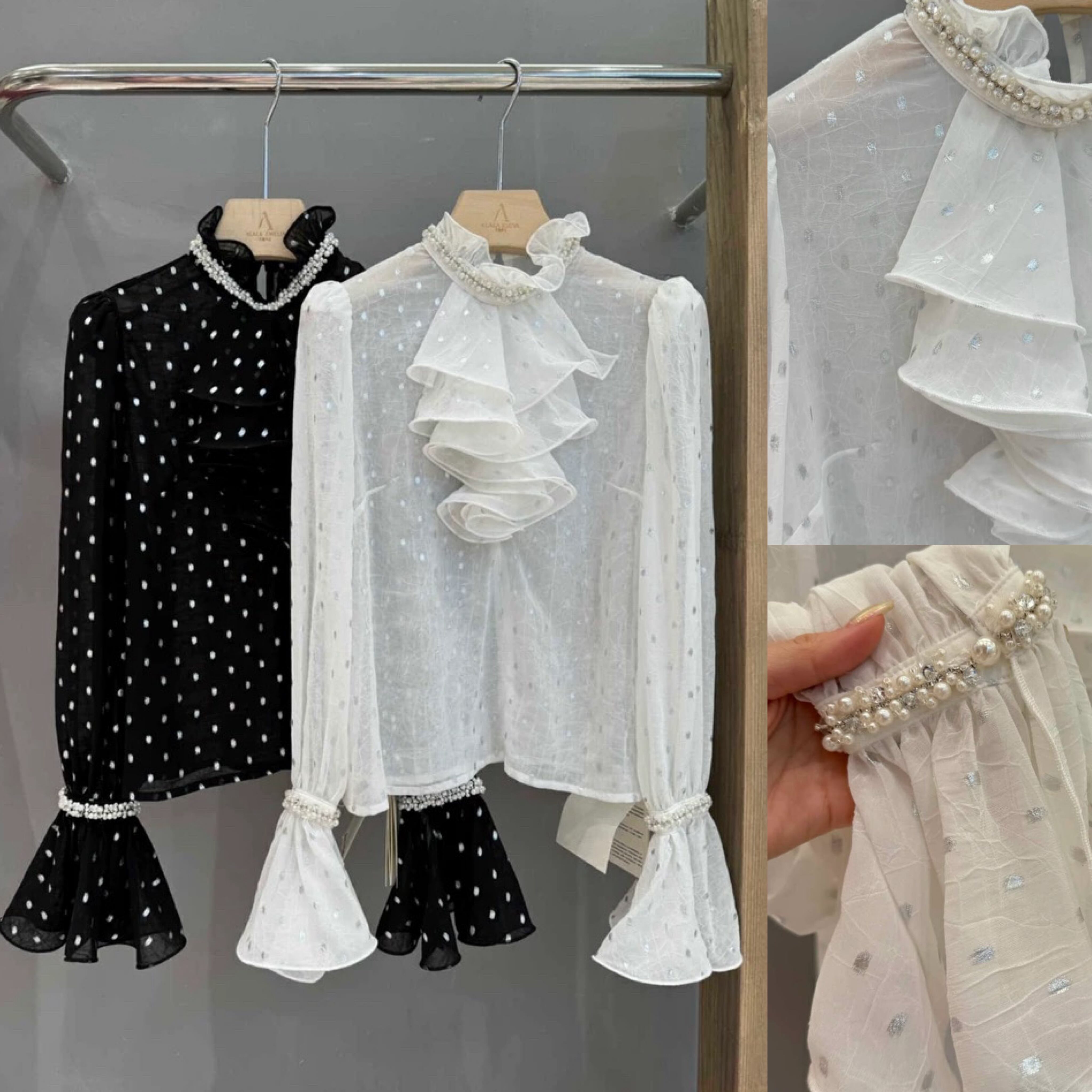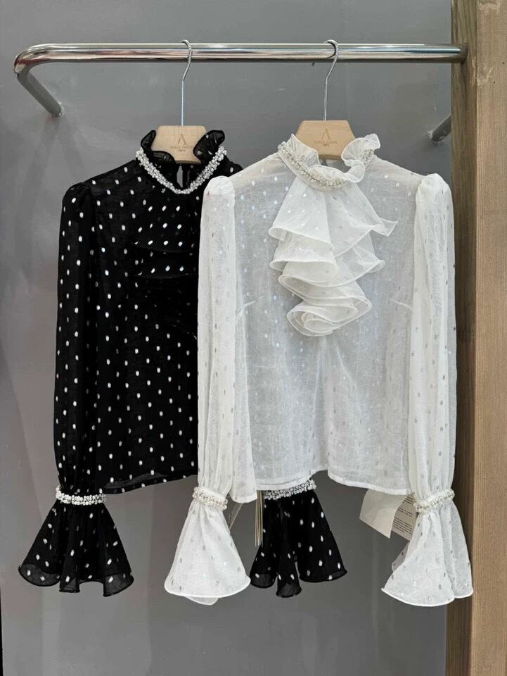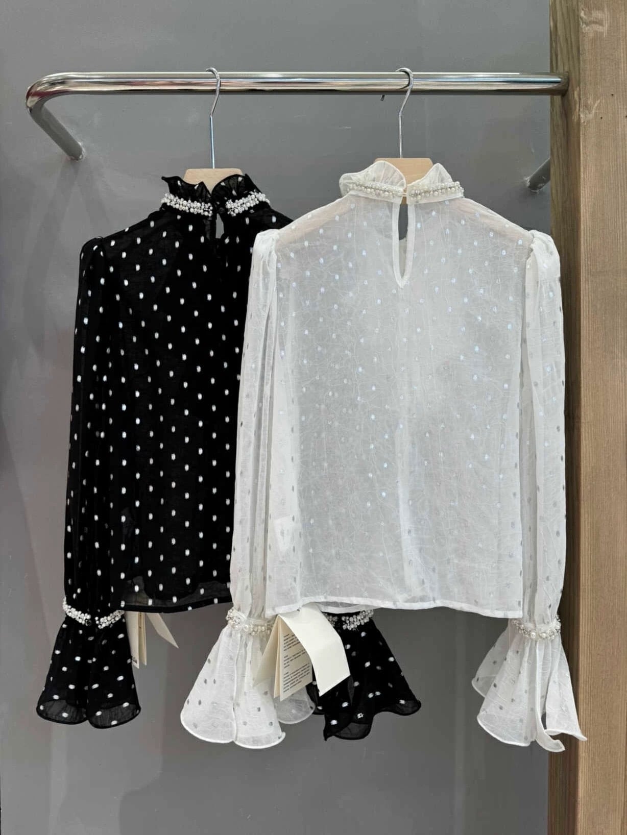 白 黒 パール ネックレス 水玉 ドット ブラウス