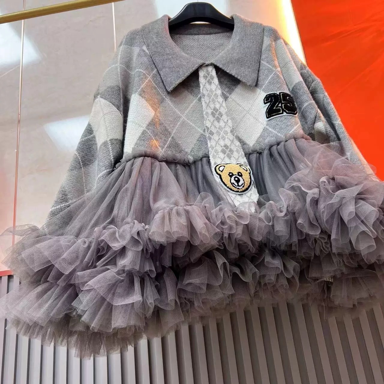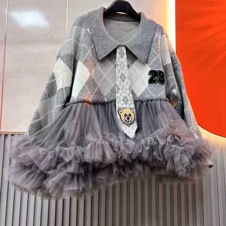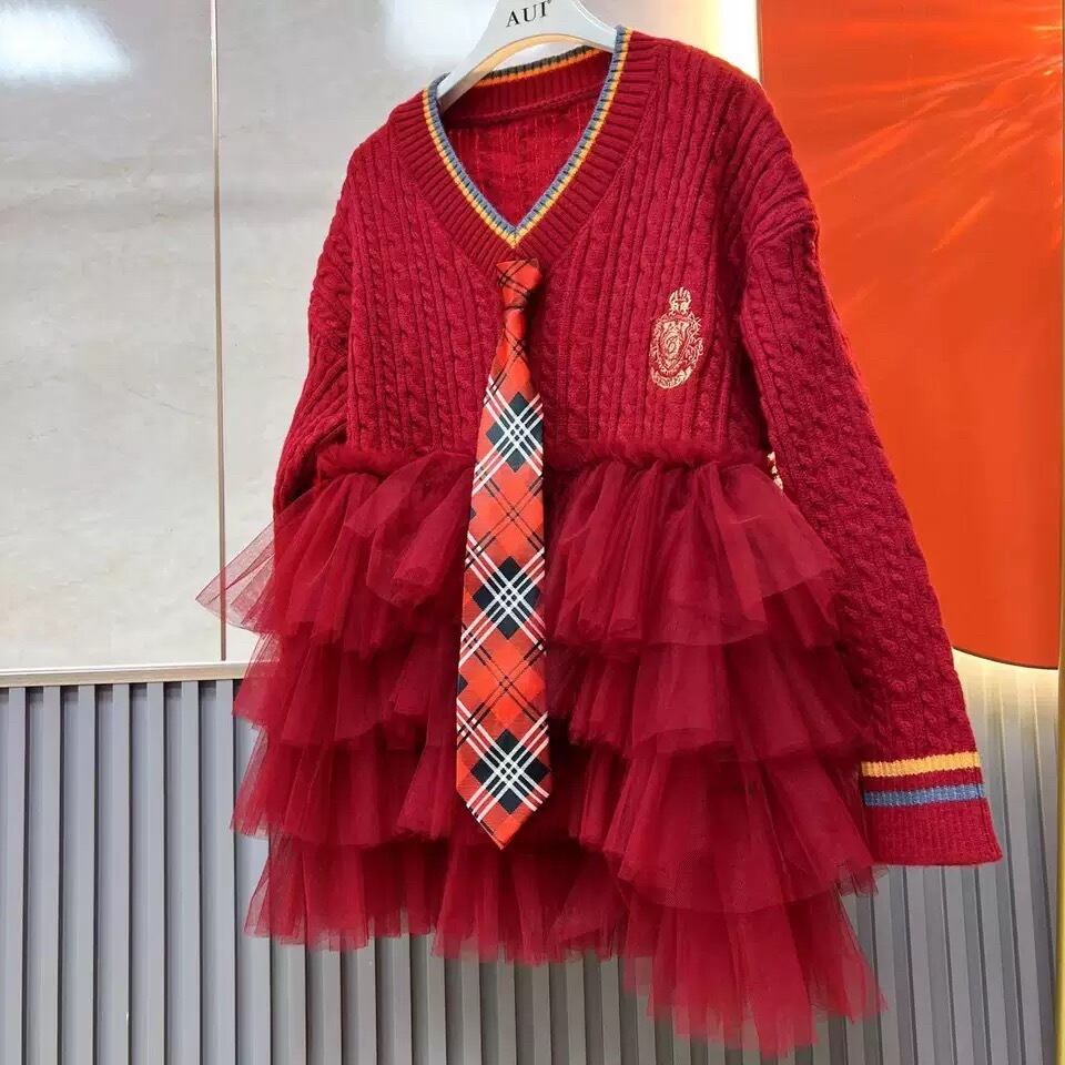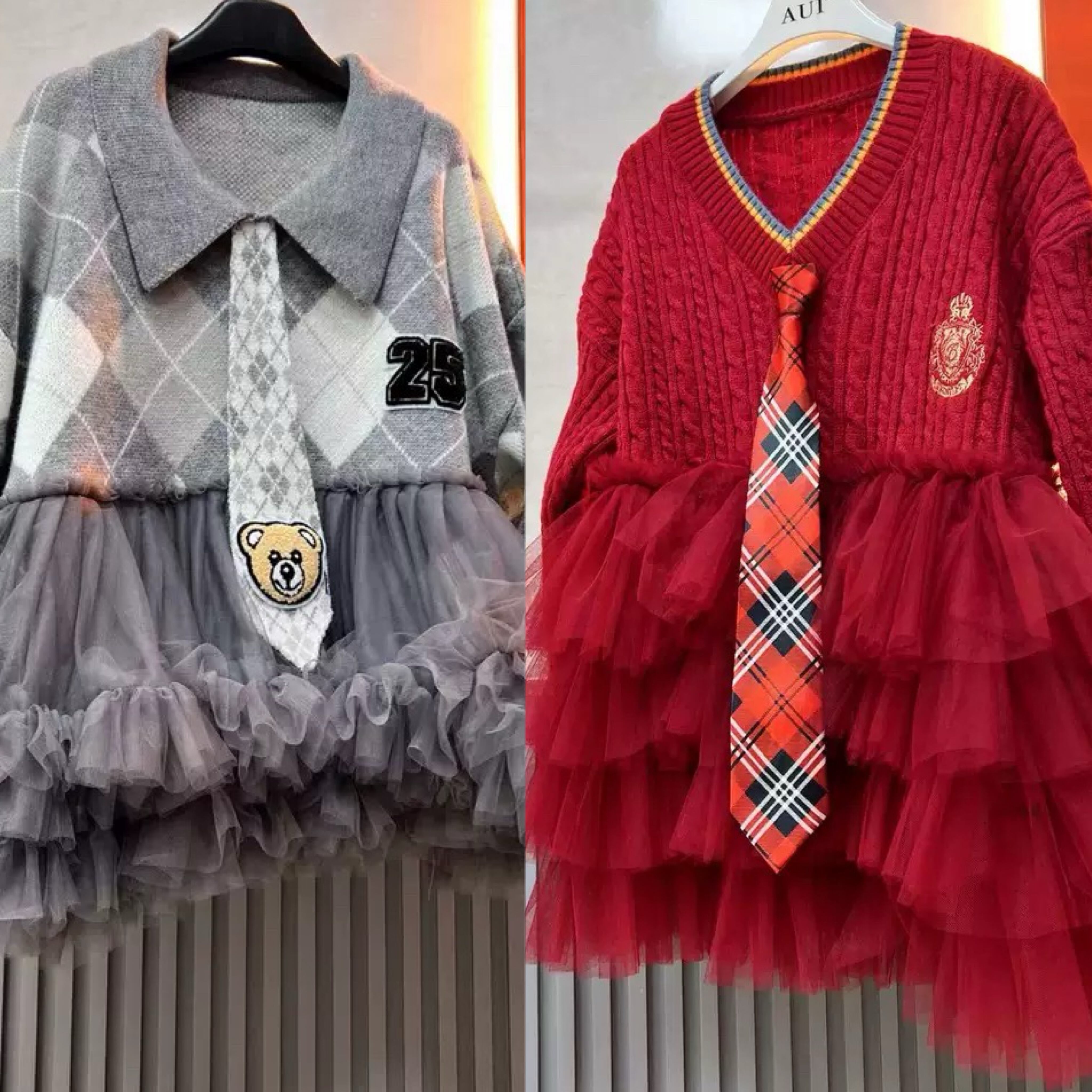 グレー 赤 ニット セーター ワンピース ネクタイ