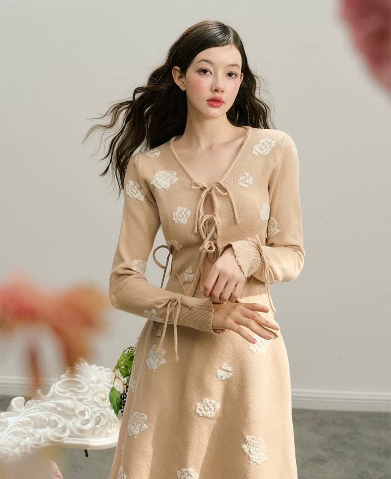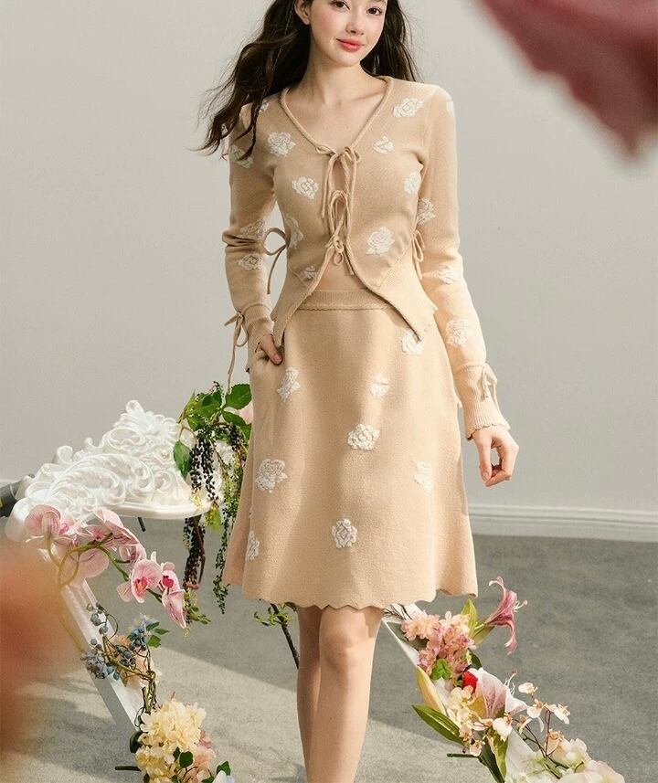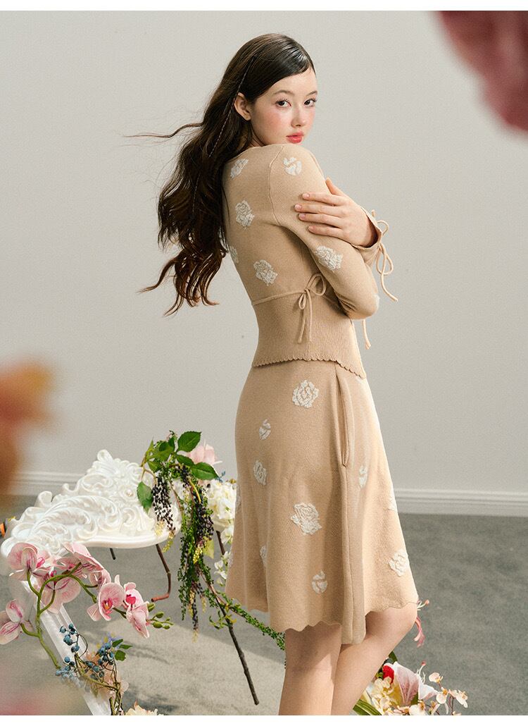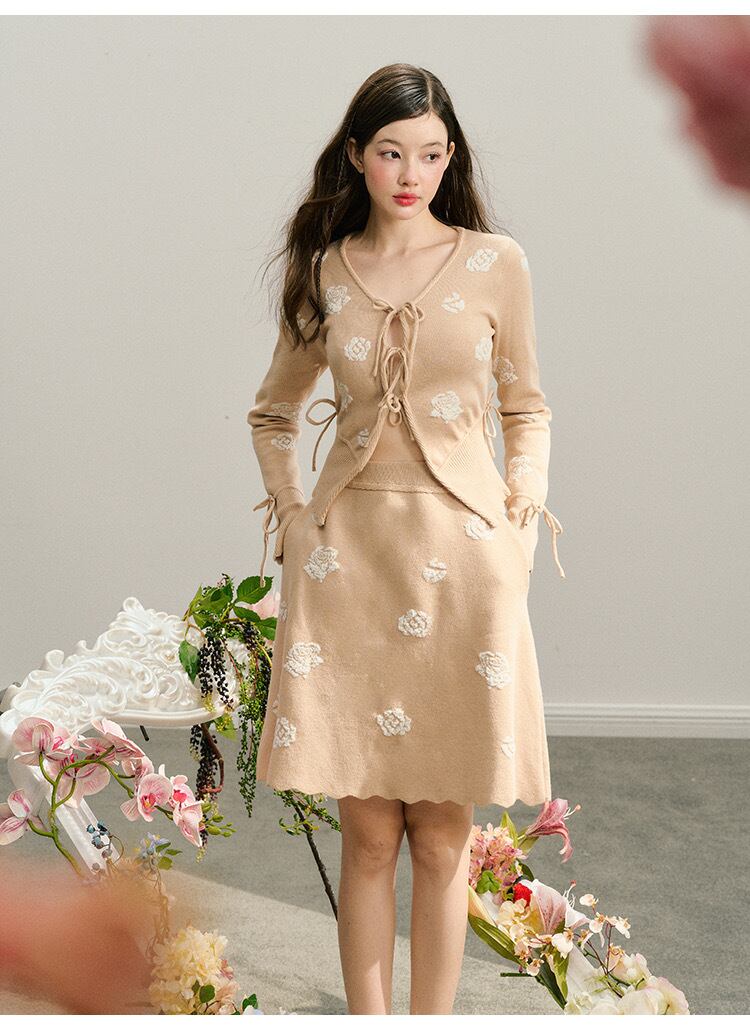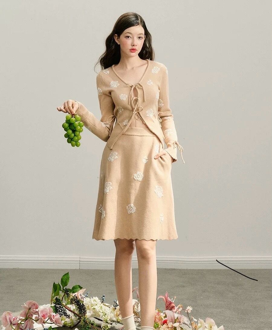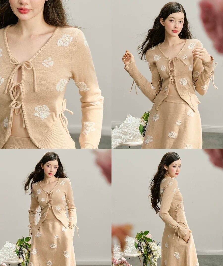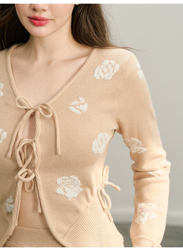 【カーディガン】ベージュ 花柄 フラワー リボン セーター 白
