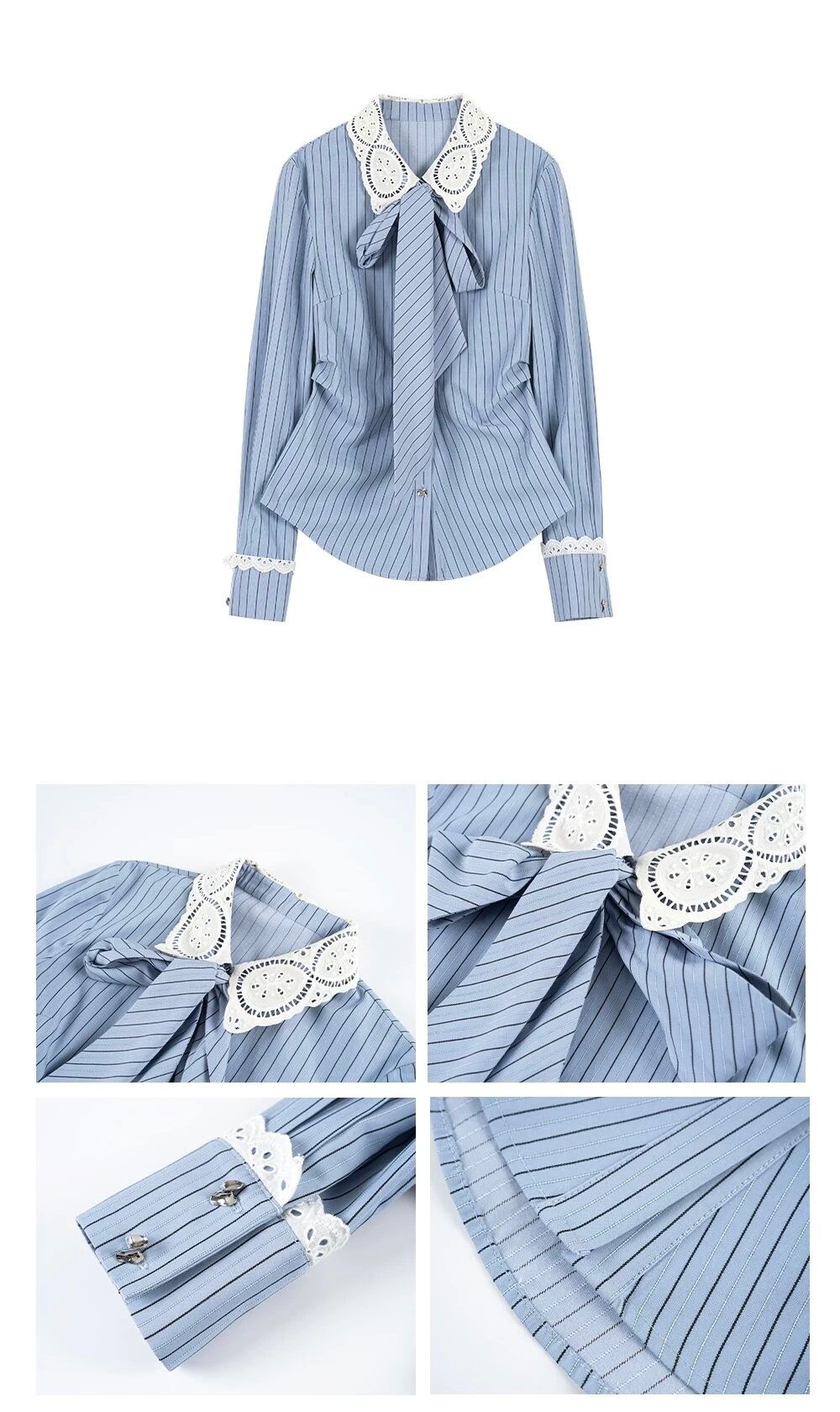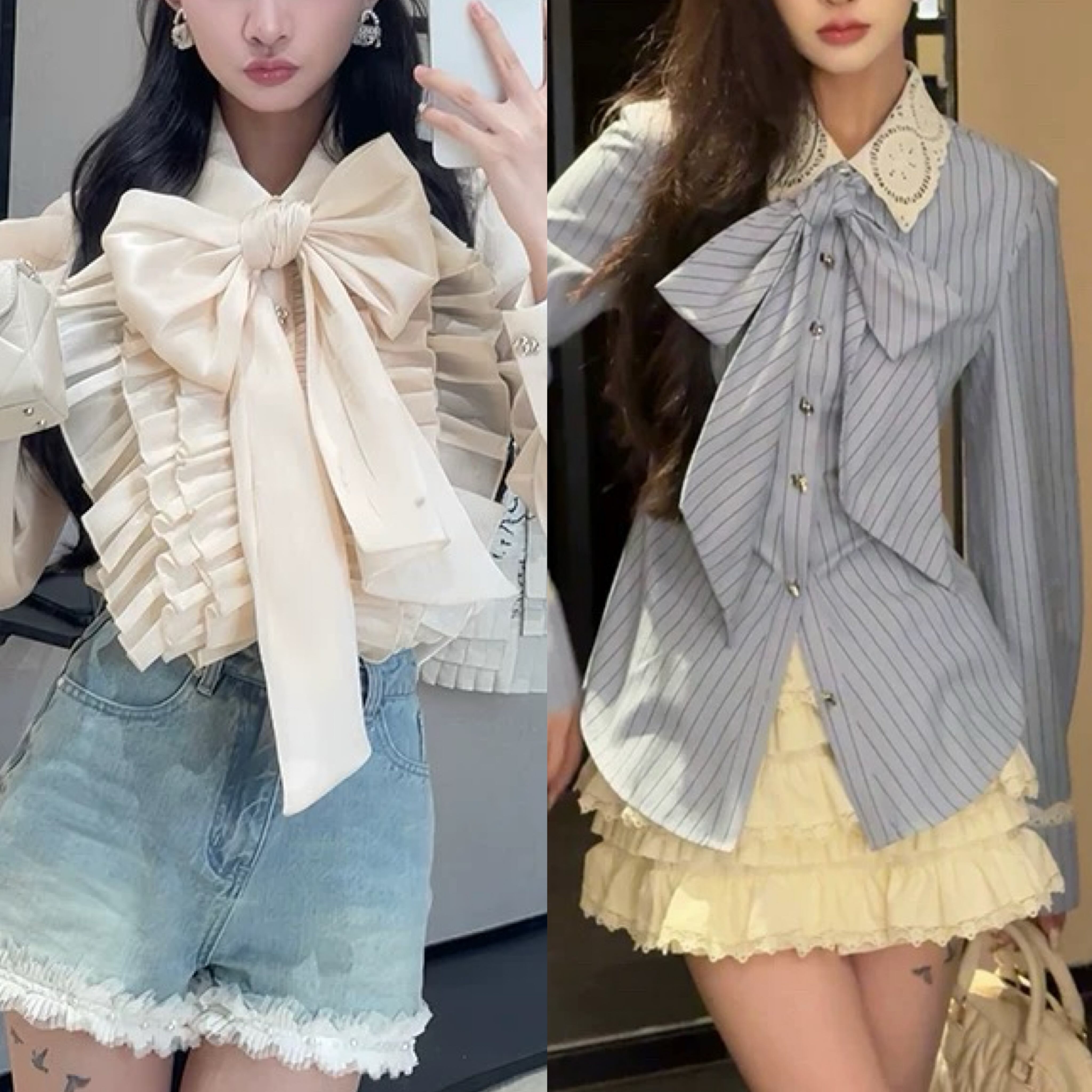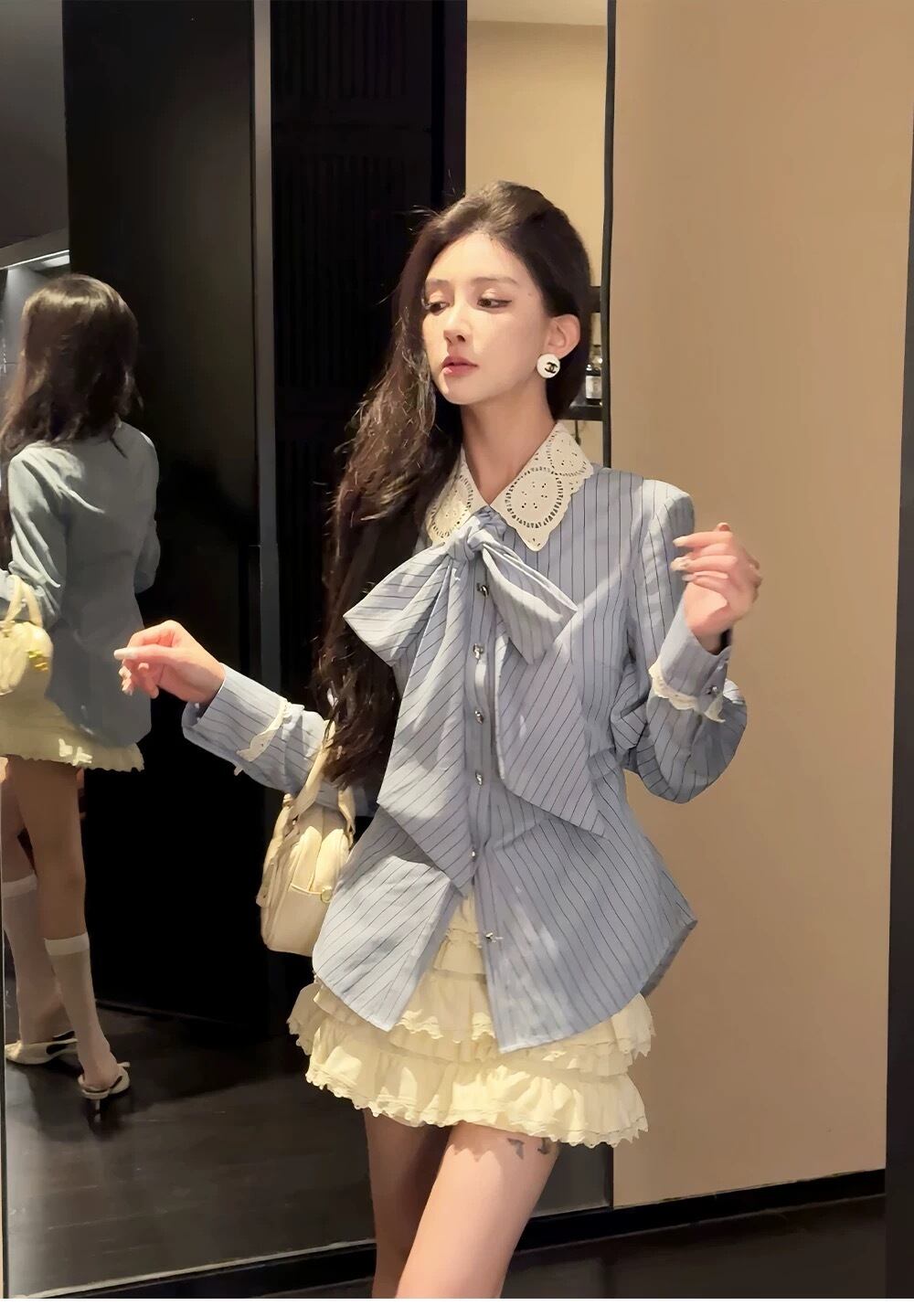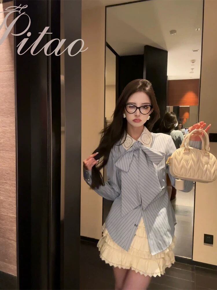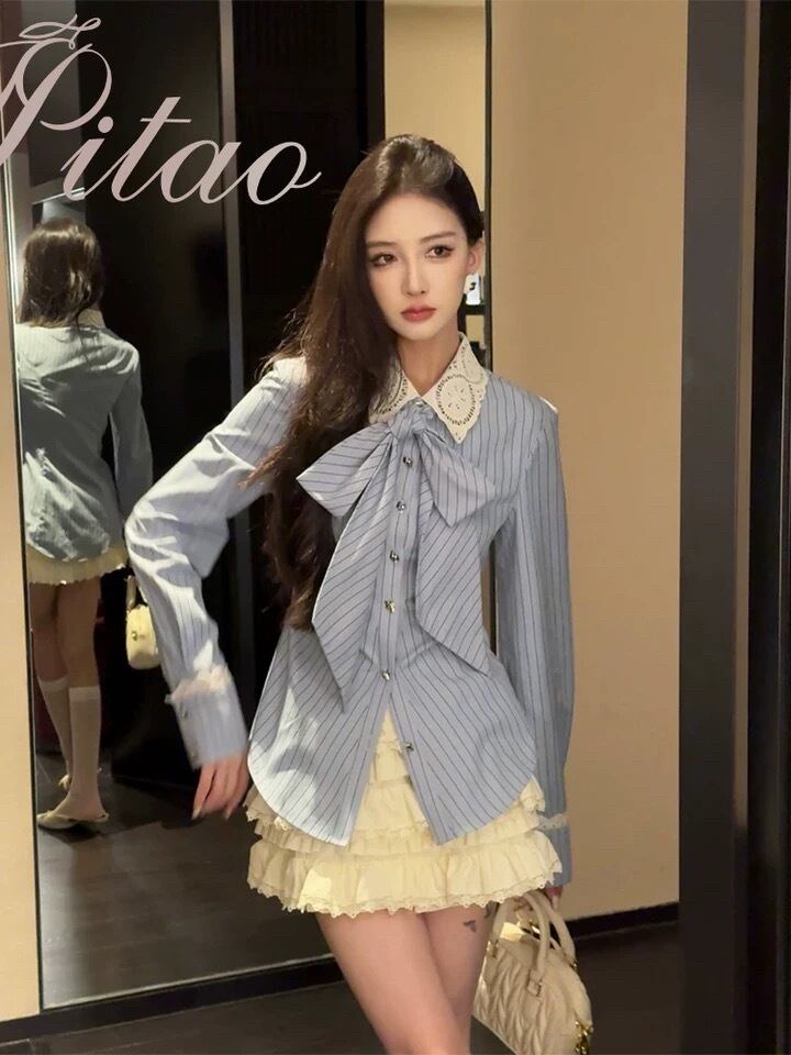 リボン ベージュ 水色 ボーダー ブラウス シャツ