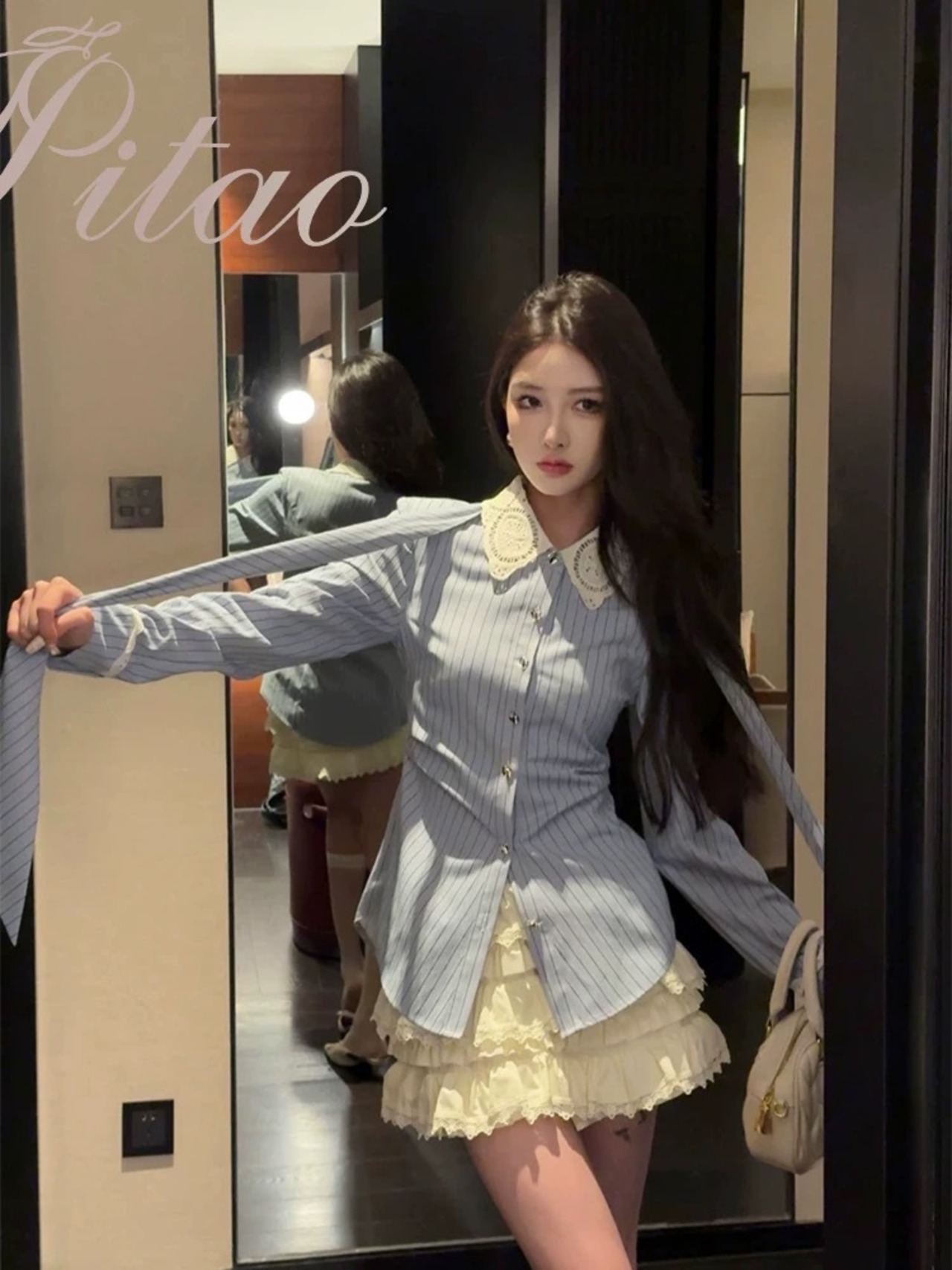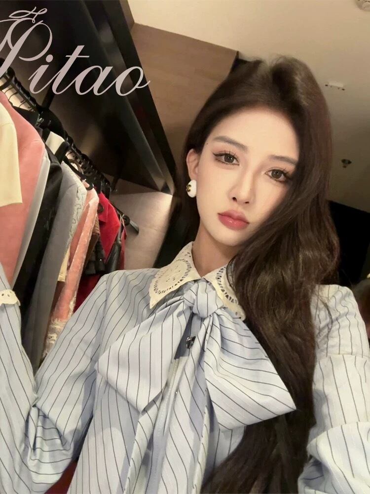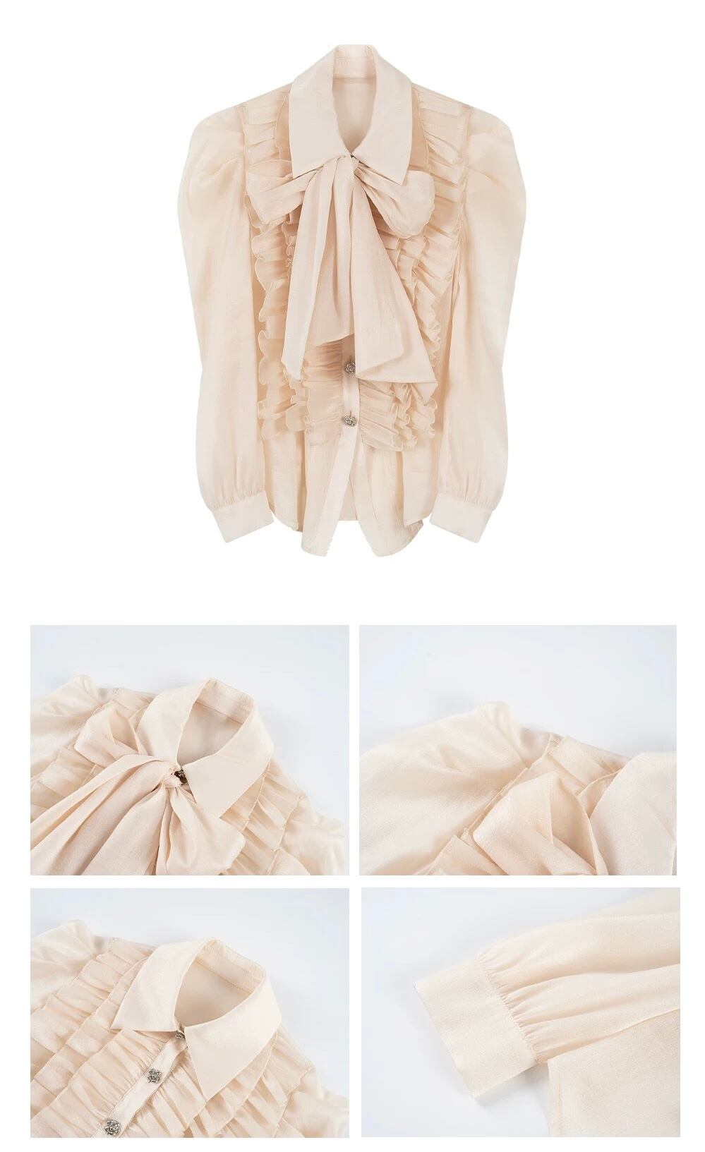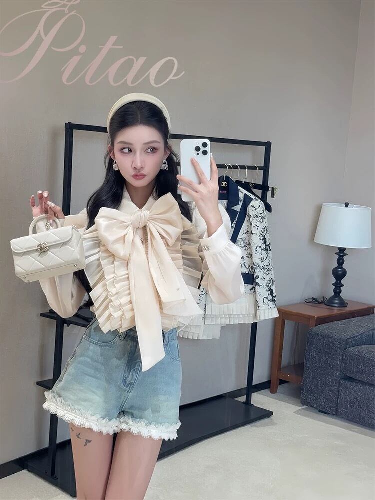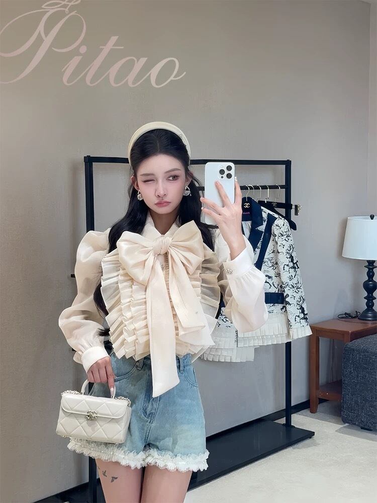 リボン ベージュ 水色 ボーダー ブラウス シャツ
