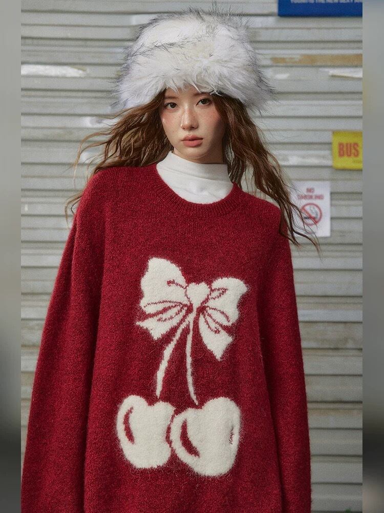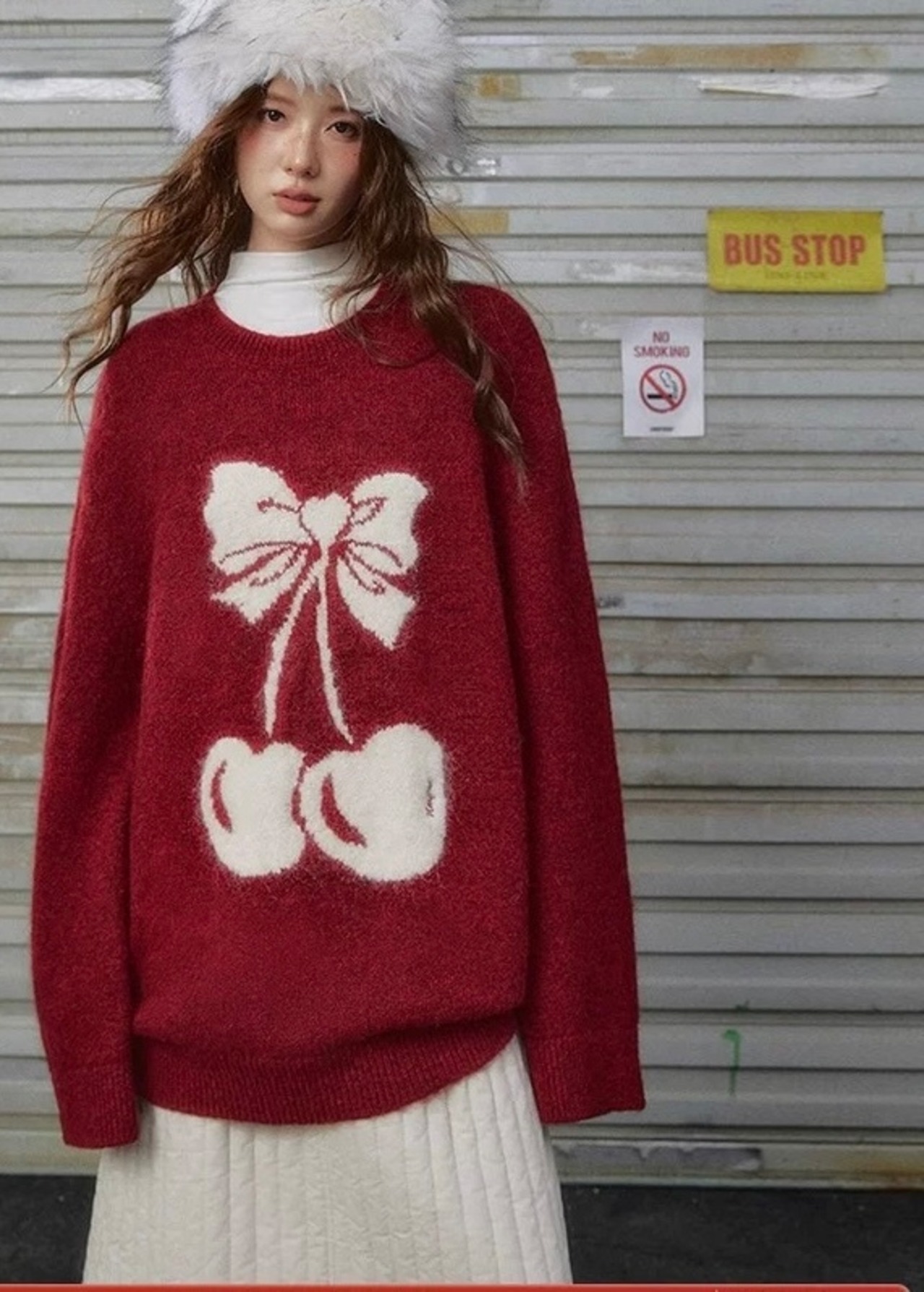 茶色 赤 白 さくらんぼ セーター カーディガン