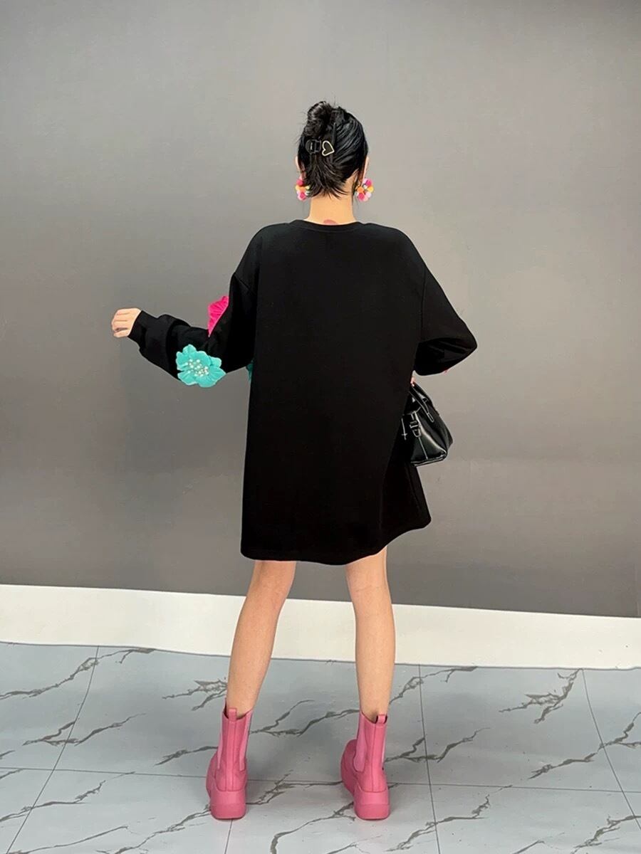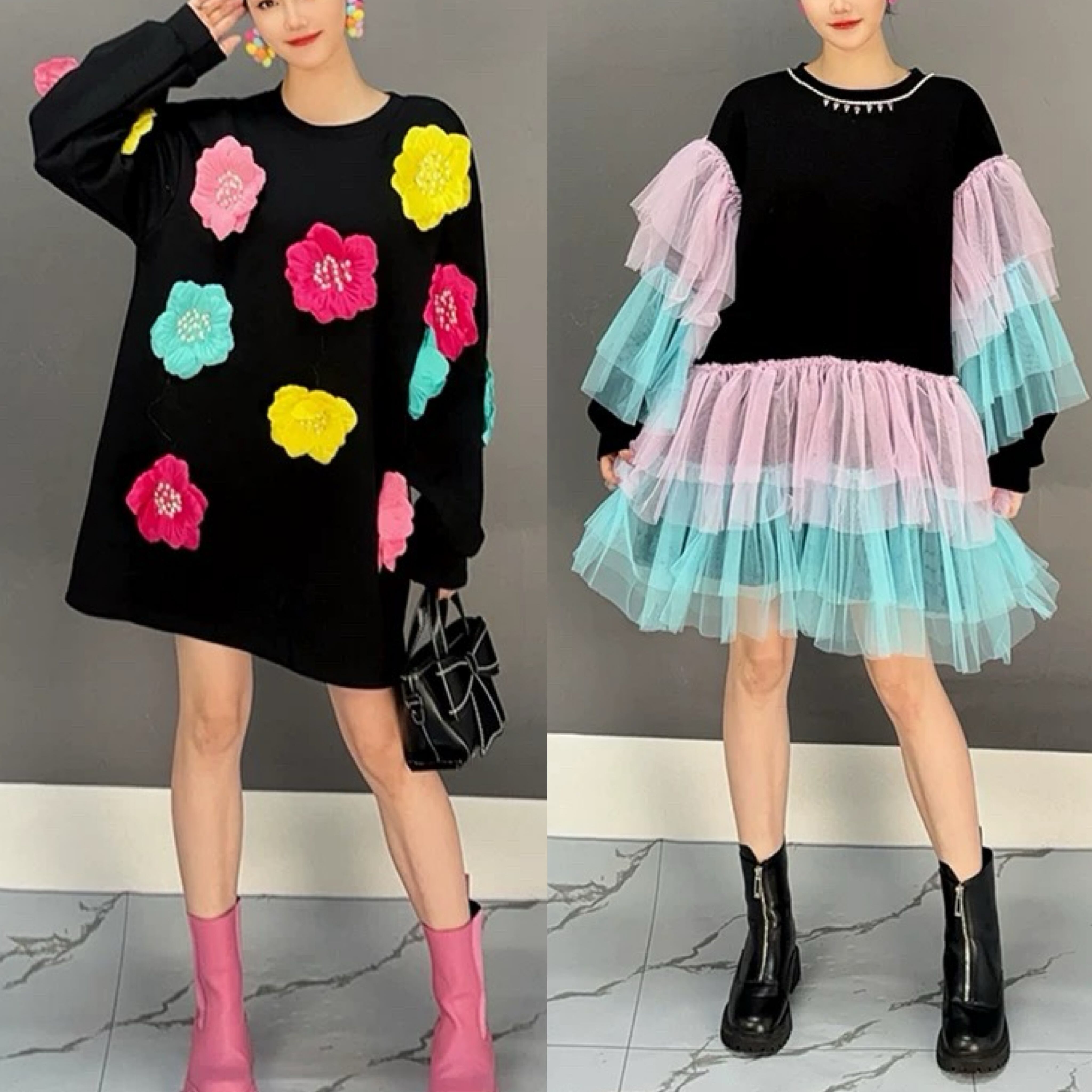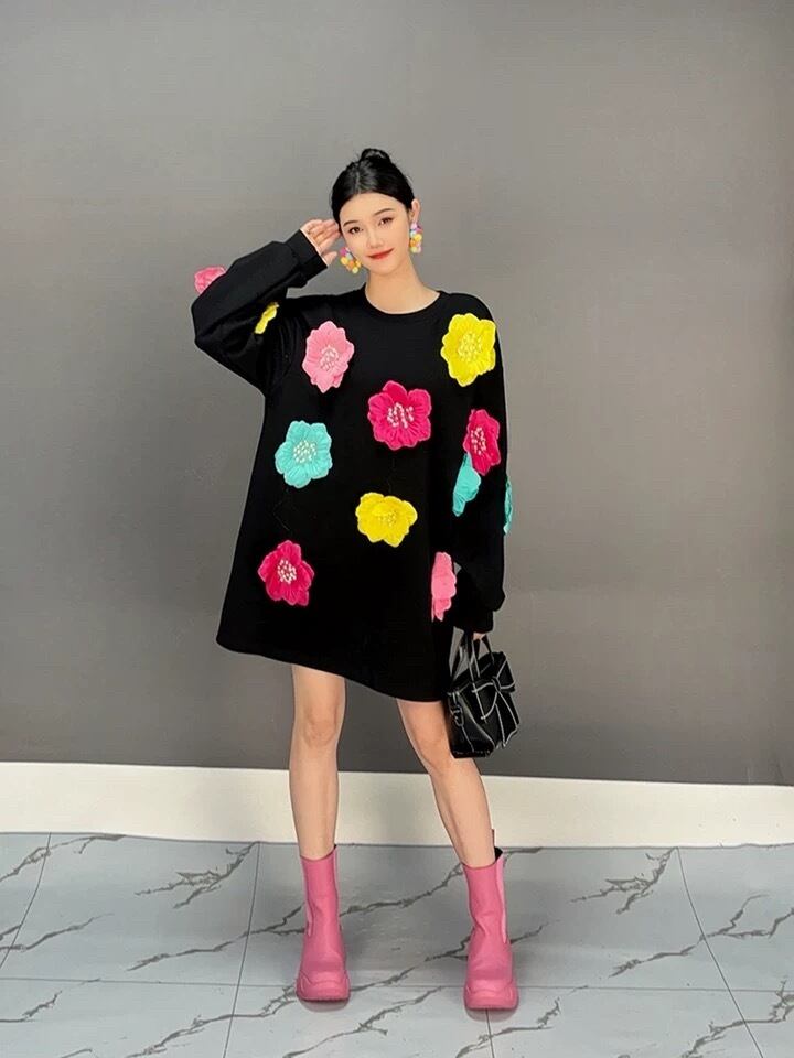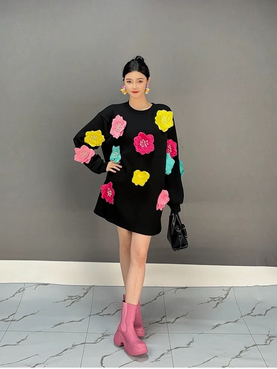 お花 セーター ワンピース 水色 ピンク カラフル デコレーション