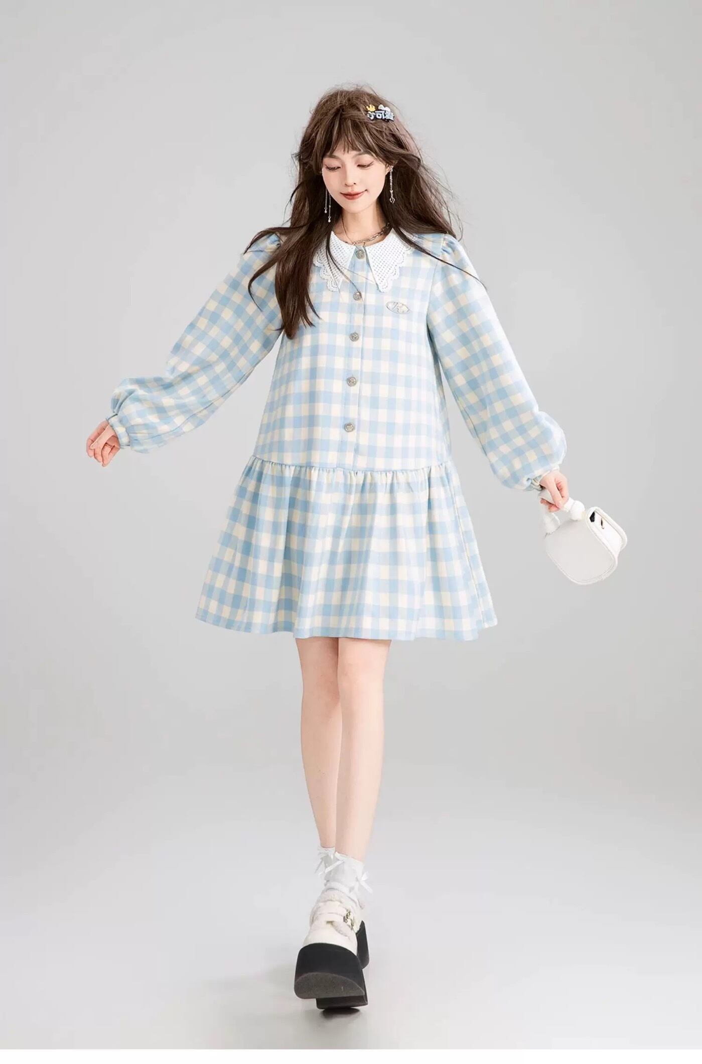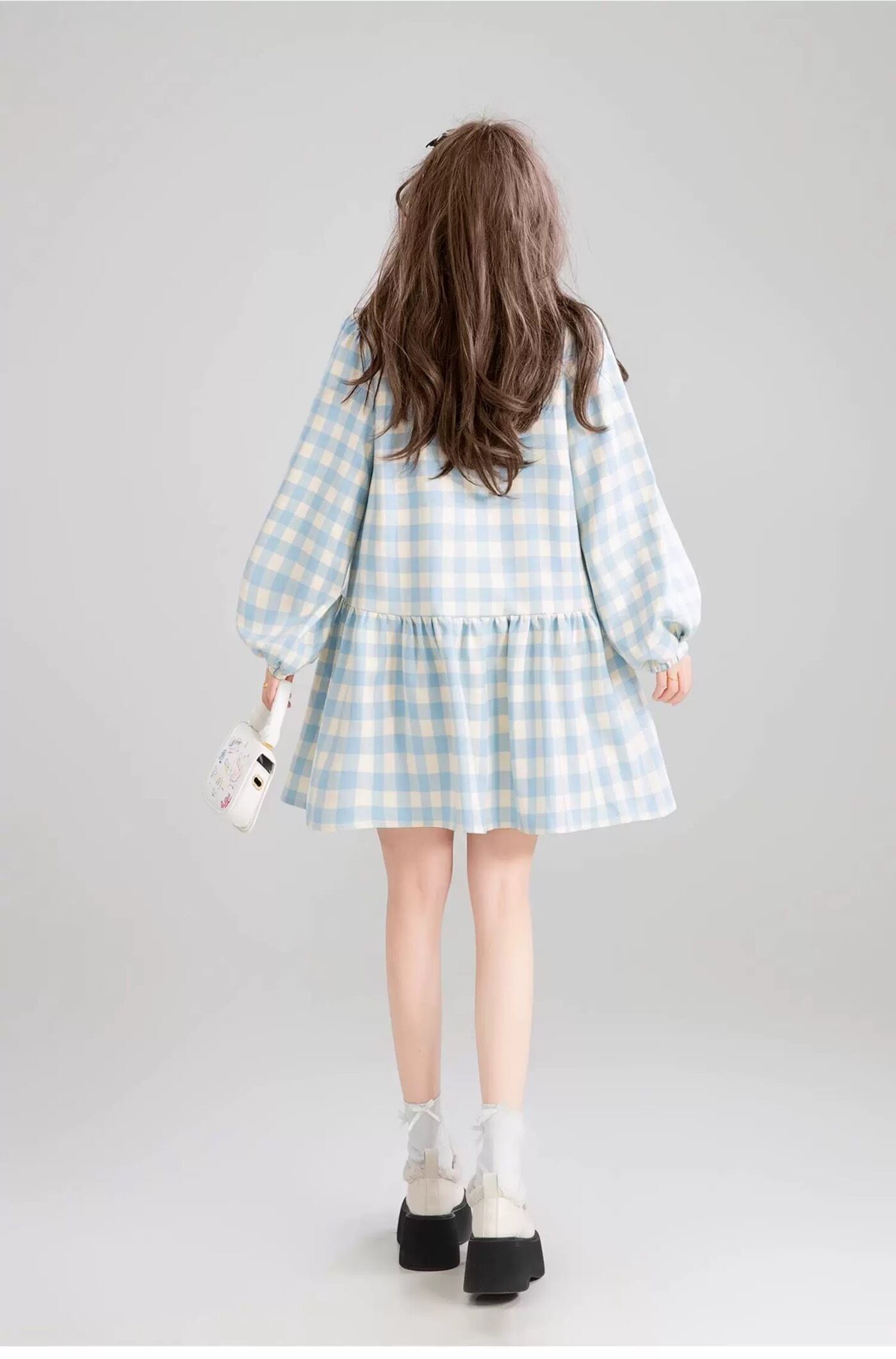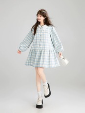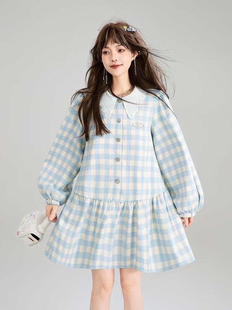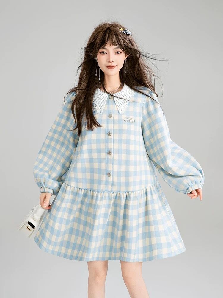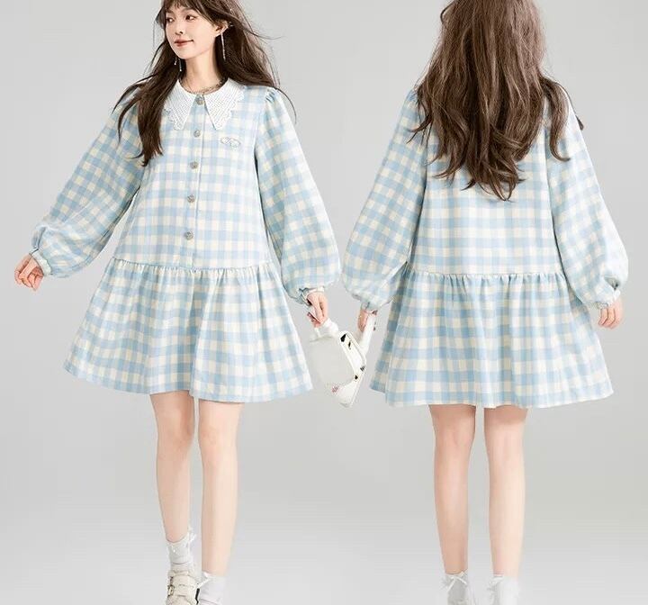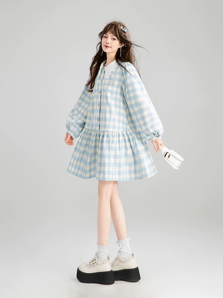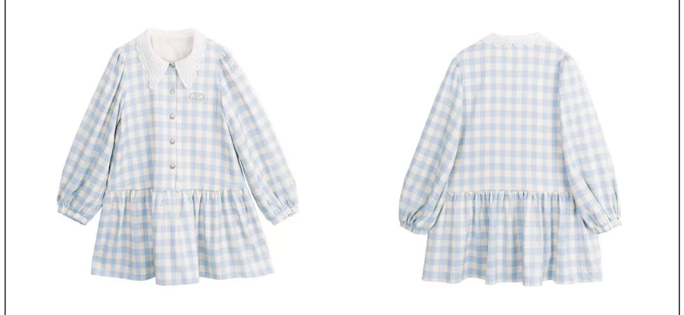 爽やか 水色 チェック ワンピース ガーリー ブラウス