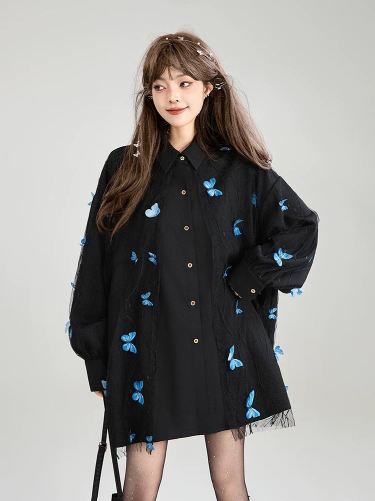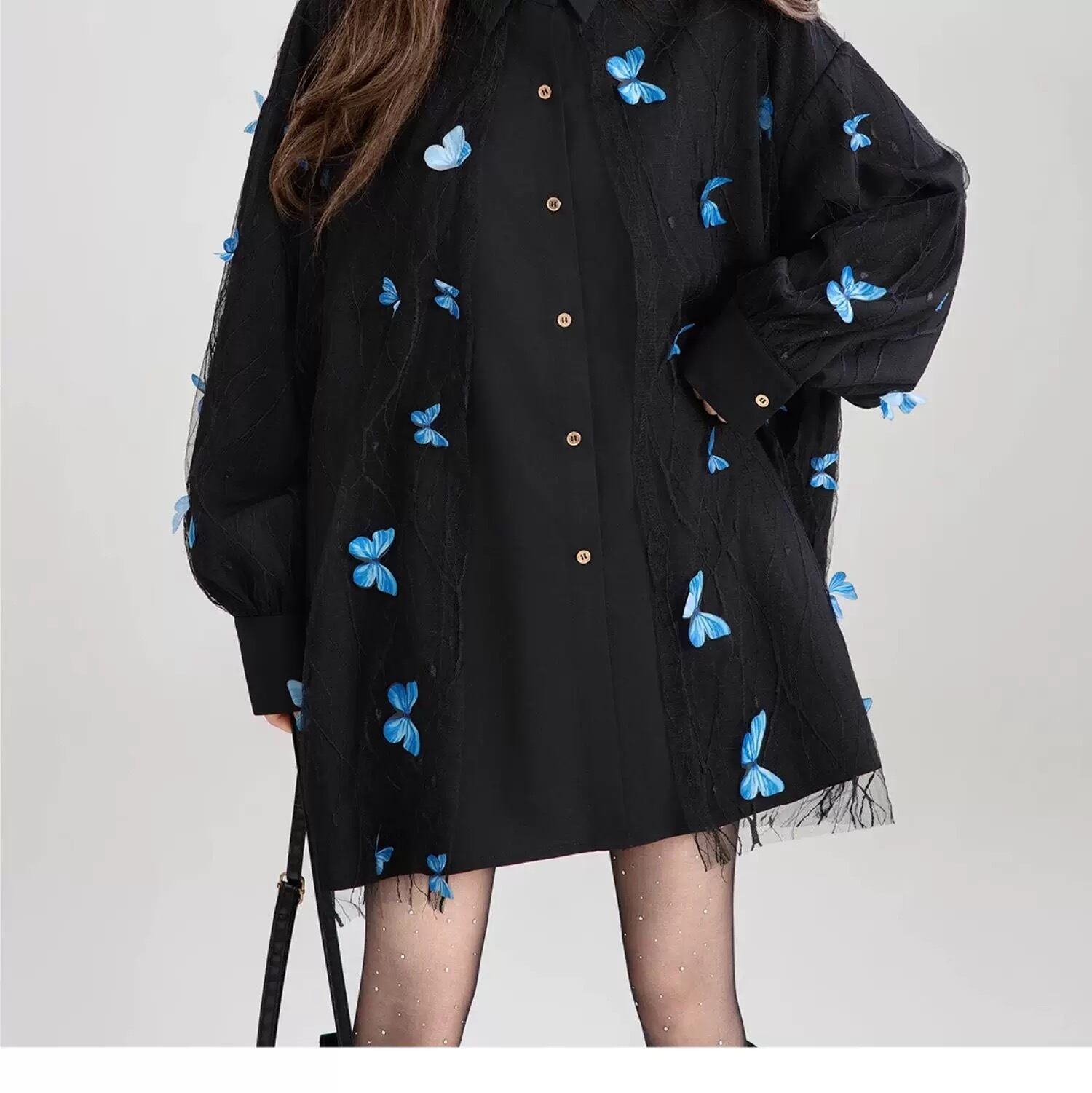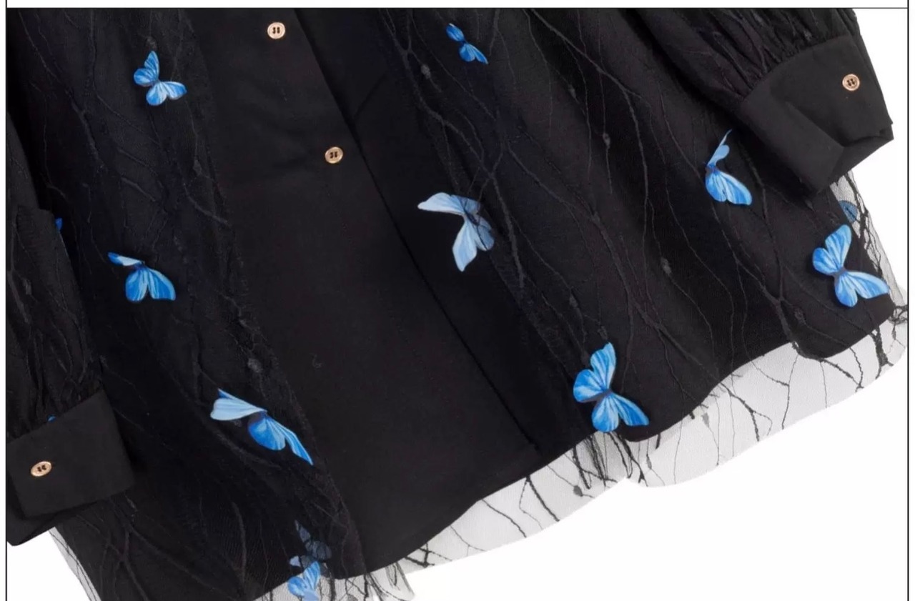 黒 水色 バタフライ 蝶々 ブラウス シャツ XL