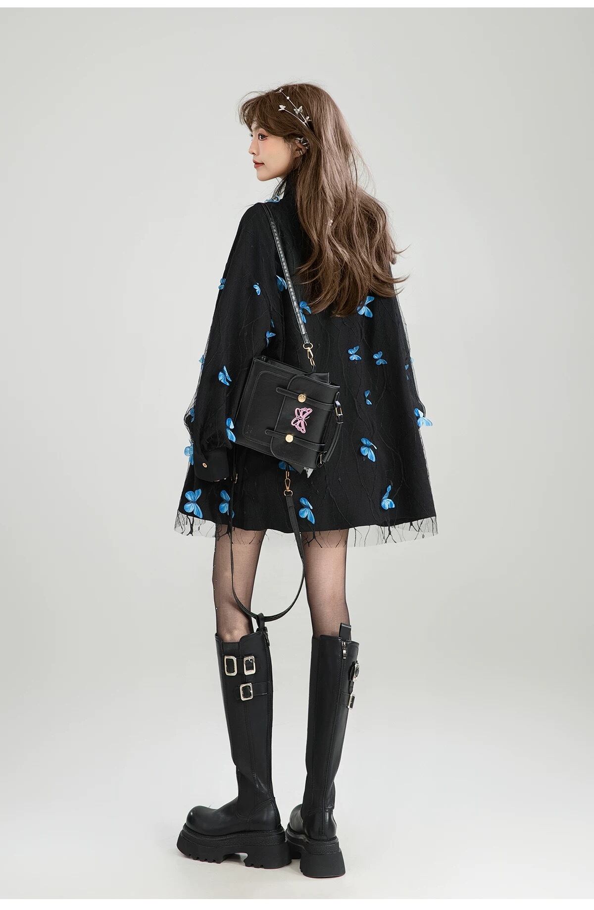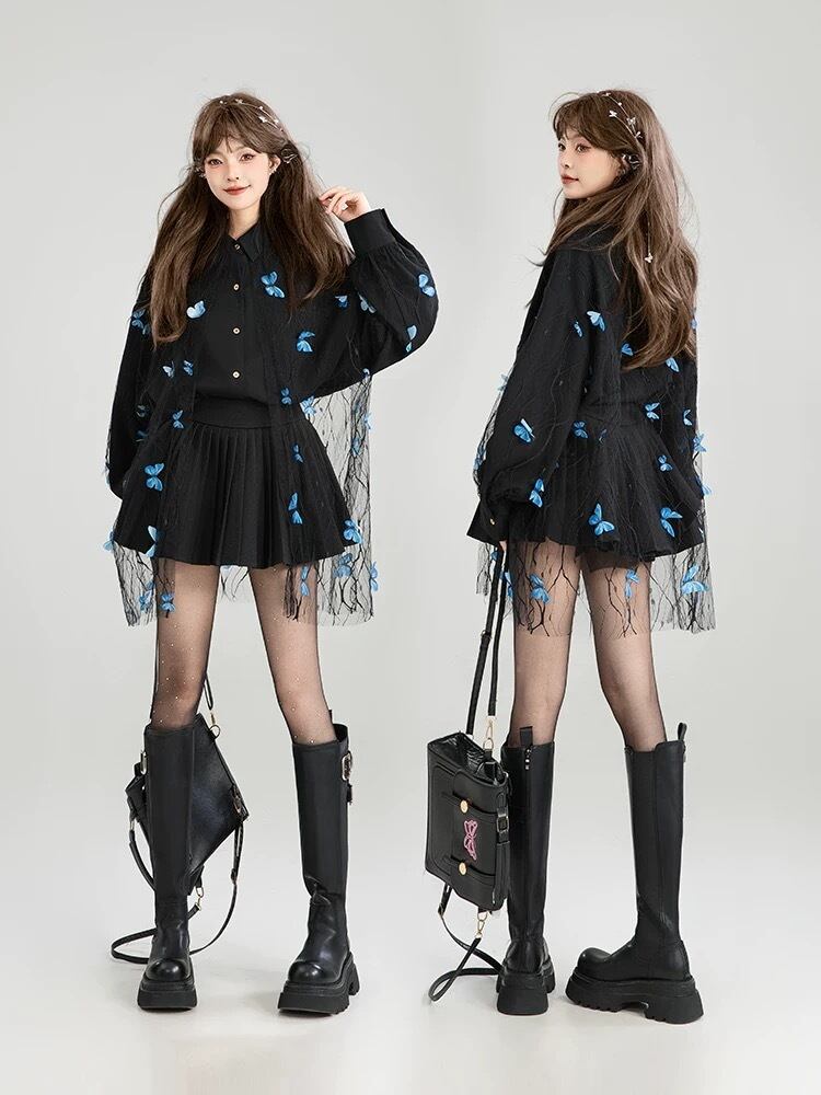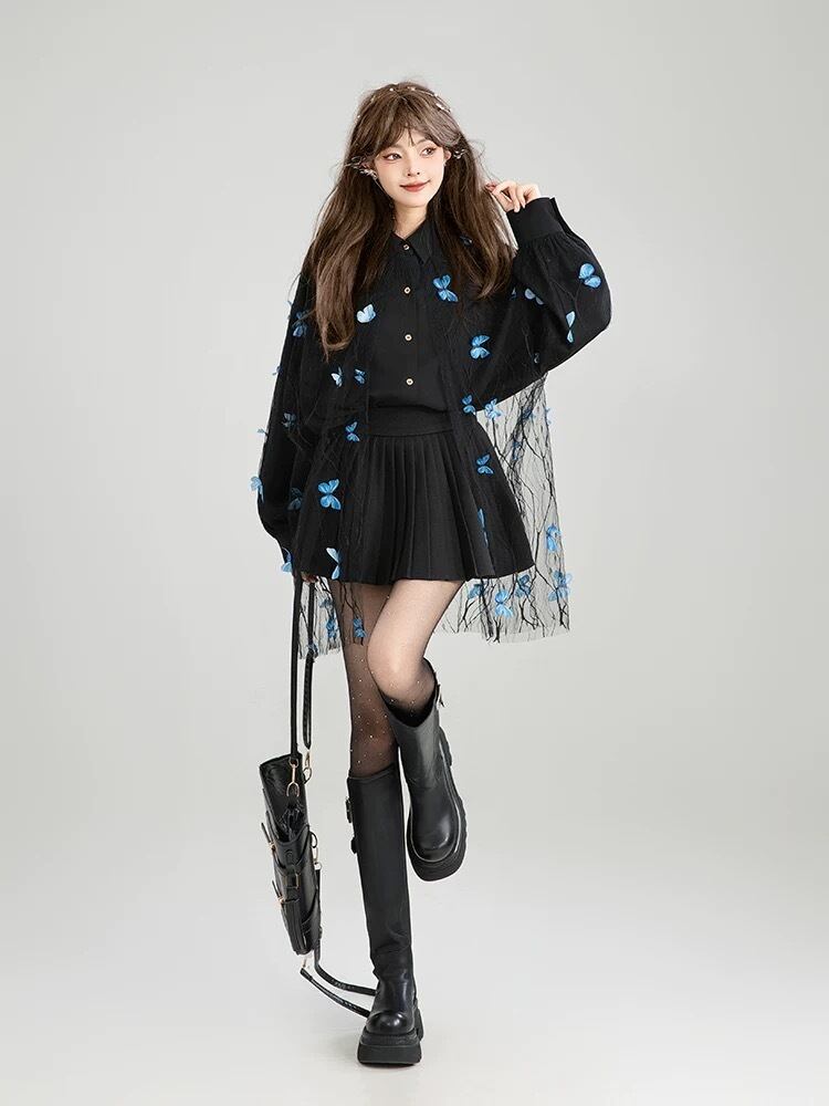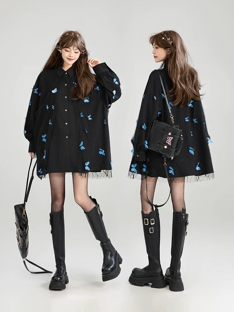 黒 水色 バタフライ 蝶々 ブラウス シャツ XL