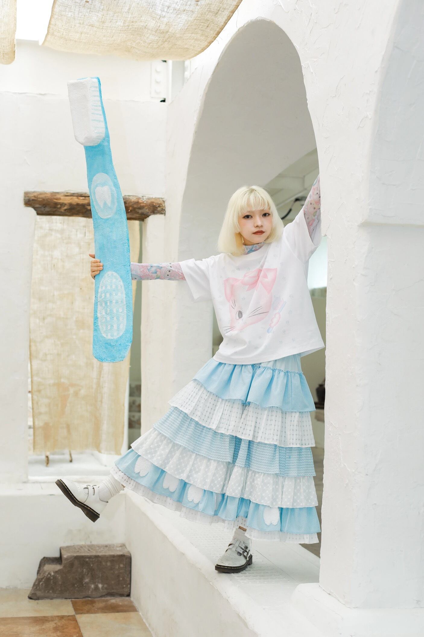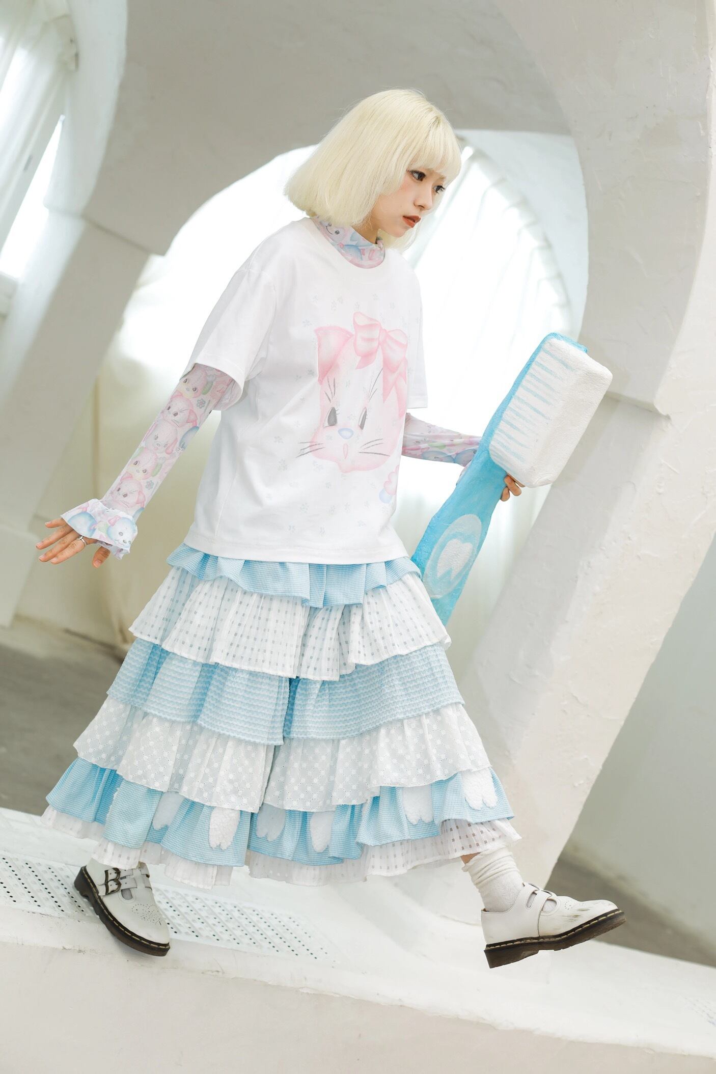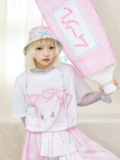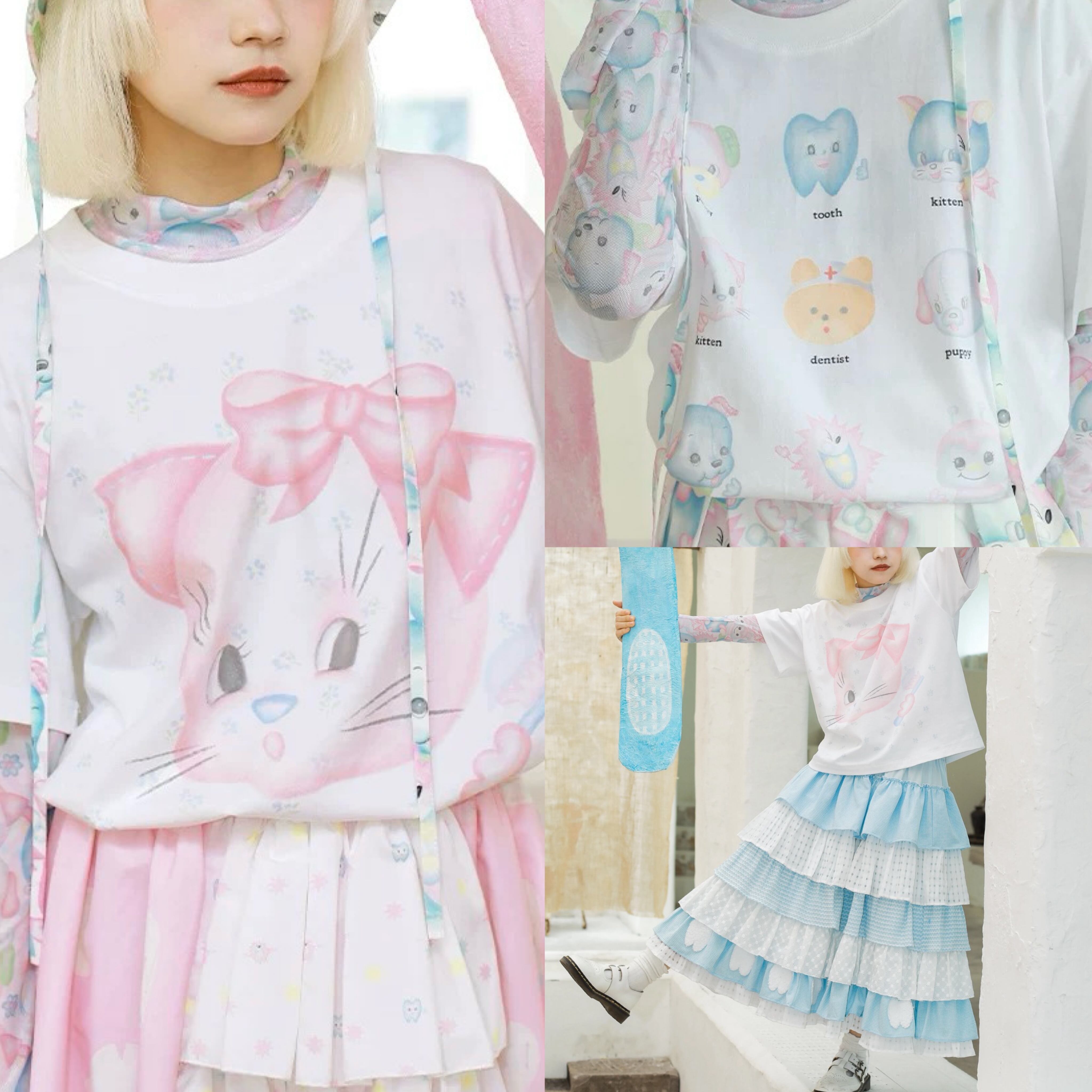 猫 ねこ みみ 可愛い 水色 Tシャツ リボン