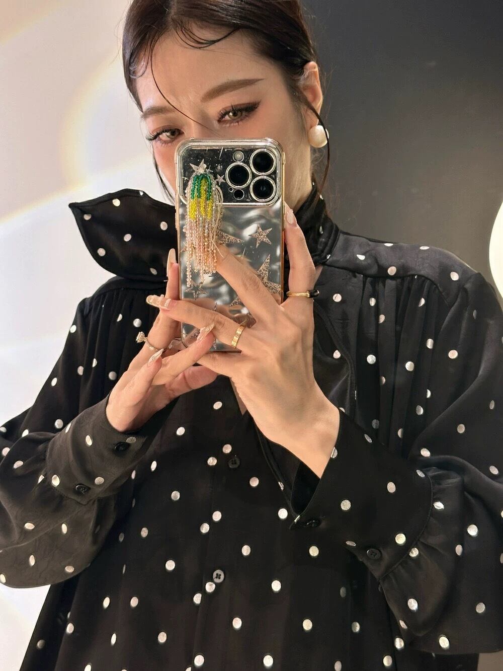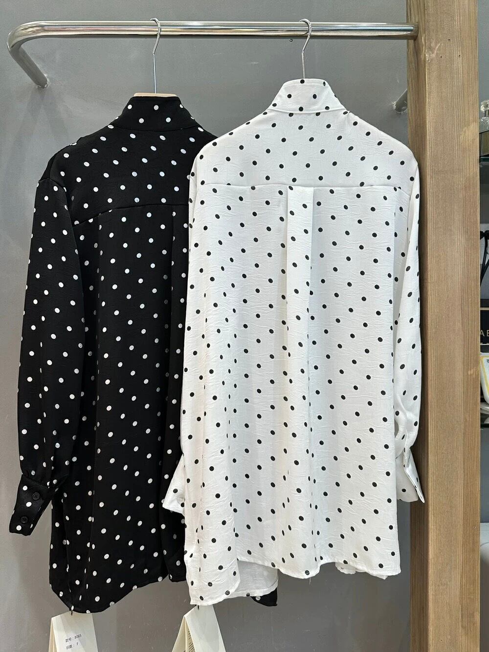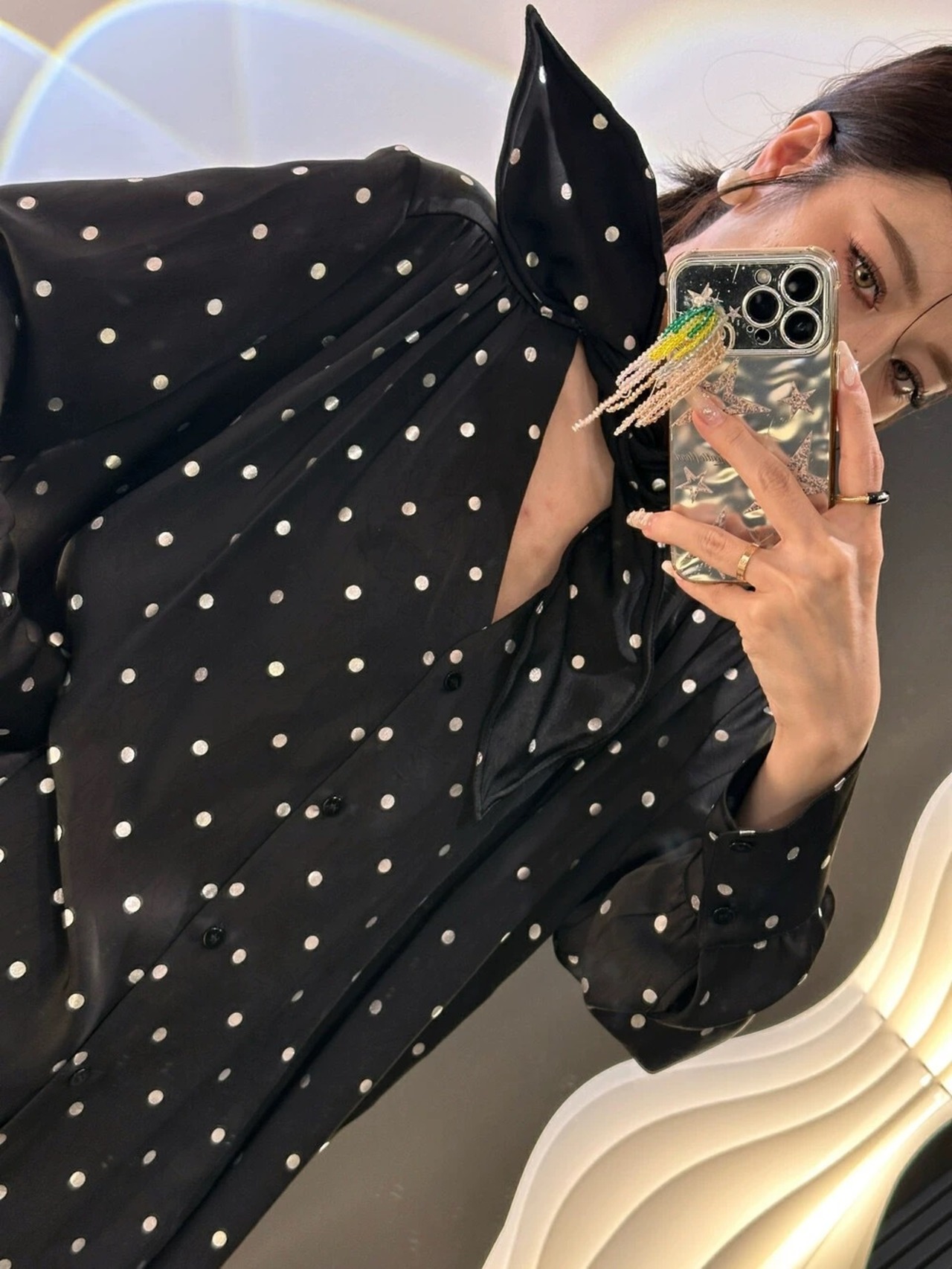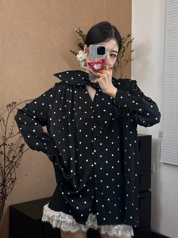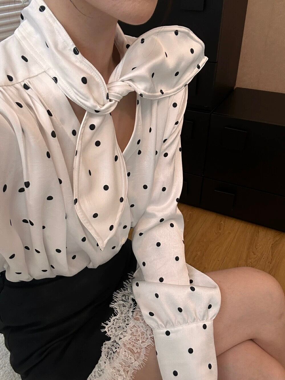 黒 白 水玉 ドット リボン ブラウス シャツ