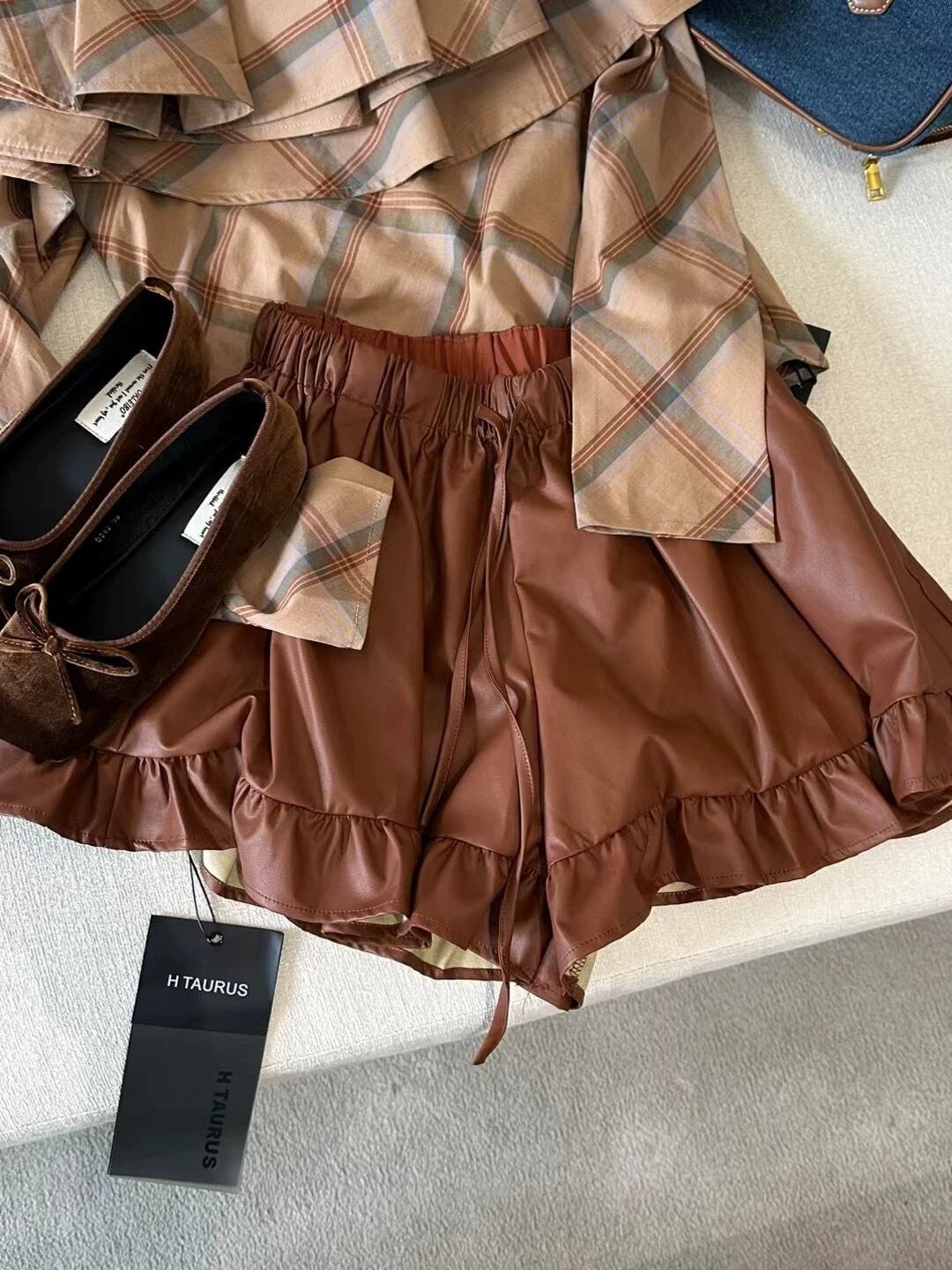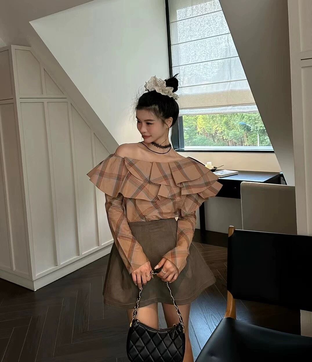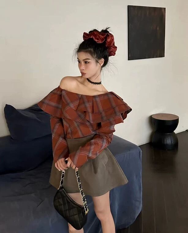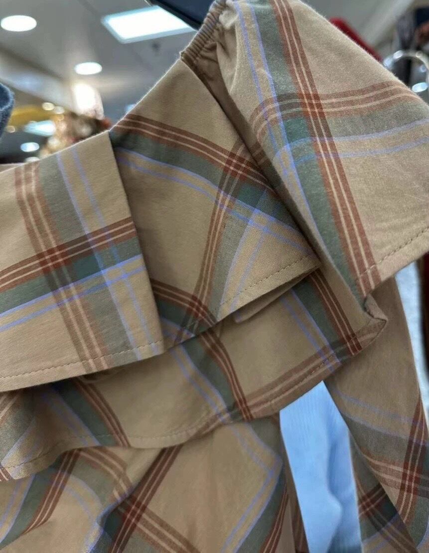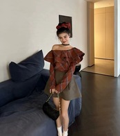 赤 チェック ベージュ ブラウス トップス オフショルダー