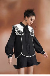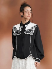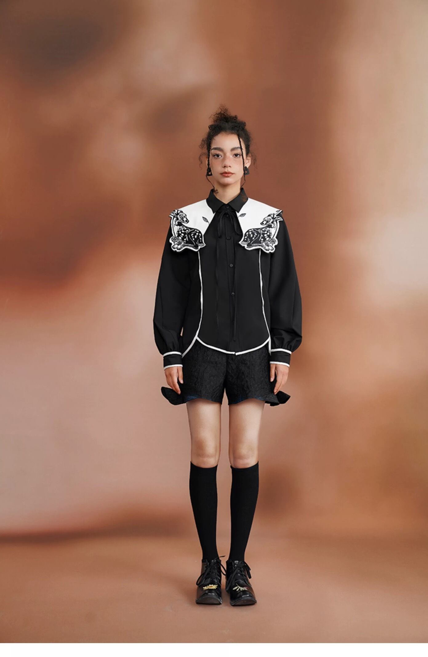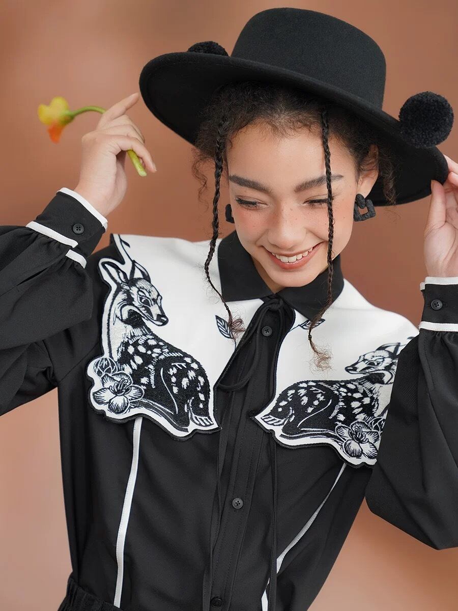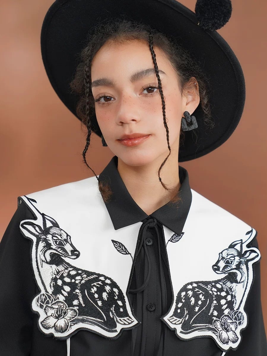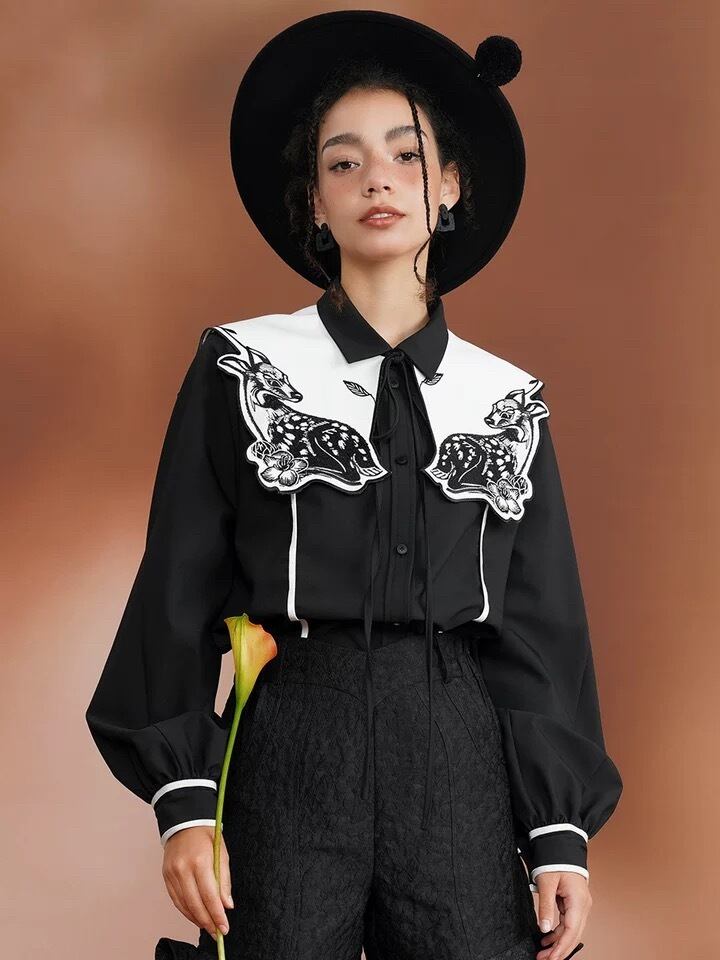 襟付き】ブラウス 白 黒 つけ襟 バンビ 鹿 アニマル デカ襟