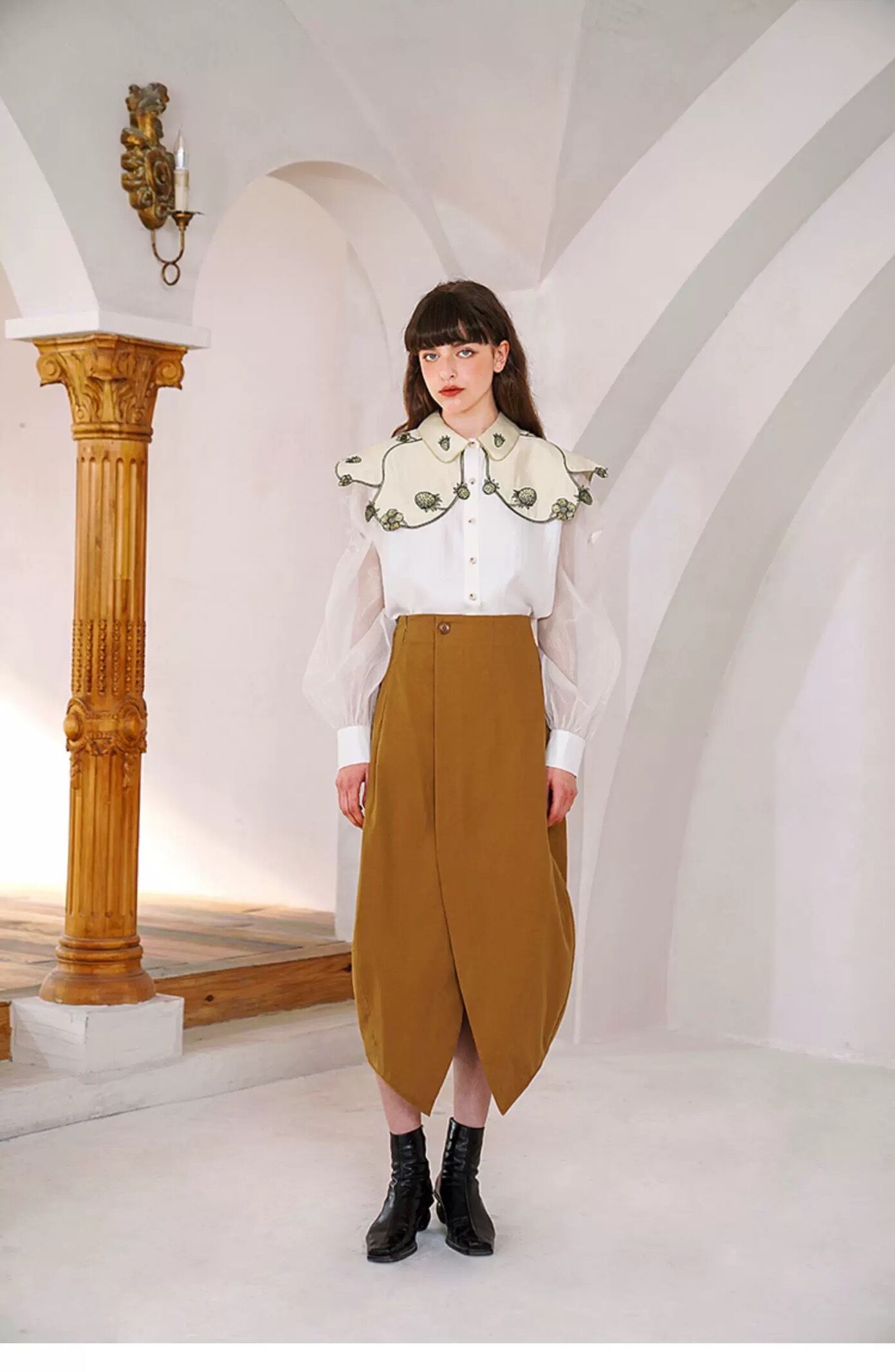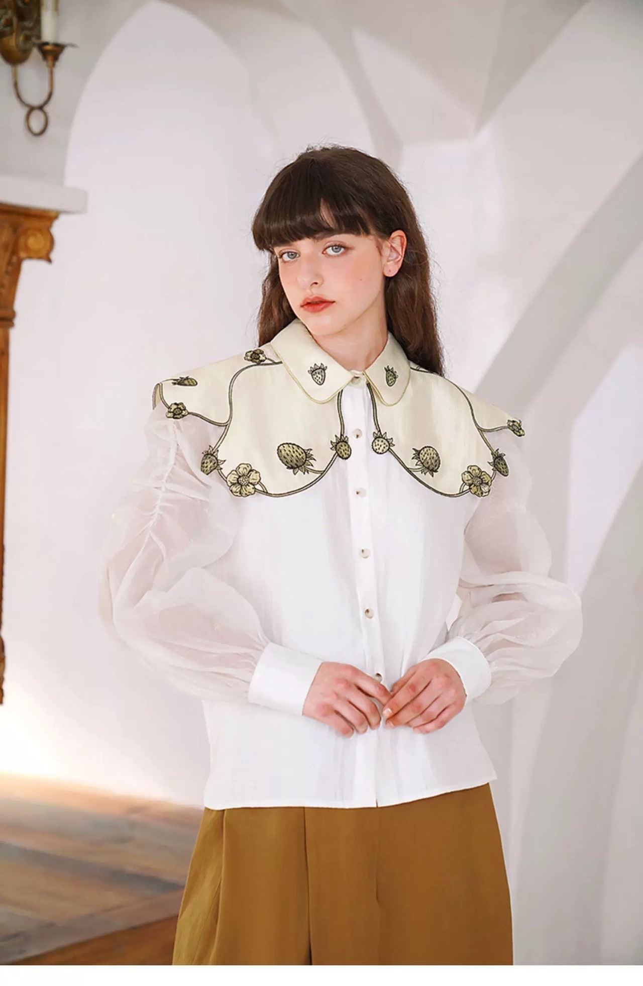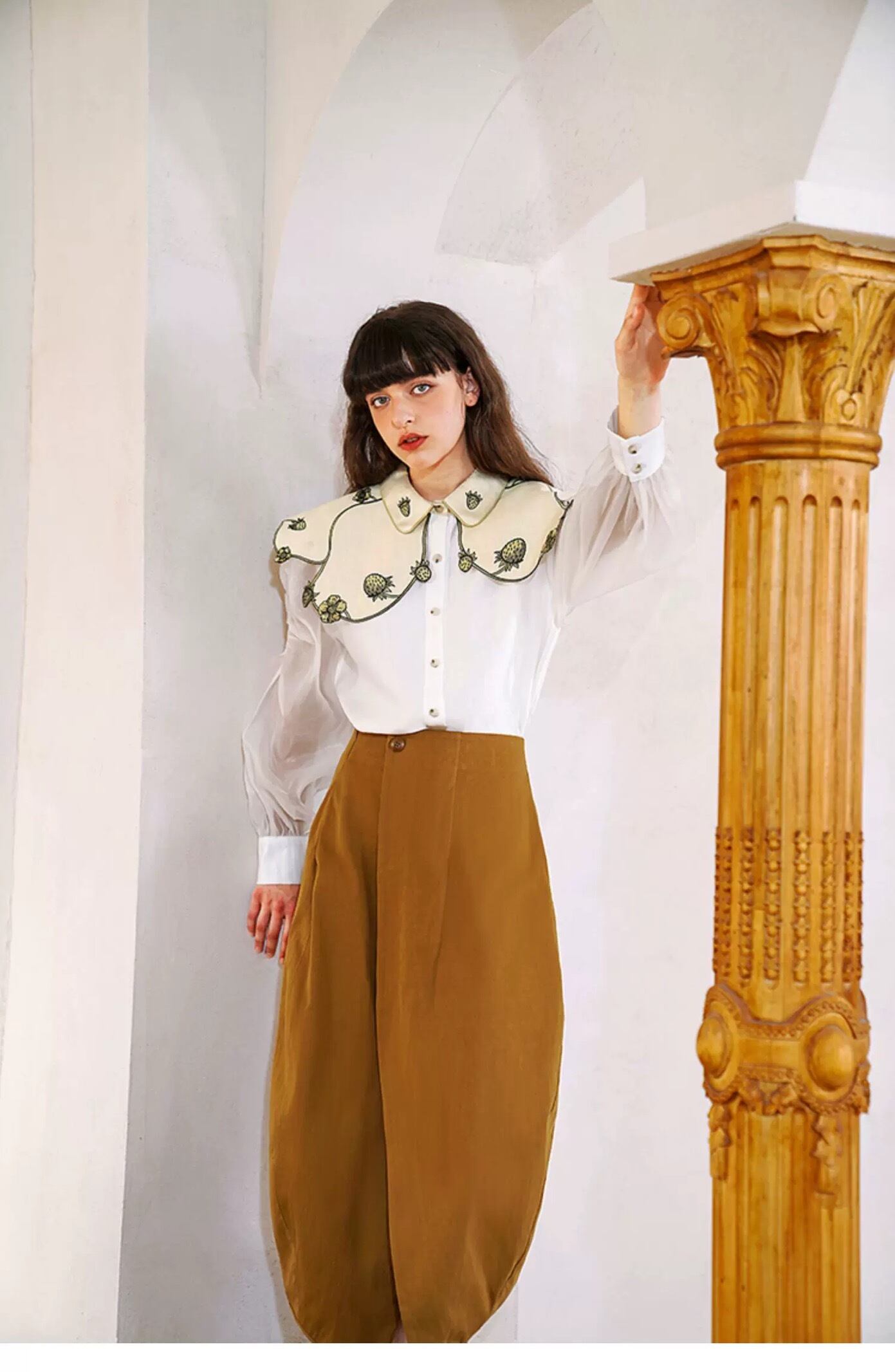 デカ襟 フルーツ 丸襟 白 緑 ブラウス