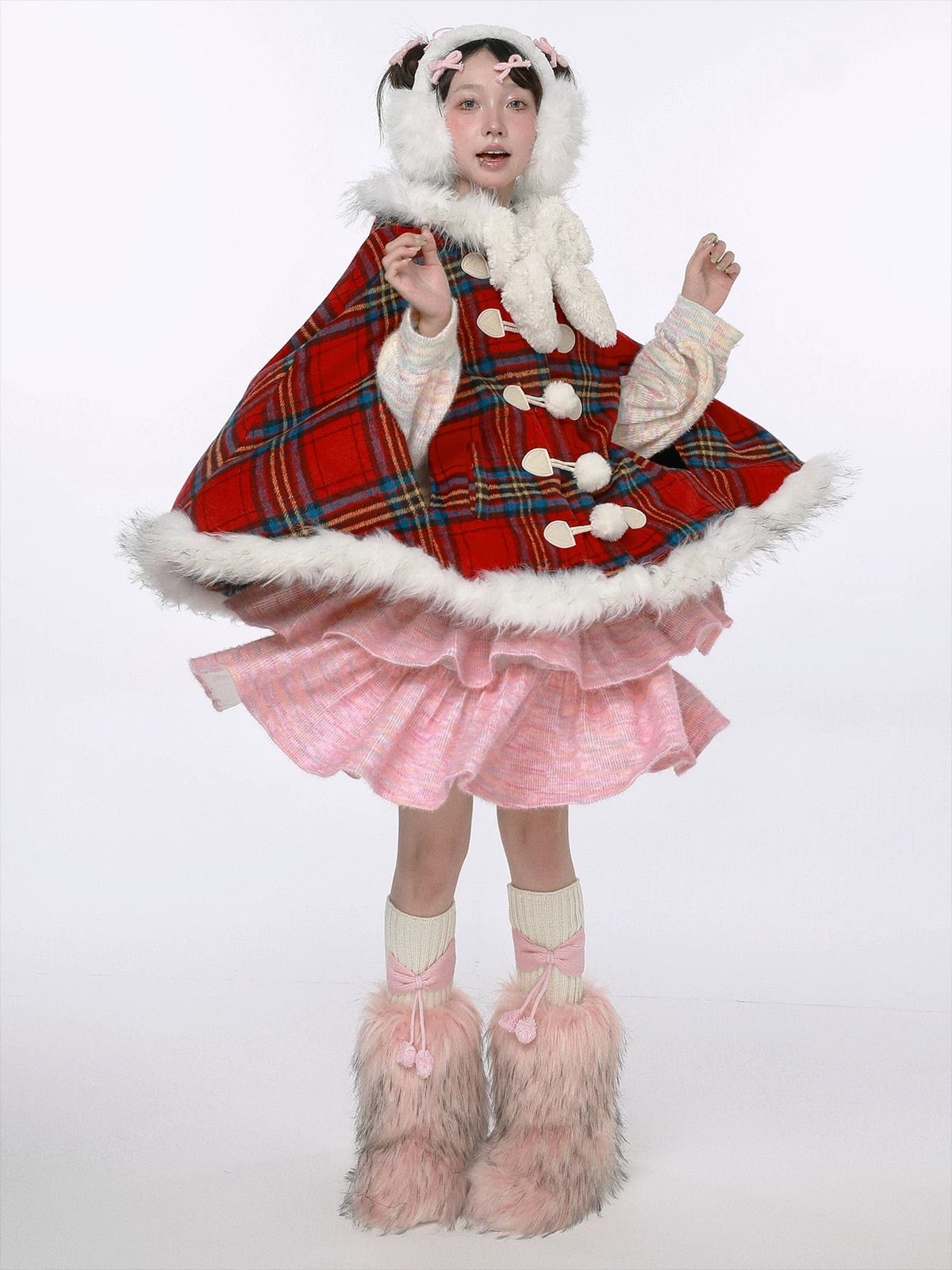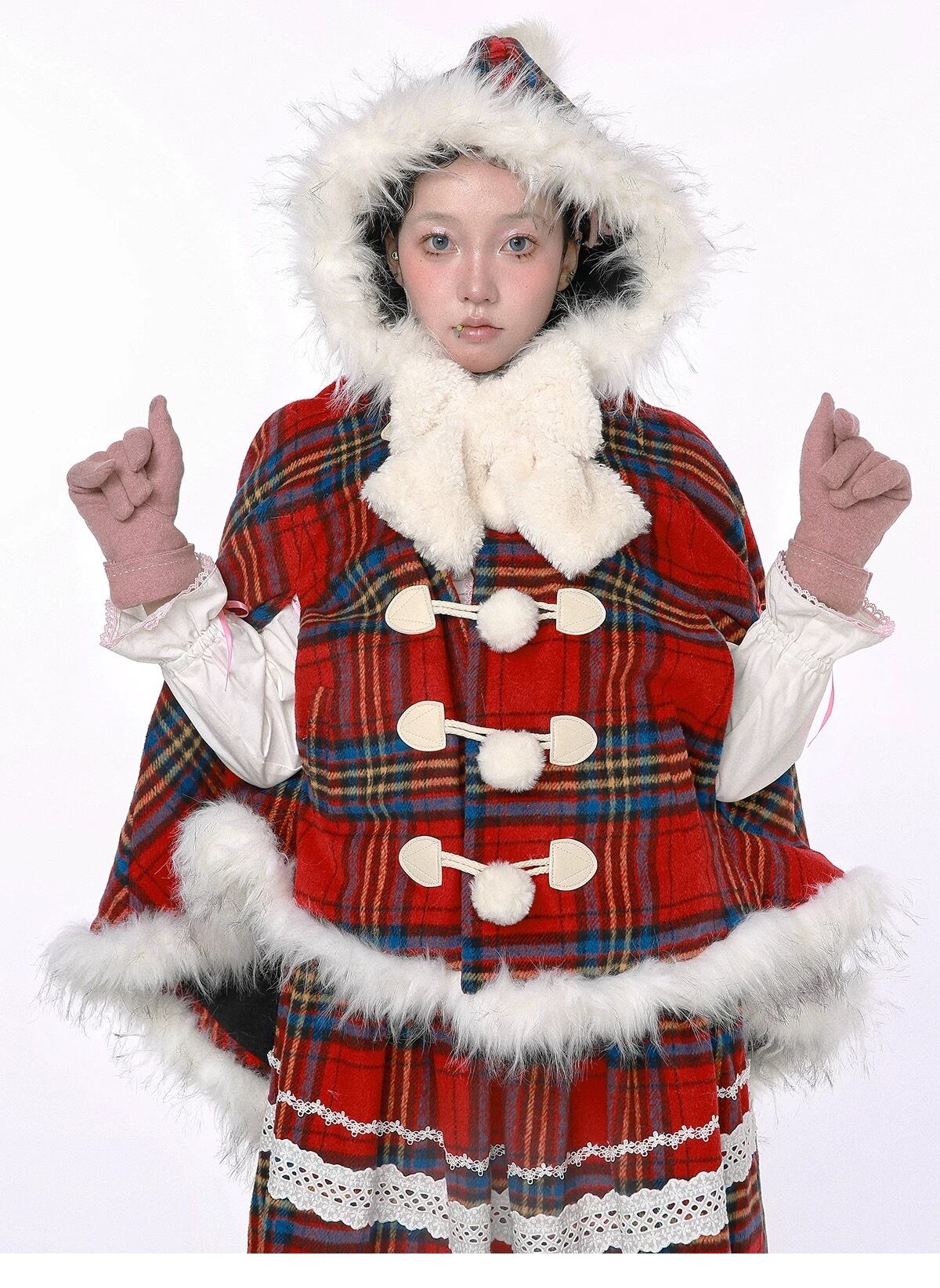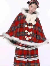 赤 チェック マント アウター コート チェック ファー フード