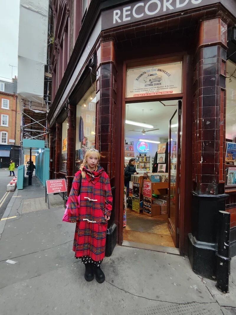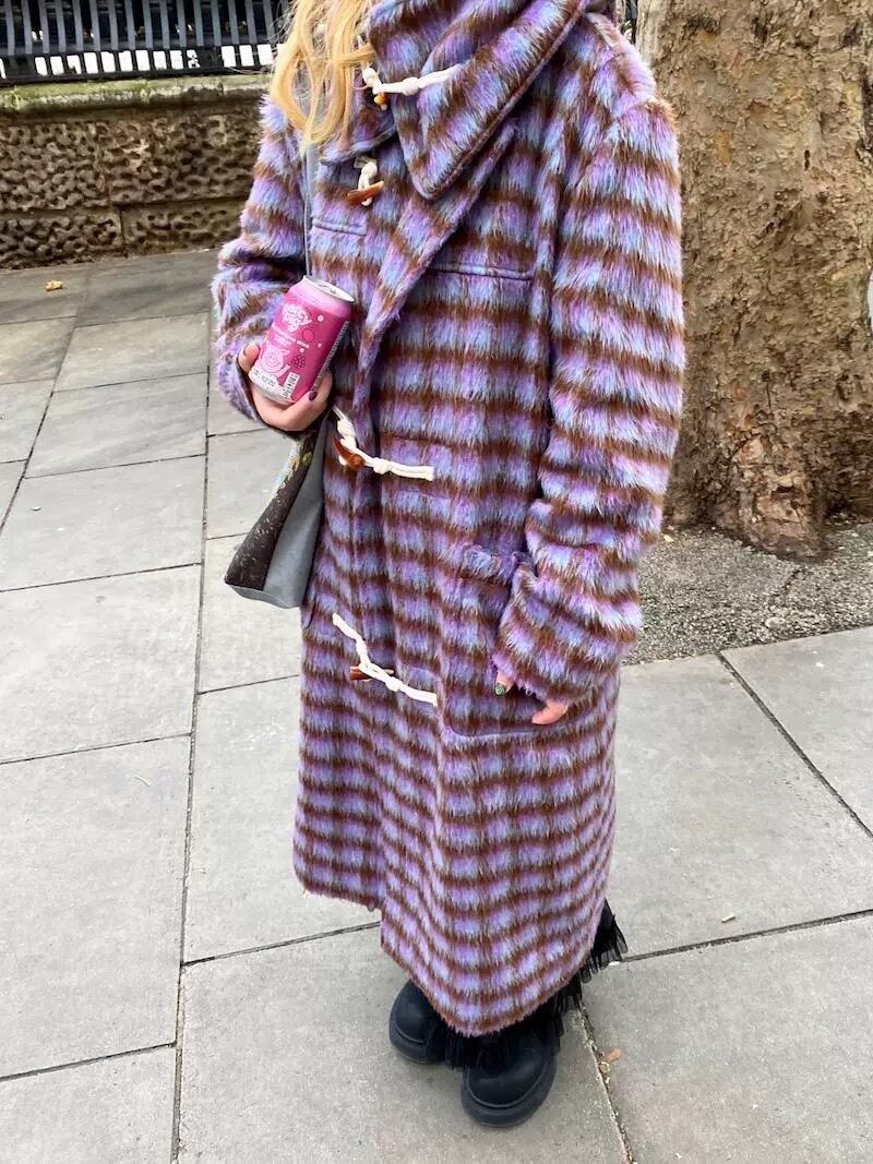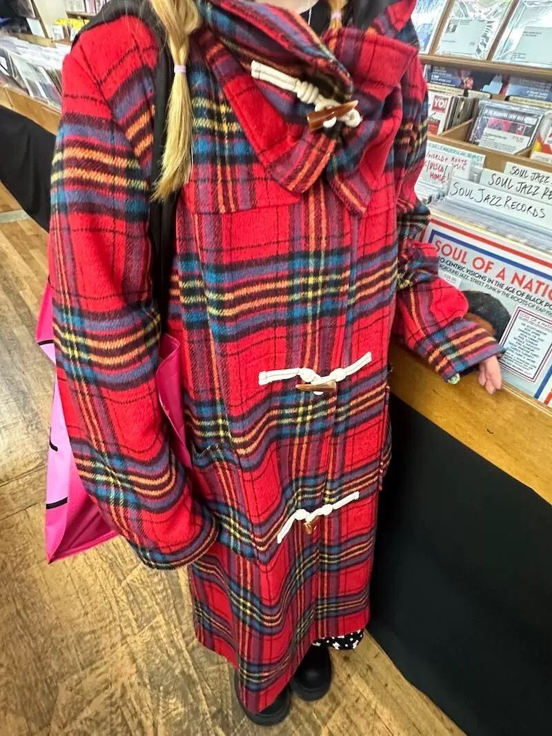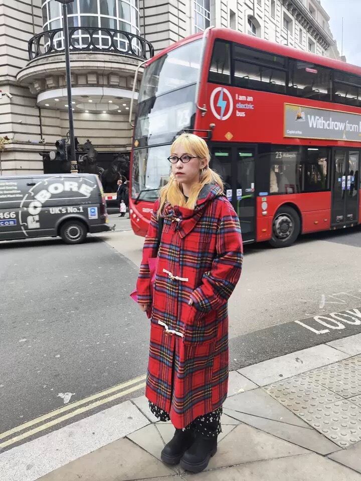 赤 フード マフラー 紫 チェック ワンピース コート