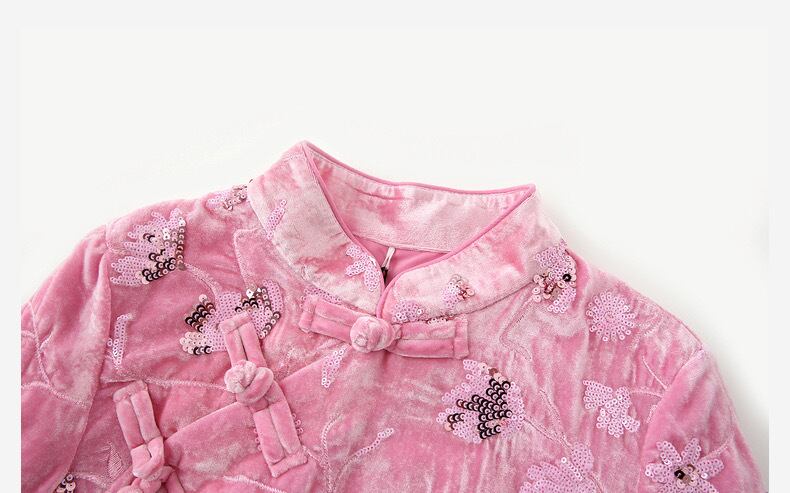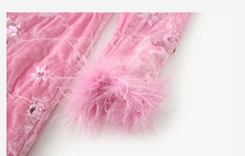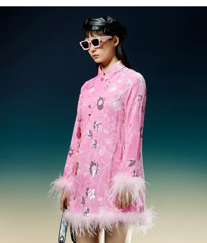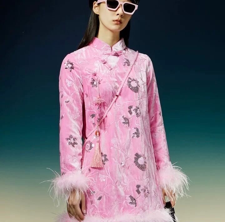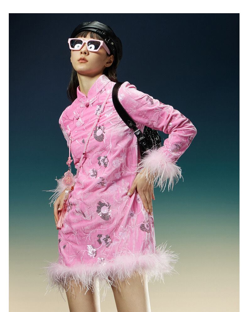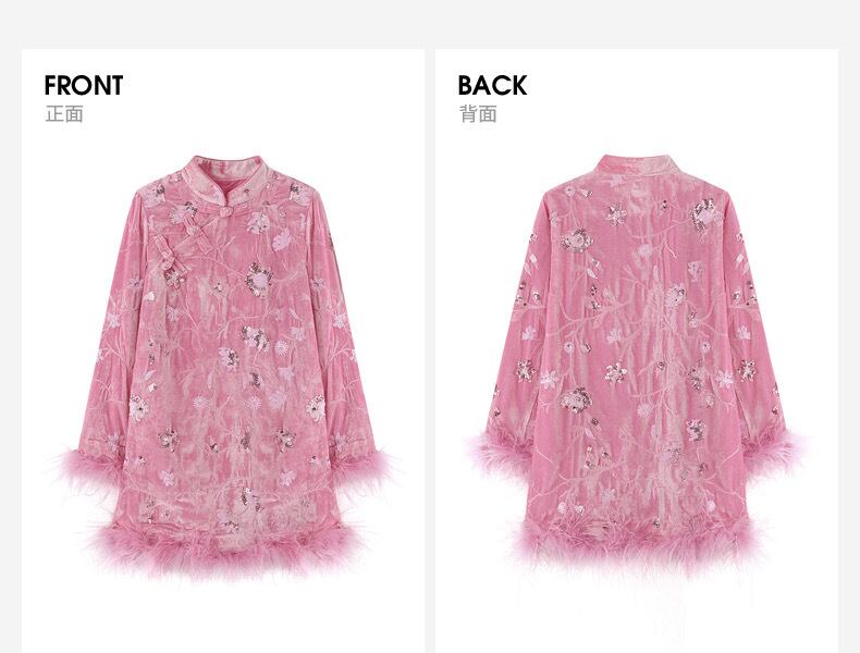 チャイナ服 ピンク スパンコール ファー XL ワンピース ドレス