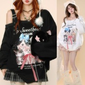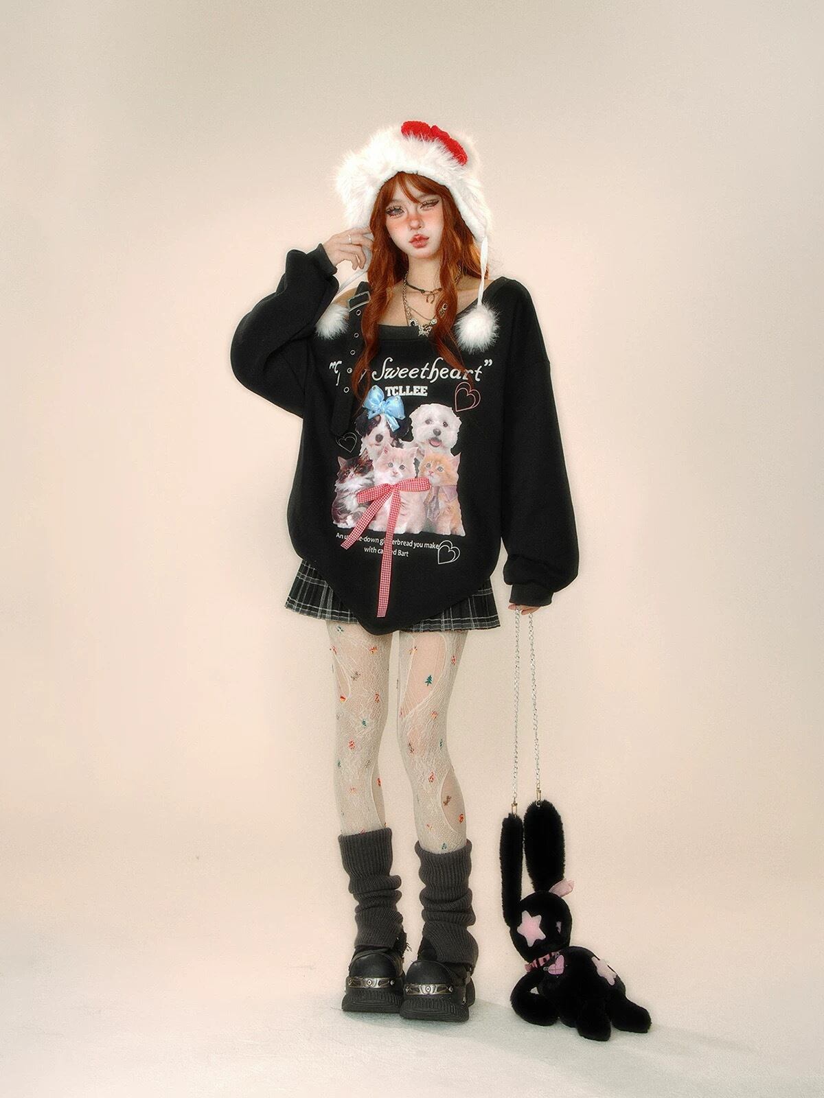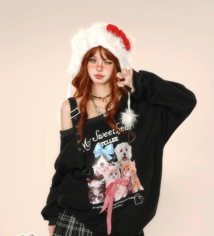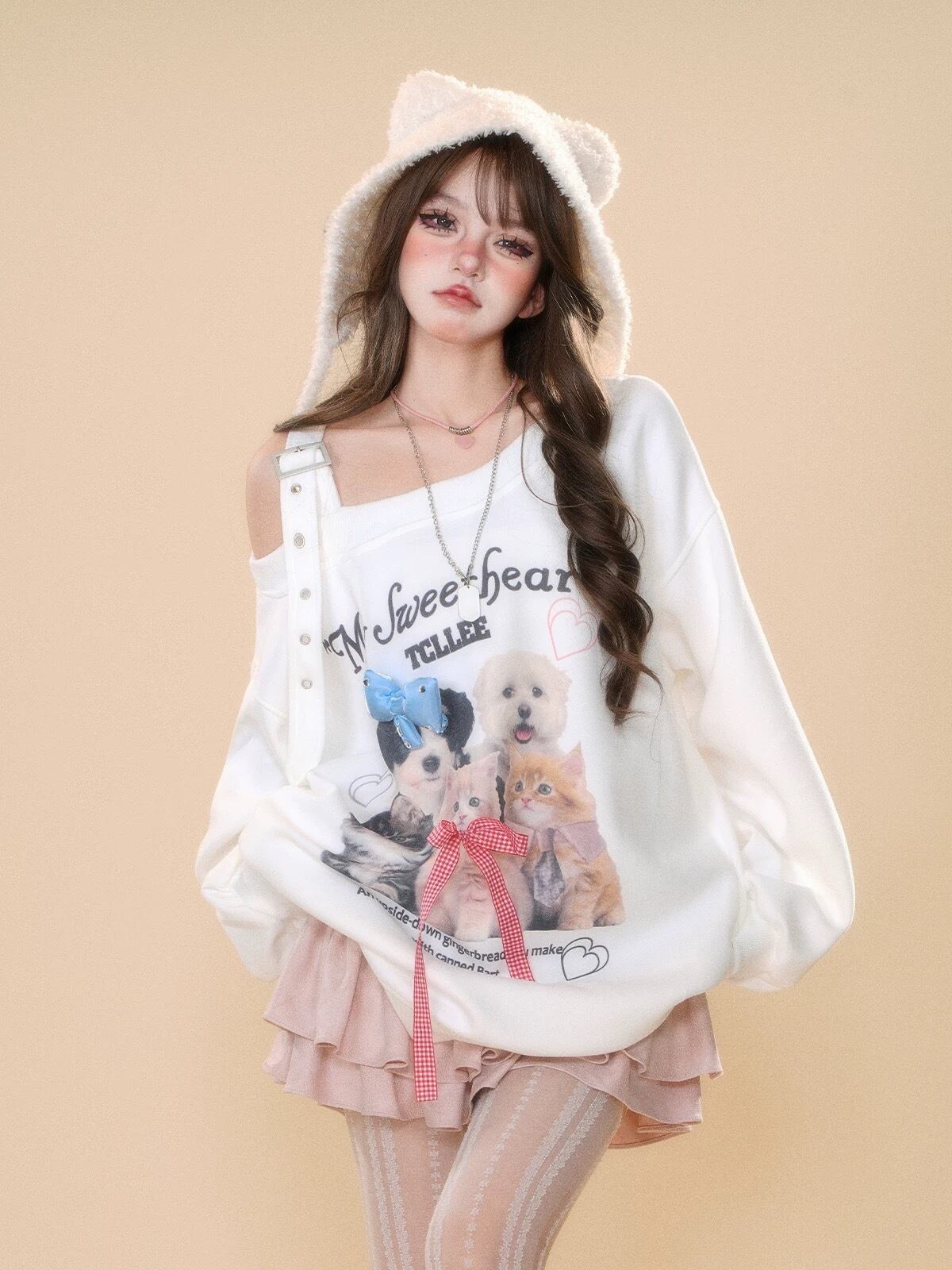 白 黒 ねこ いぬ トレーナー オフショルダー XL