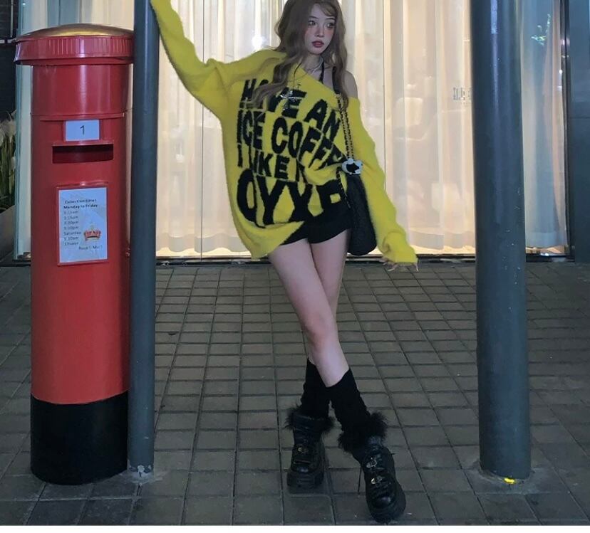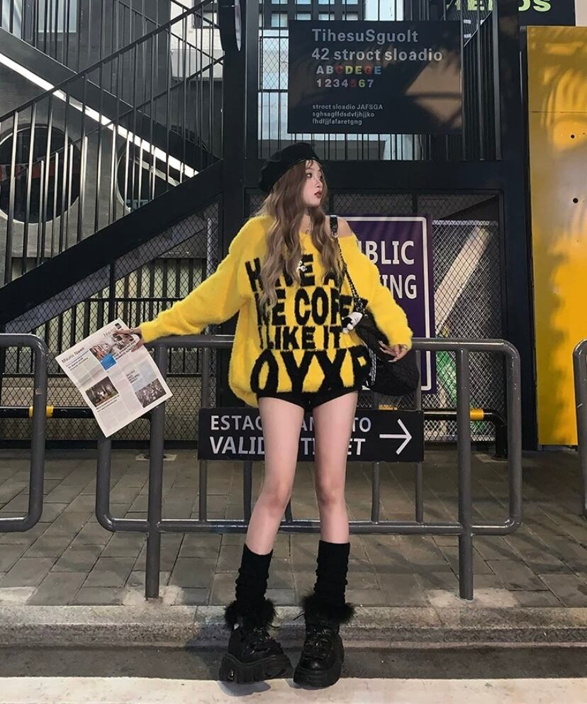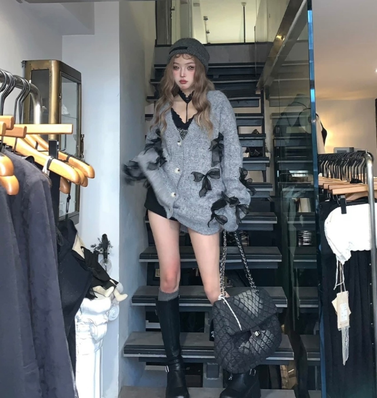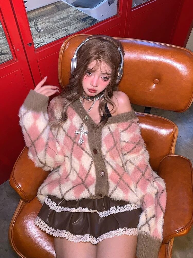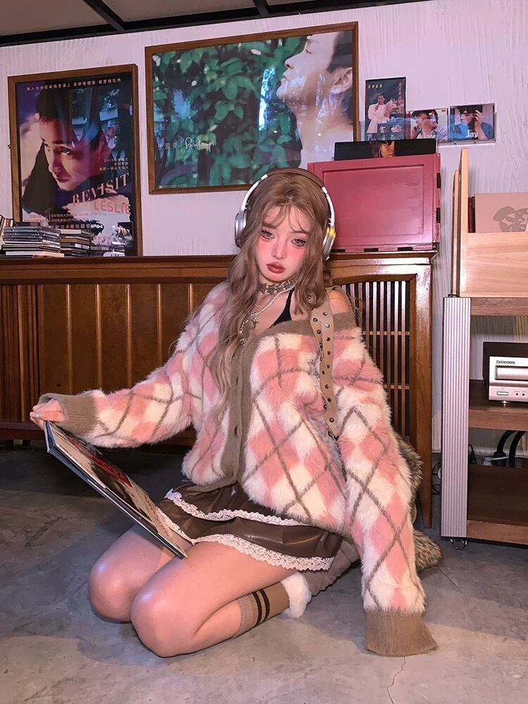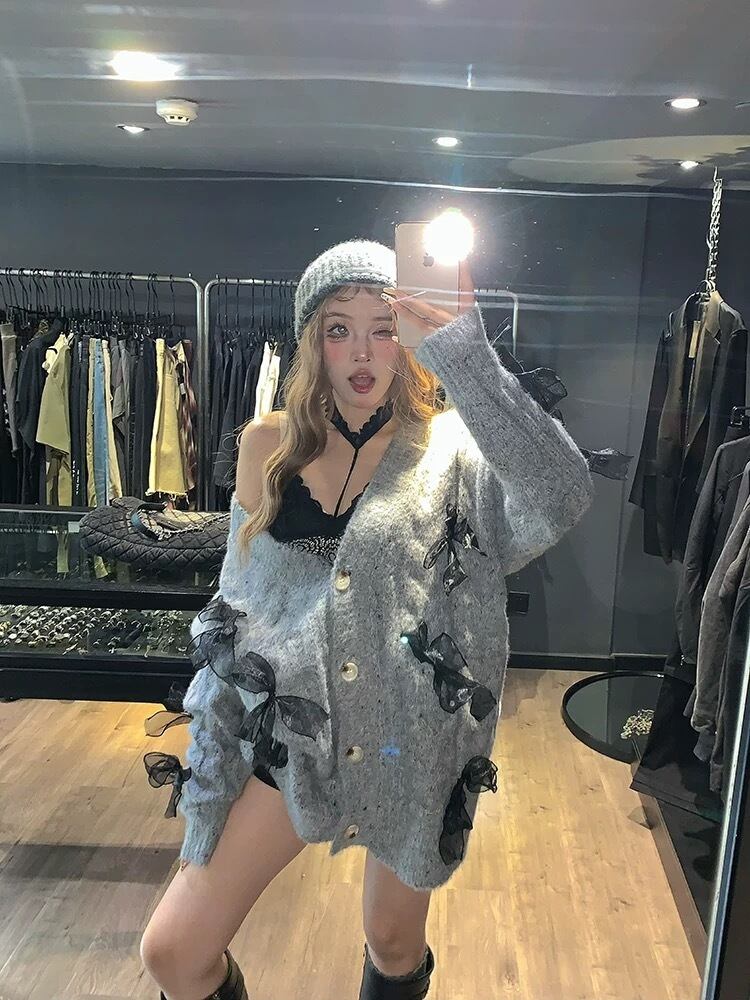 グレー 黄色 セーター カーディガン リボン ピンク チェック