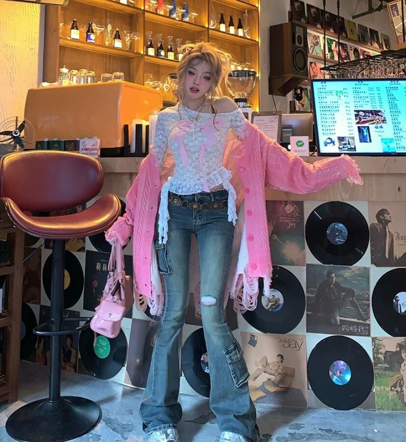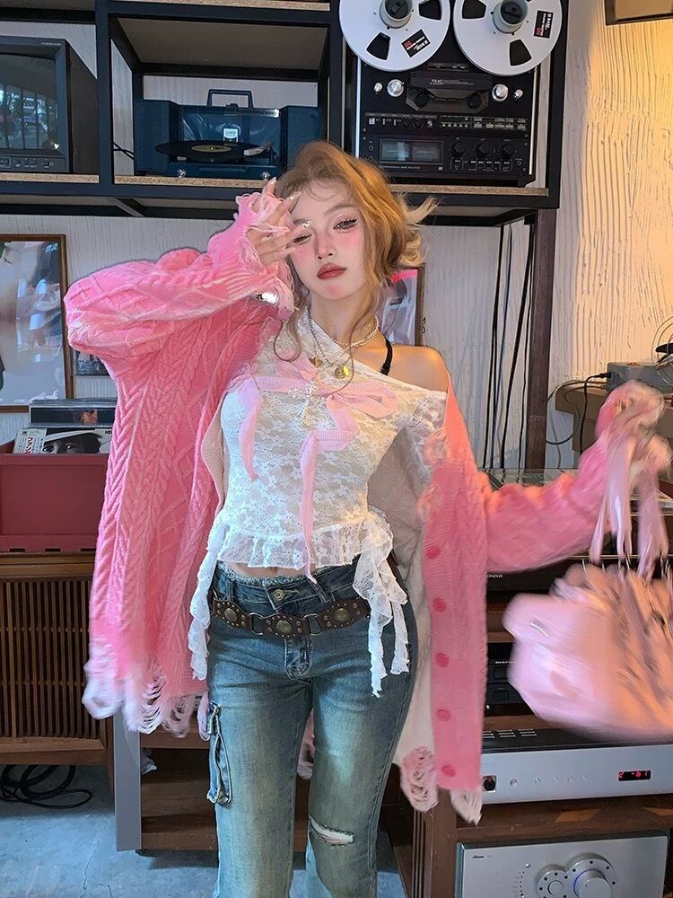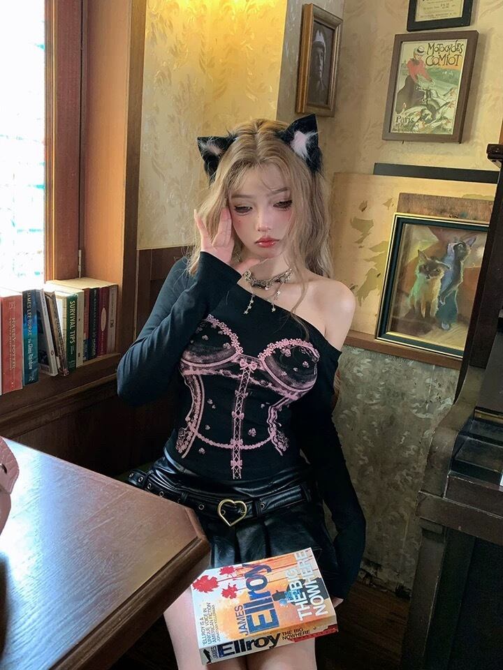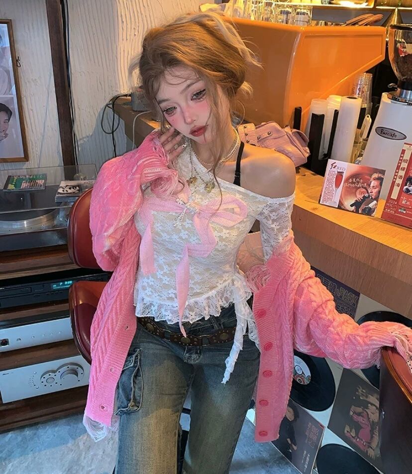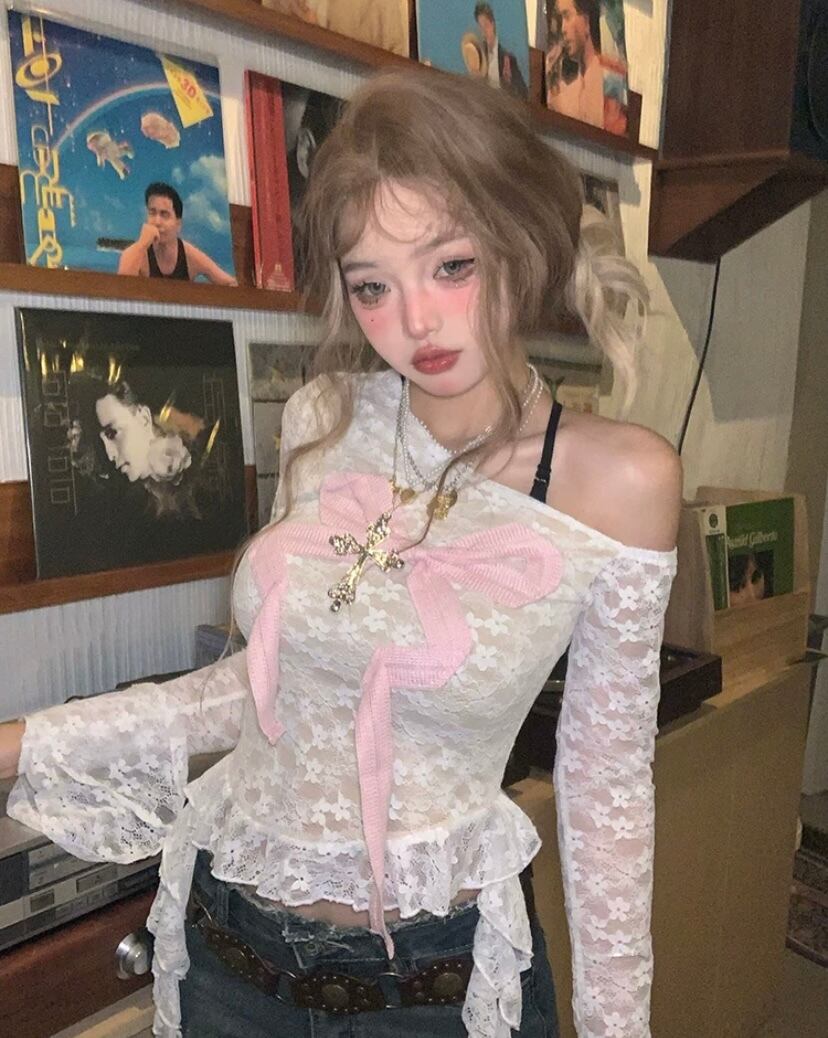 白 ピンク リボン 黒 トップス オフショルダー