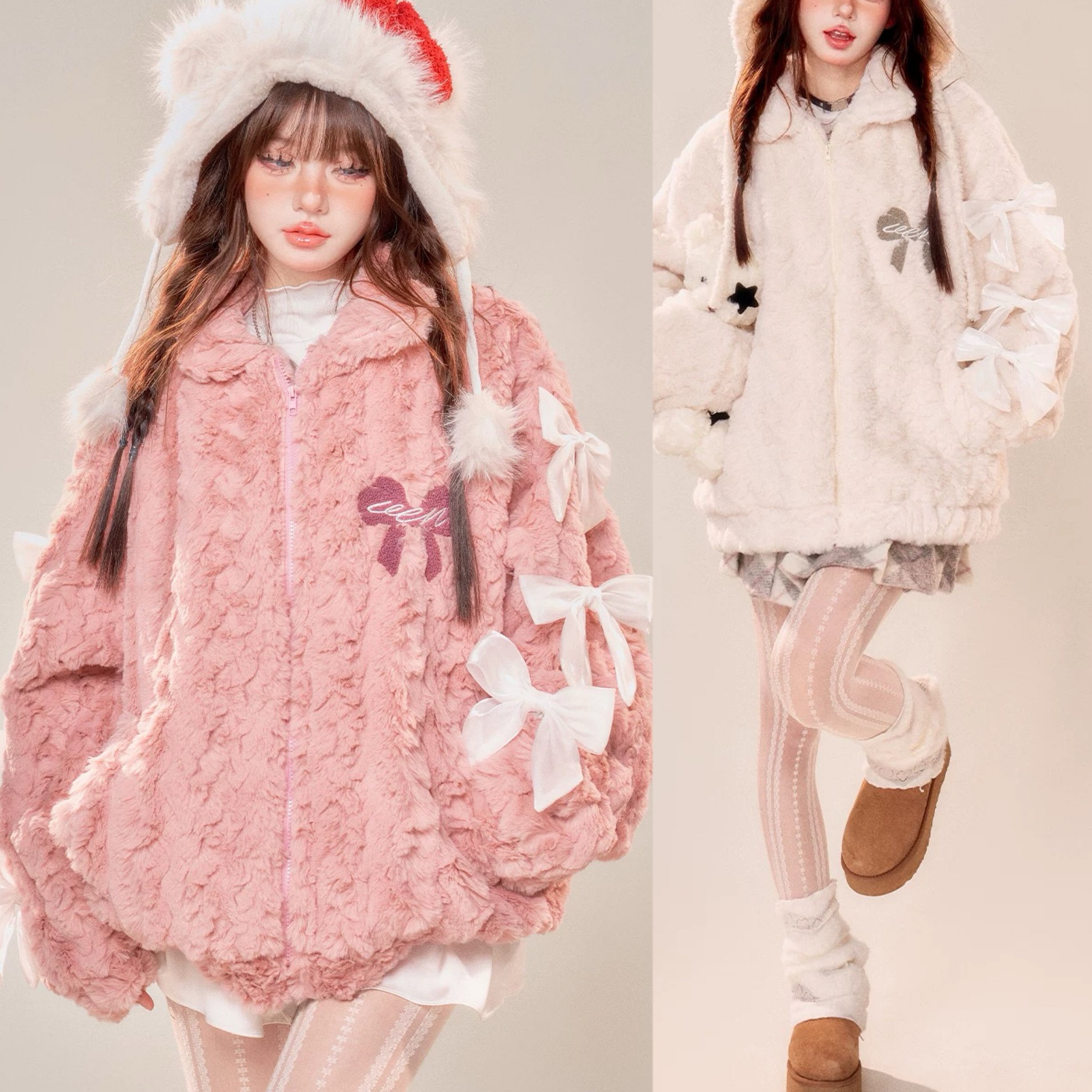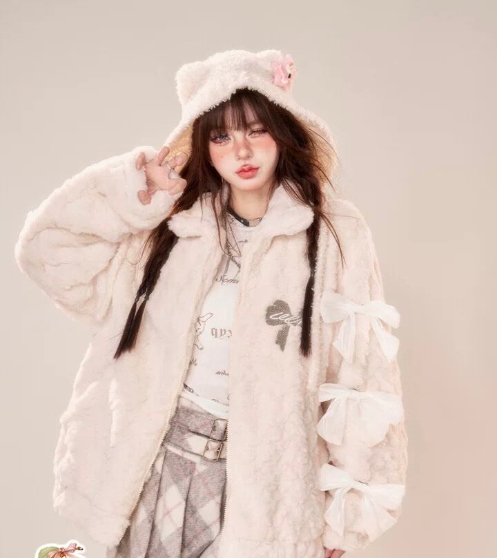 ピンク 白 フリース リボン ジャンパー XL ジャケット