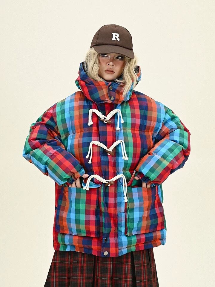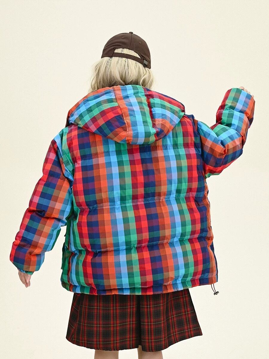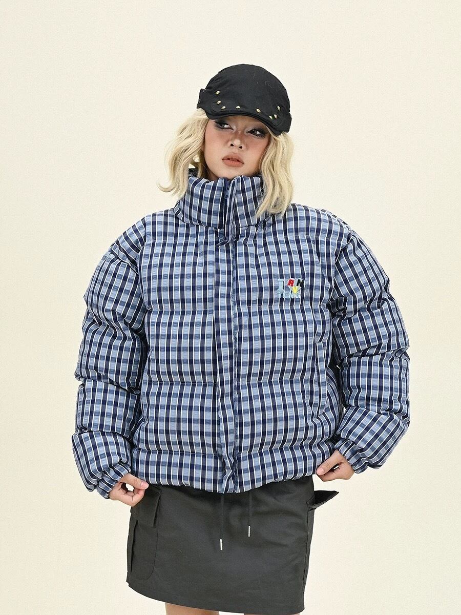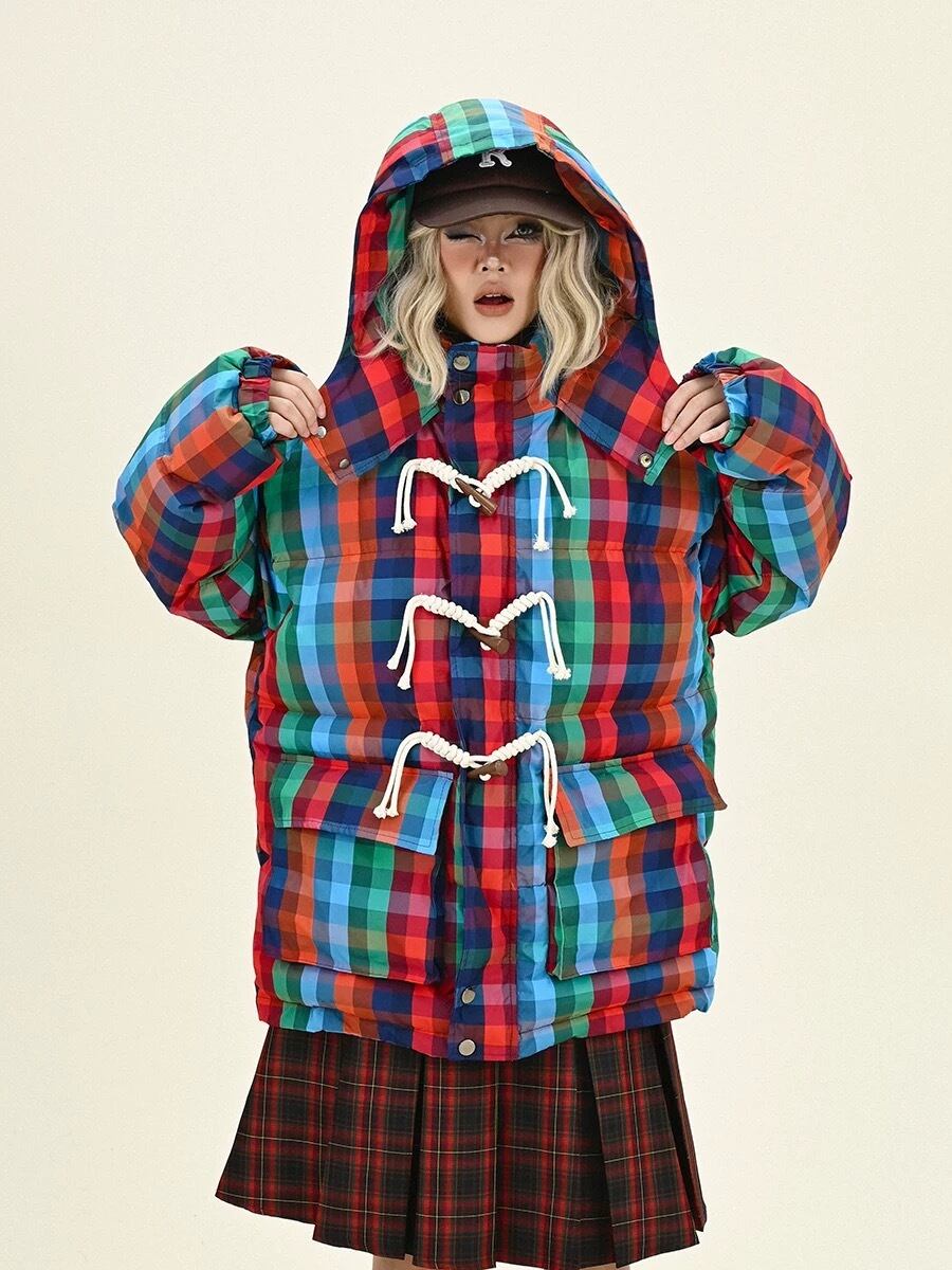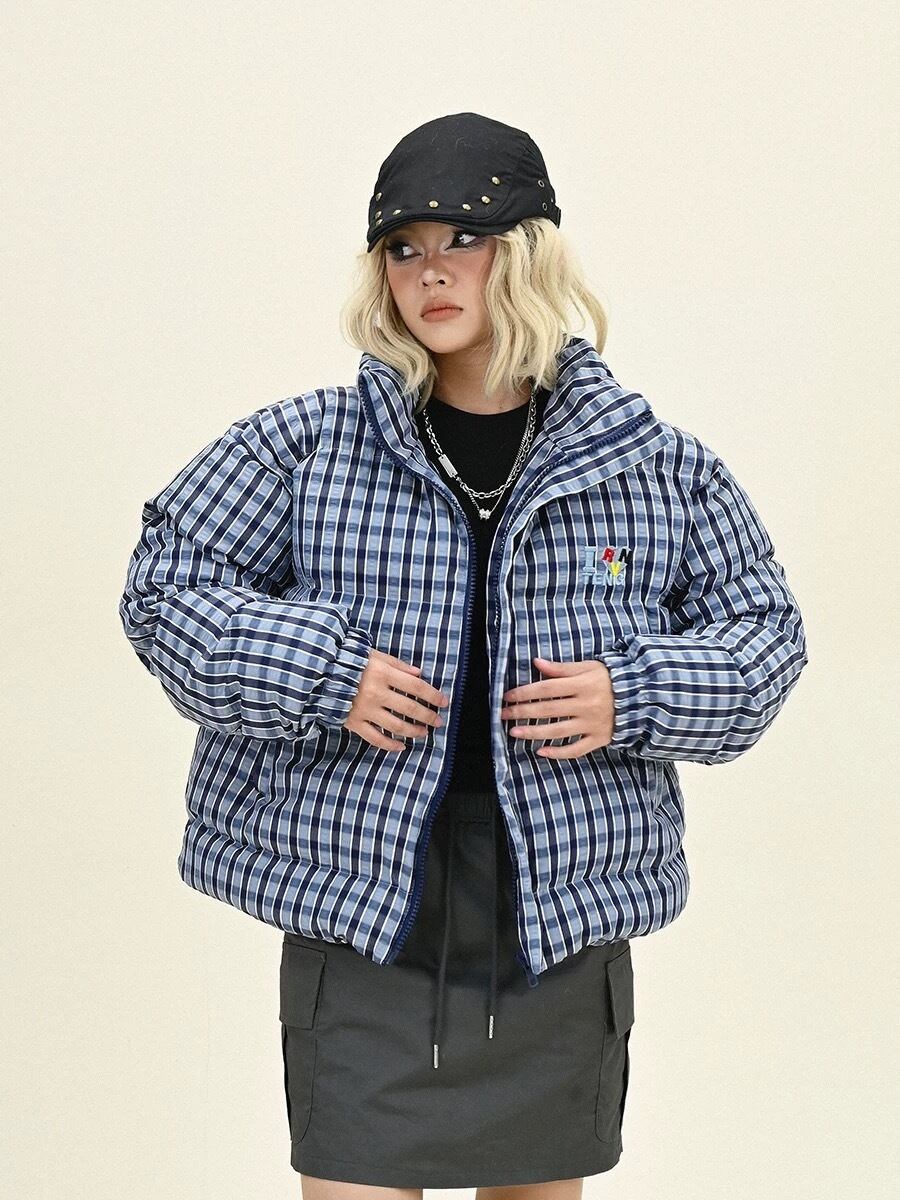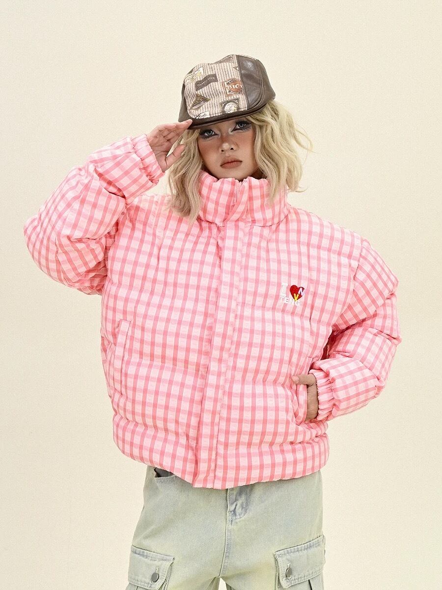 ダウンコート チェック ピンク ネイビー フード