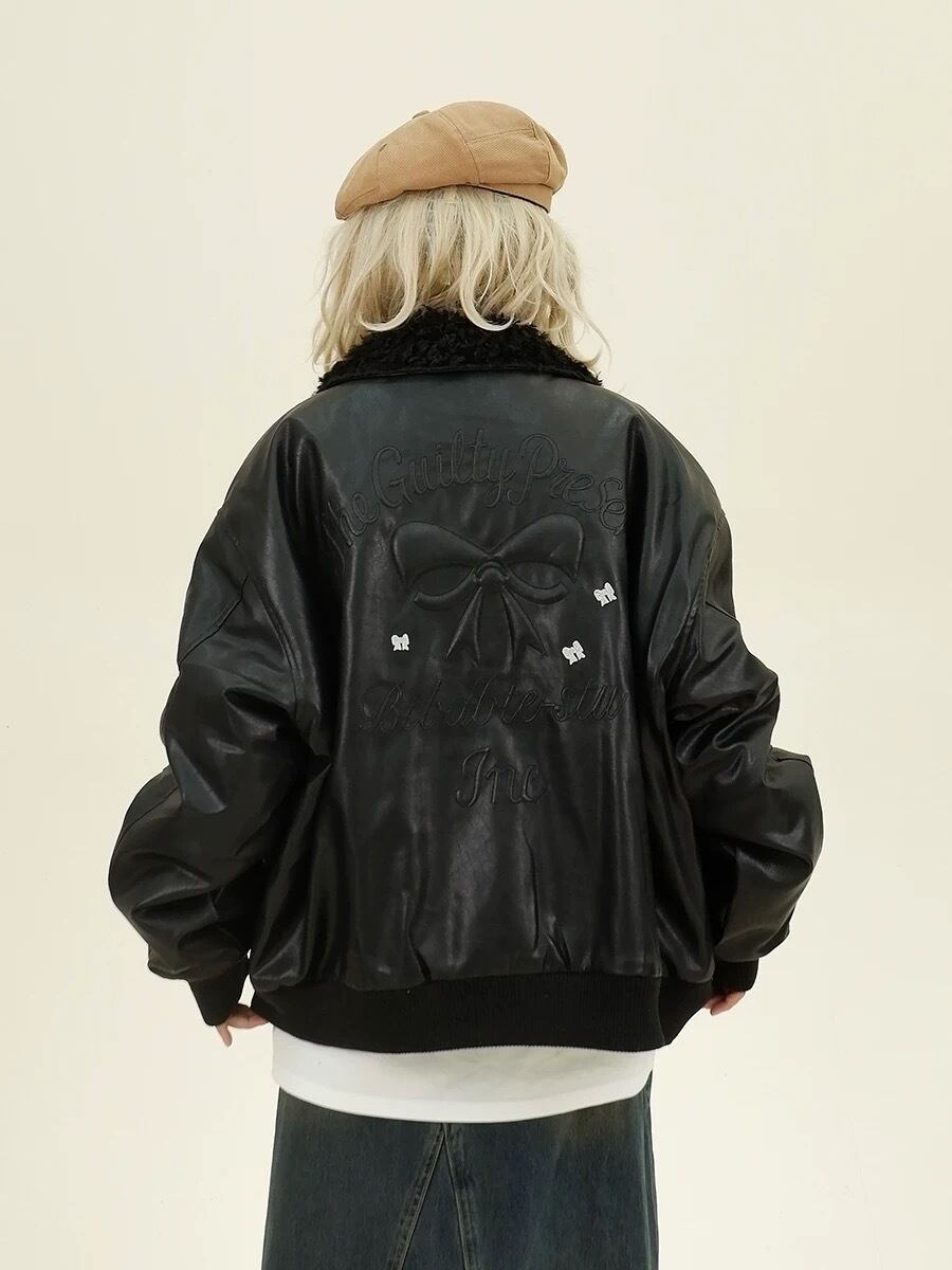黒 ジャケット ジャンパー リボン レザー風 ハイネック